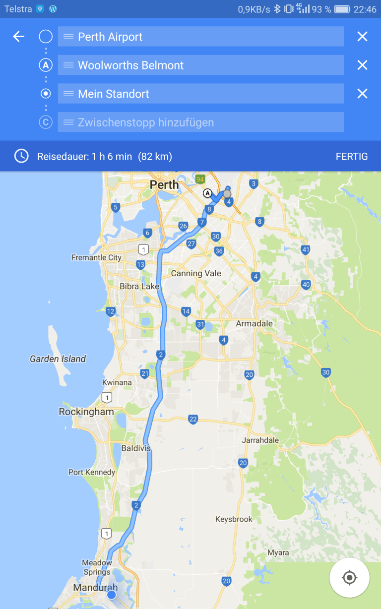 2 hours Woolworths, basic resources. Then south. We listen to Harry Potter, Der Stein der Weisen. Car has Bluetooth Audio, even better.