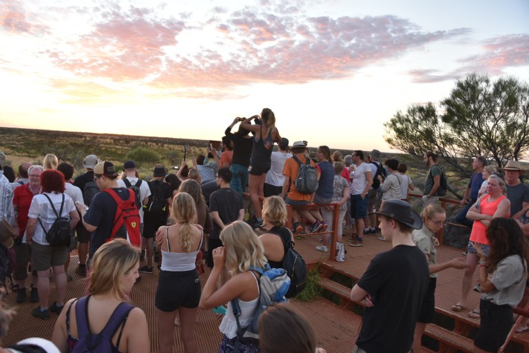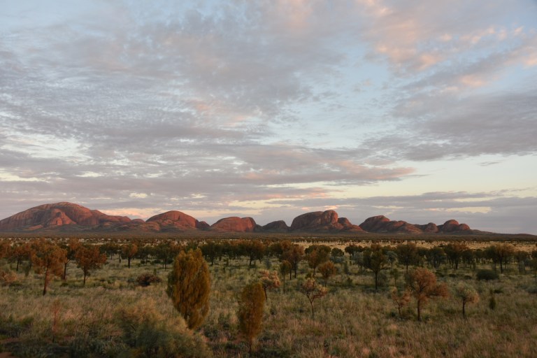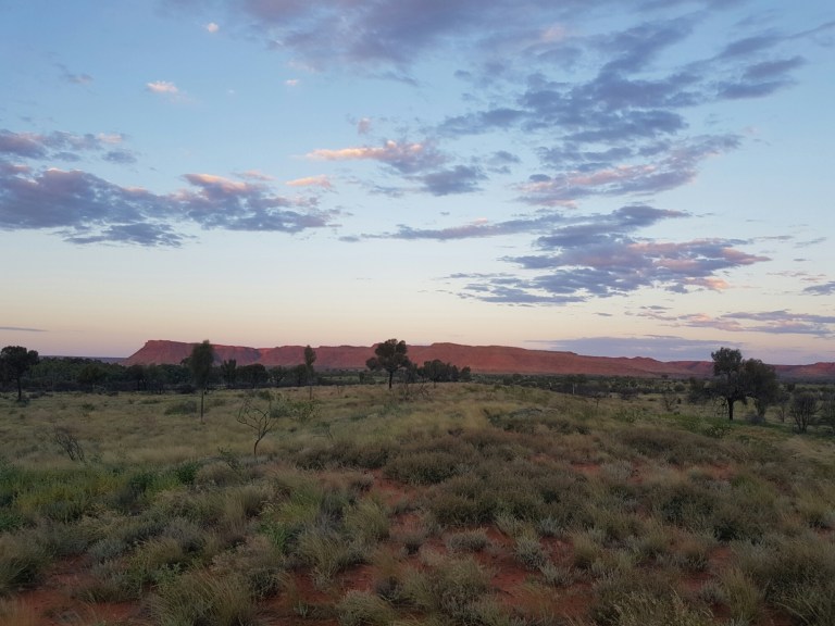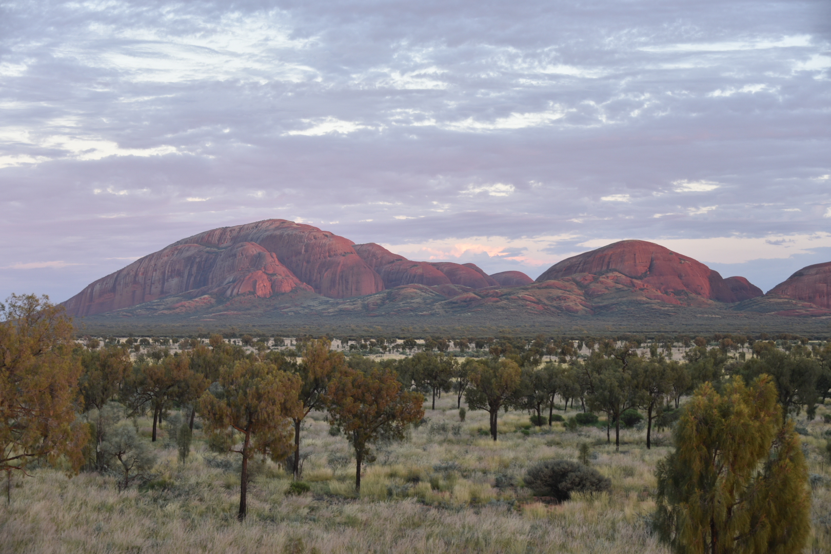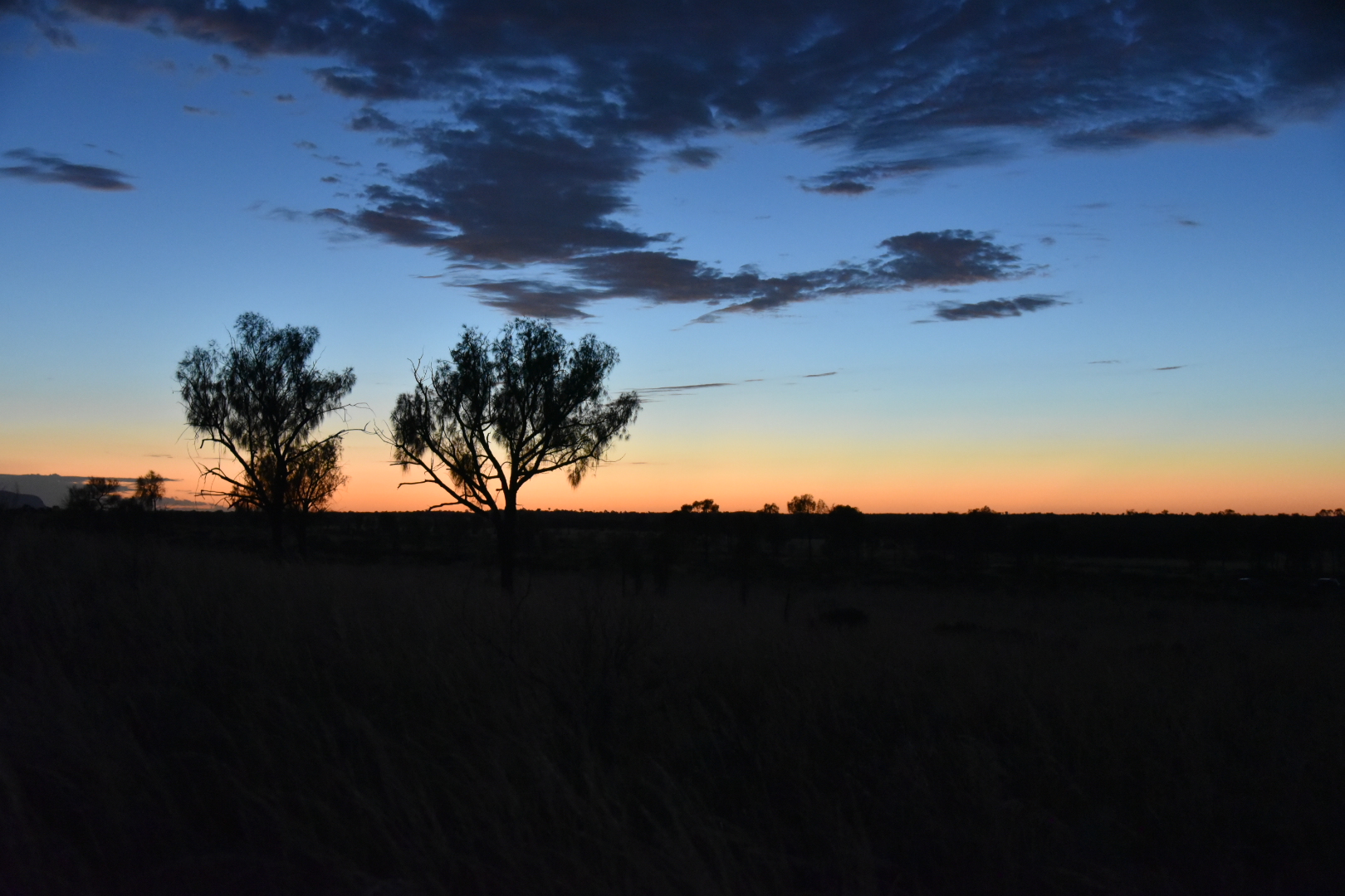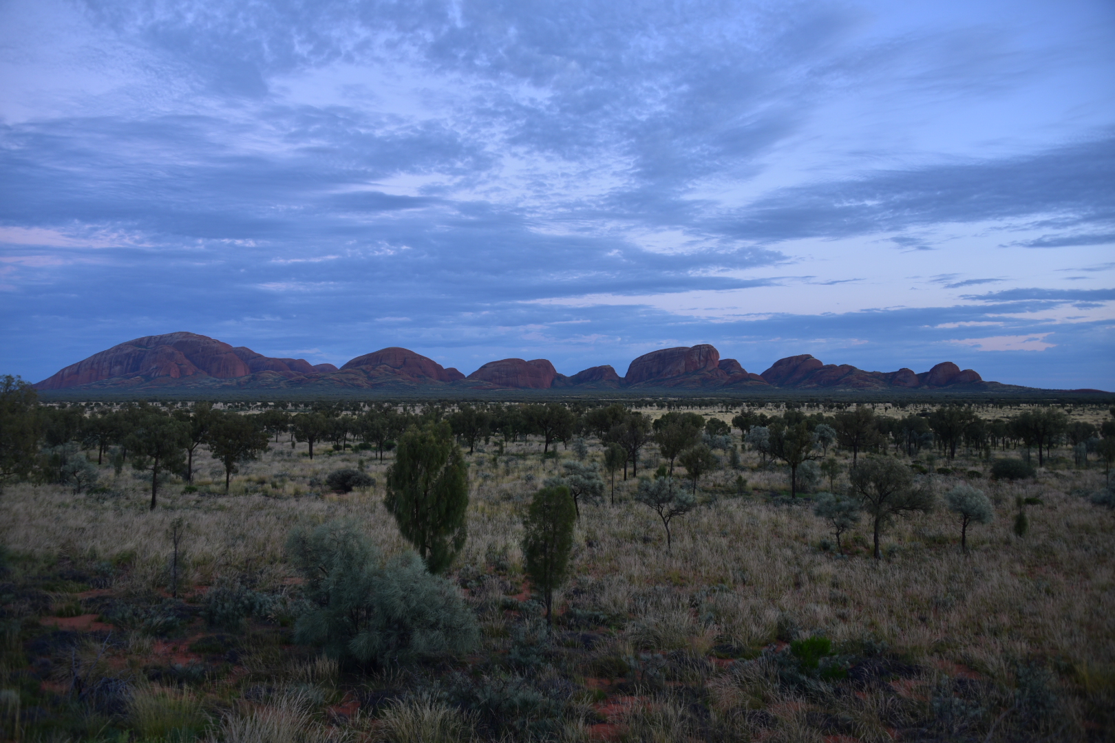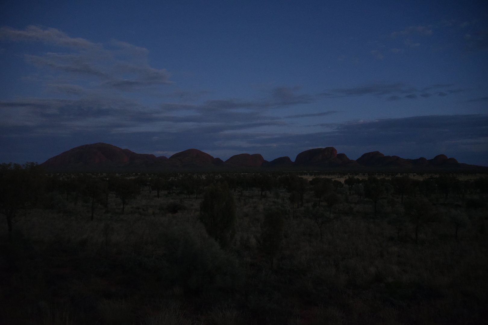 February 13th, Ayers Rock Campground. According to the recommendation of the receptionist we go for sunrise at the olgas dune viewing are. We are not alone. You have to be at the park gate at 5:00 am. We are second. Behind us the busses come.