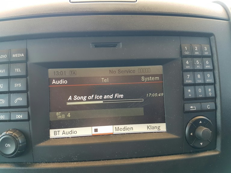 Good luck we have bluetooth in the car and an audio book we have listened only 44 hours by now and still 156 hours left. This will keep us awake. Go khaleesi, go.