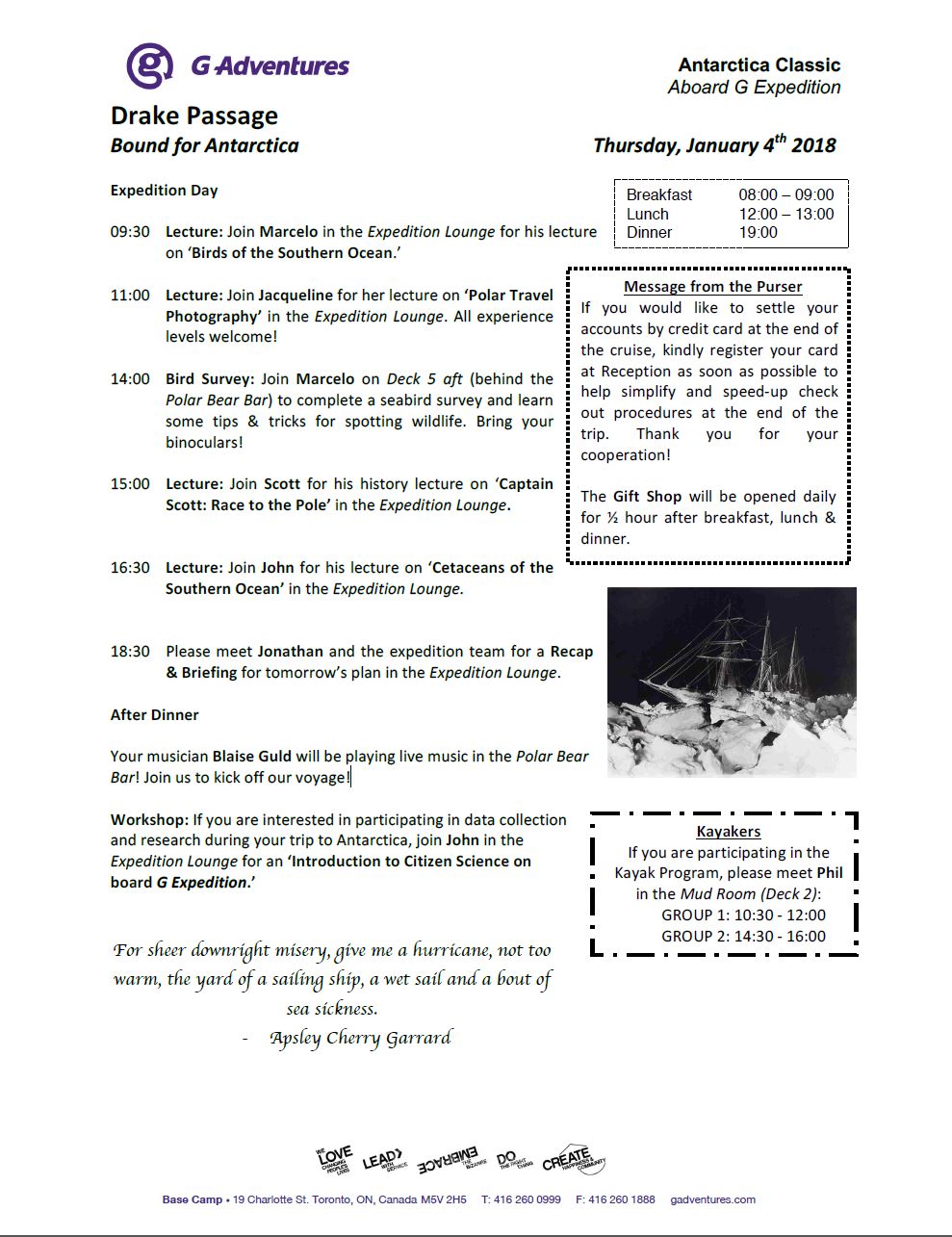 Itinerary for the third day: “The adventure begins with an 800km (497mi) crossing of the passage named in honour of the 16th-century English sea captain and privateer, Sir Francis Drake. Take in daily lectures from the expedition team and keep an eye out for the first sightings of icebergs, whales and albatross following in the G Expedition’s wake.”
