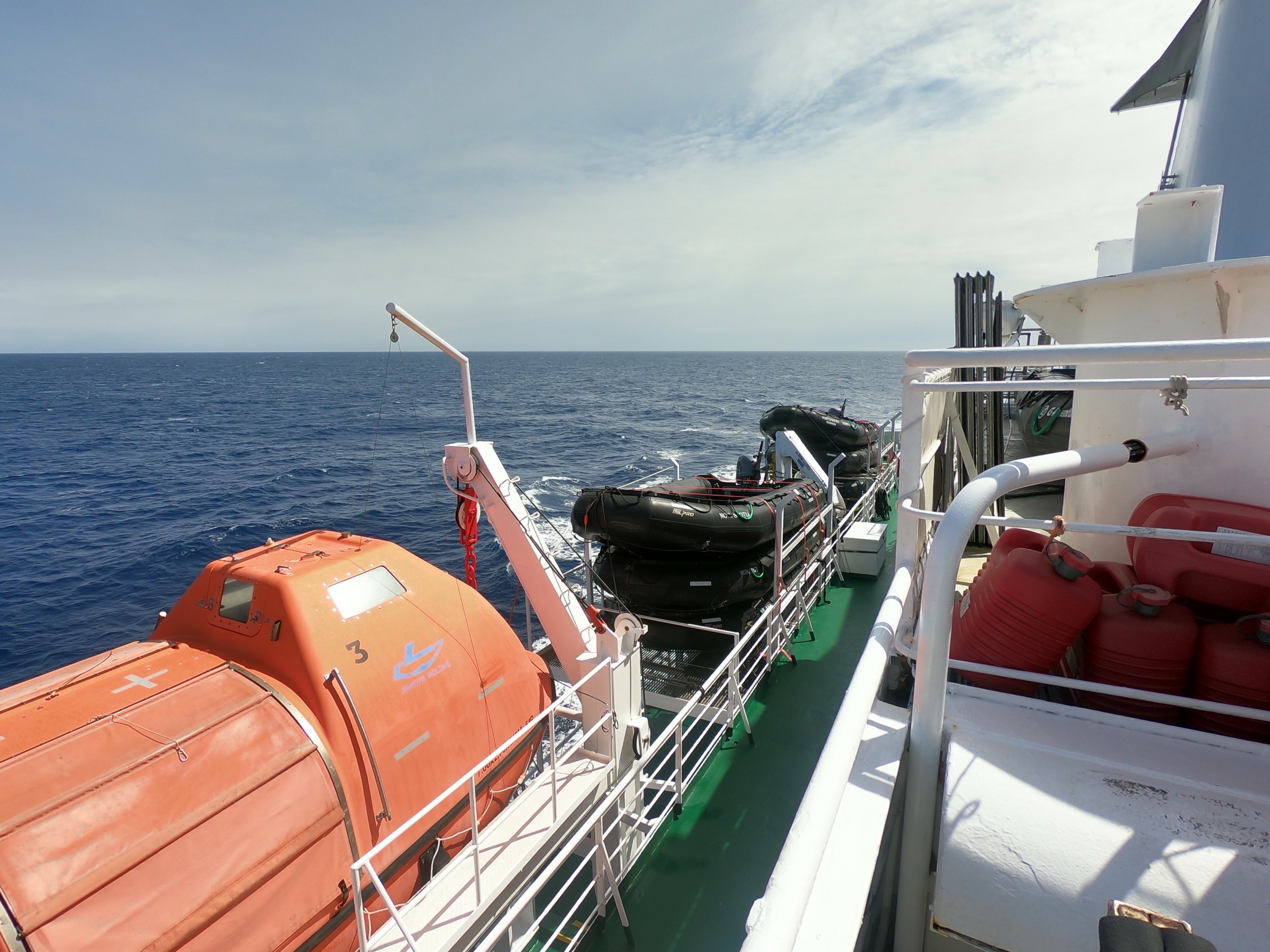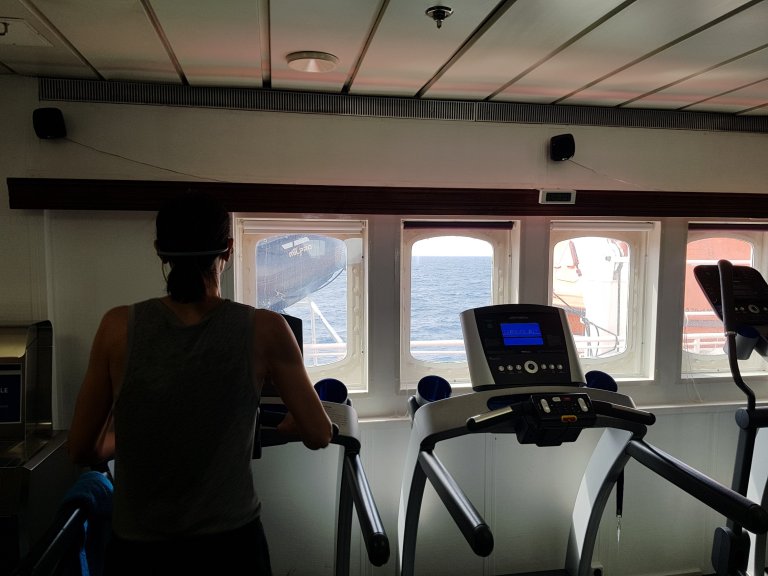 I tried the threadmill on the boat. It stands in 90° to the driving direction. If waves get stronger, this makes it funny to run up and down in the rythm of the waves. Christina does afterwards. Nice view on the ocean.