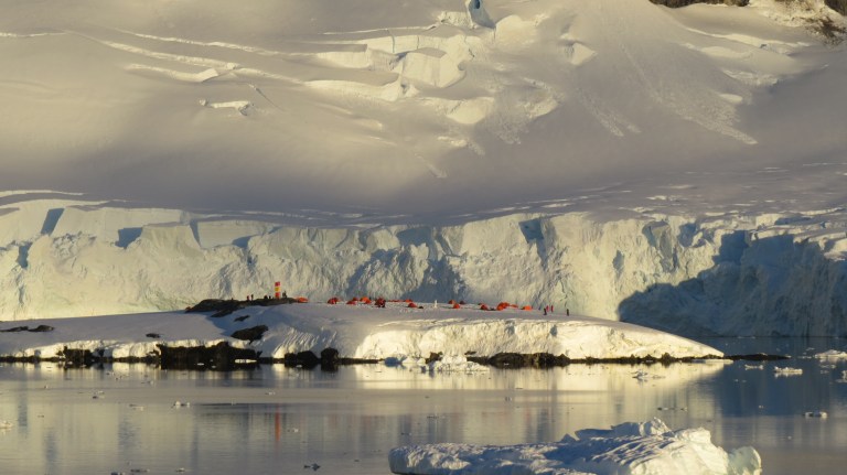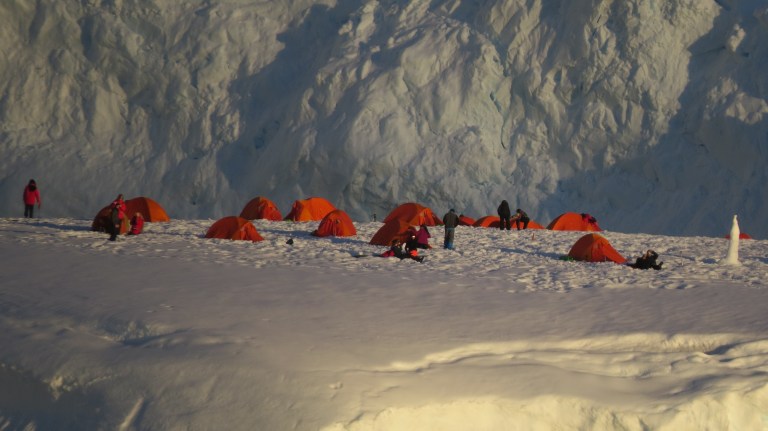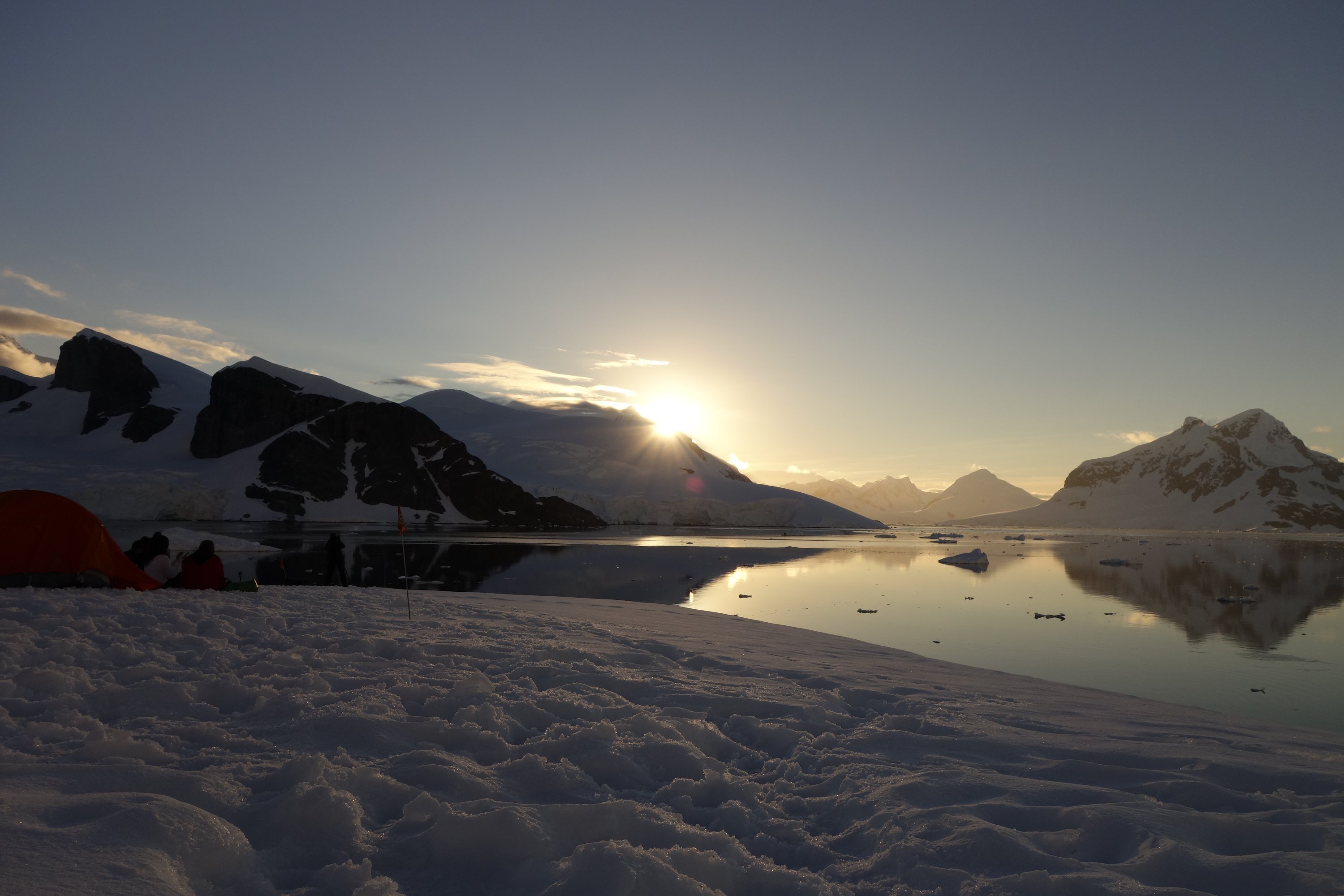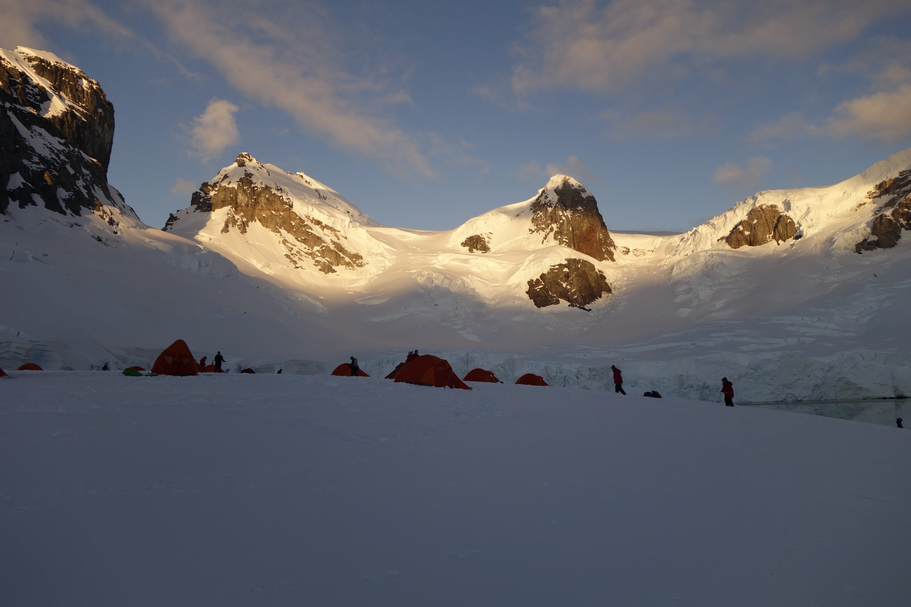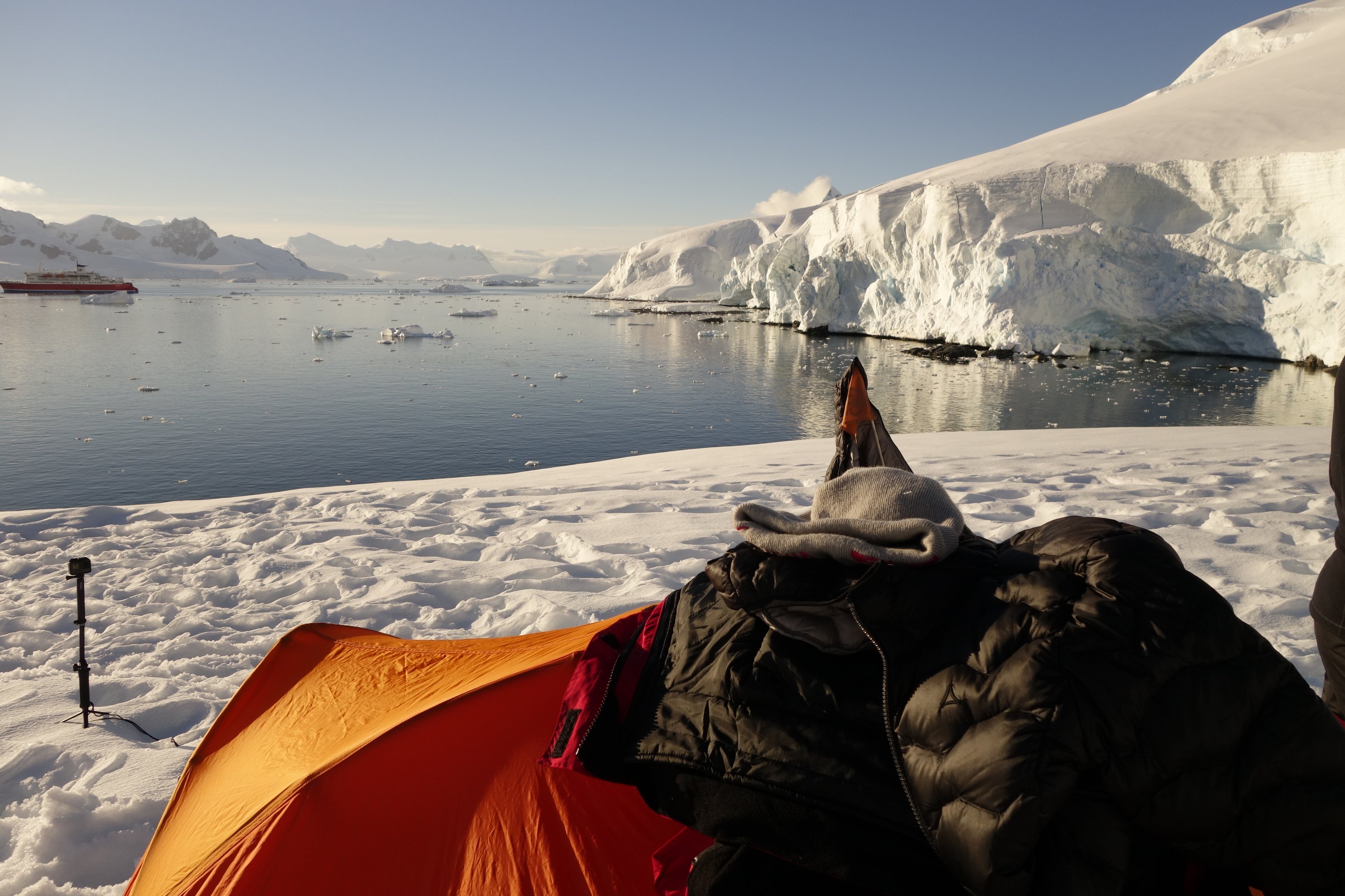 Evening plan is to cross to main land in the zodiacs with the camping equipment, set up our tents in the ice and sleep on Antarctica. We get again a short introduction in tent setup, dress up the as much of the warmest stuff we have (I wear 5 layers on upper body, 4 layers on legs, 3 pairs of socks – if a penguin wants to eat me, he will die of starvation while unwrapping me), grab our tents, isolation mats, polar sleeping bags and of we go to the campsite.