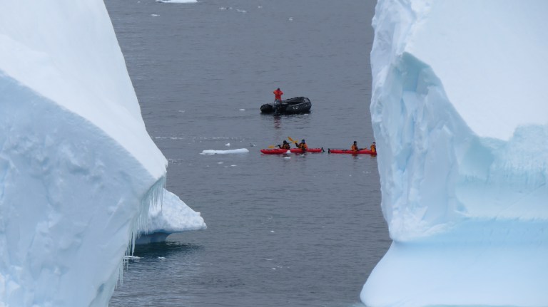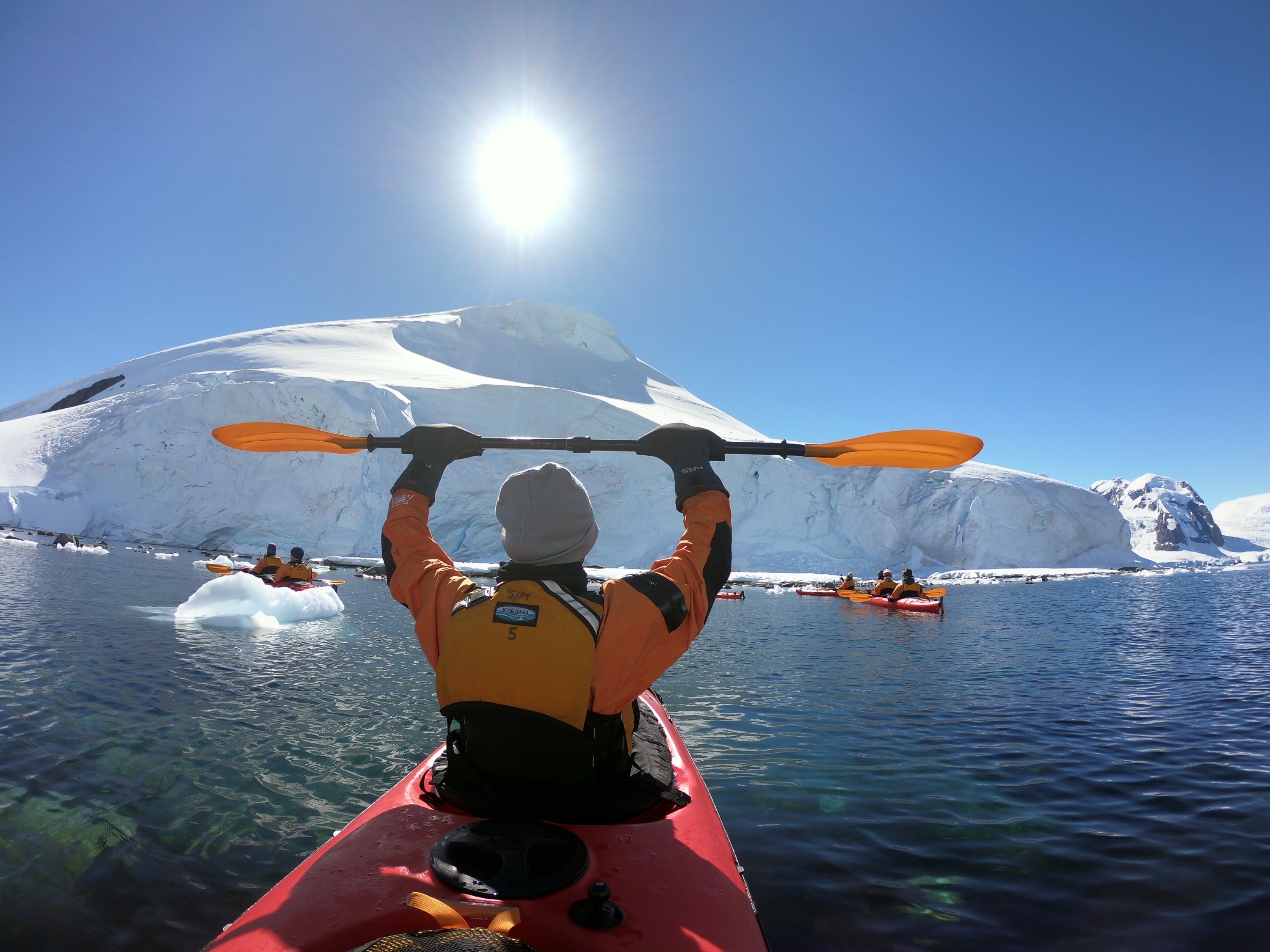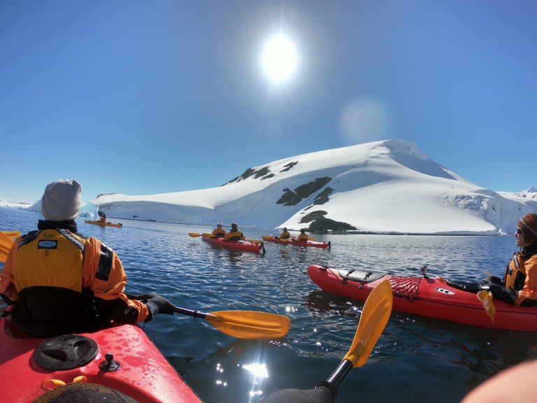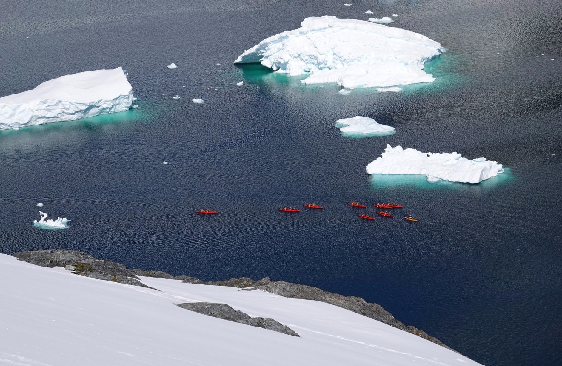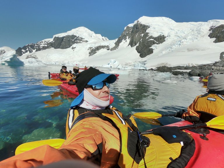 So, plan for Cuverville Island is to go on land, climb the top of a hill of some 100 masl (they say). Since wind is calm, it is blue sky, we try again to go out for kayaking before lunch.