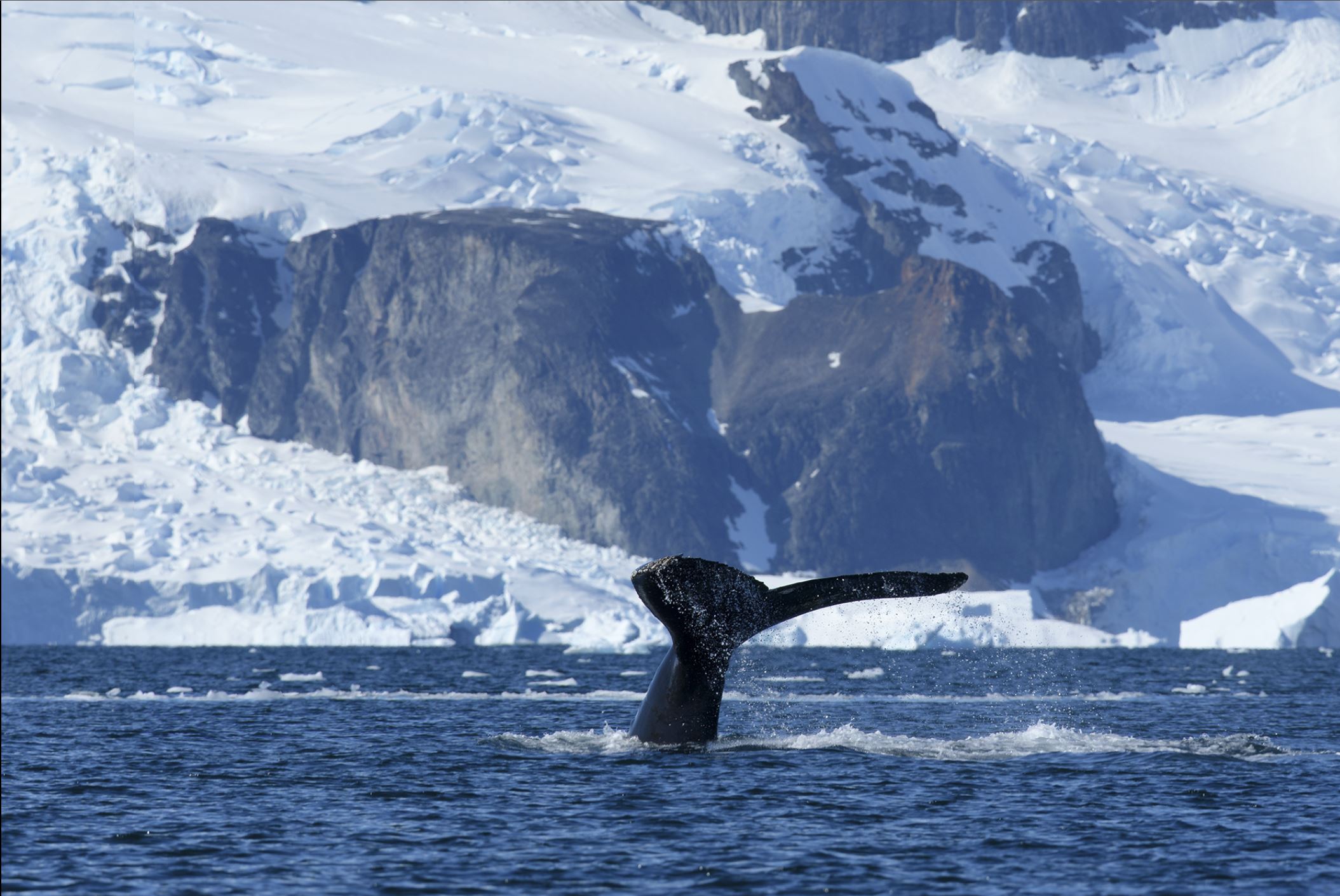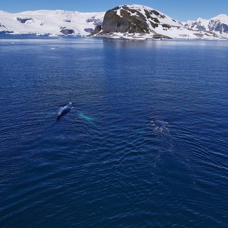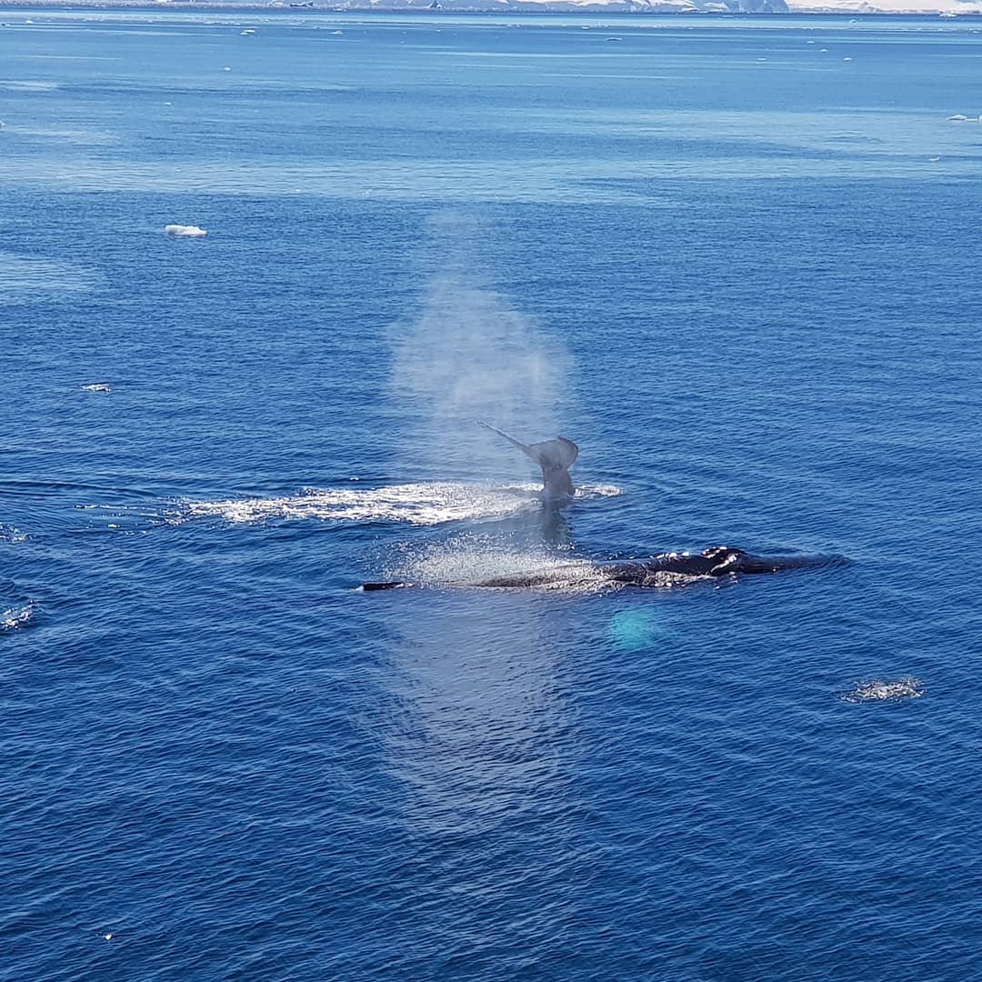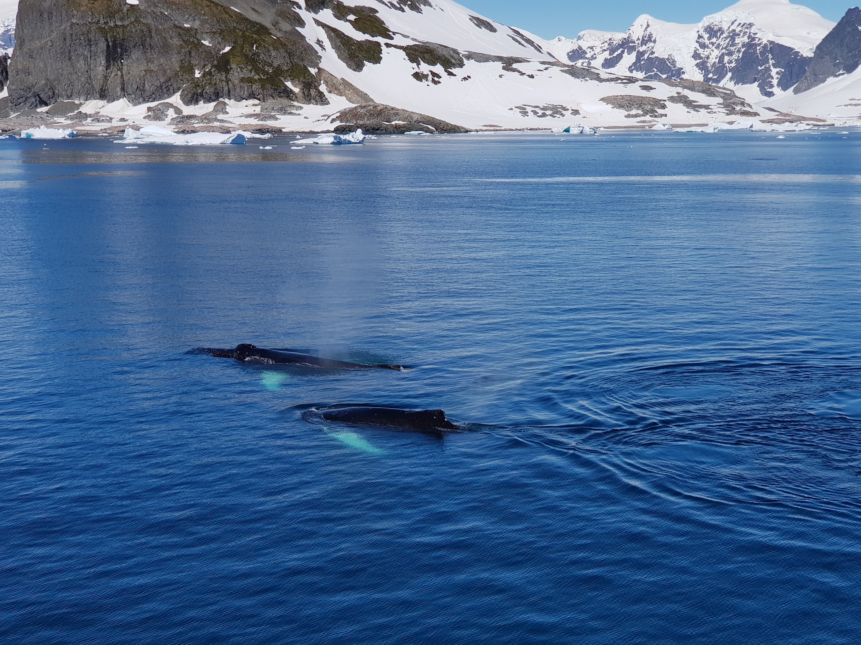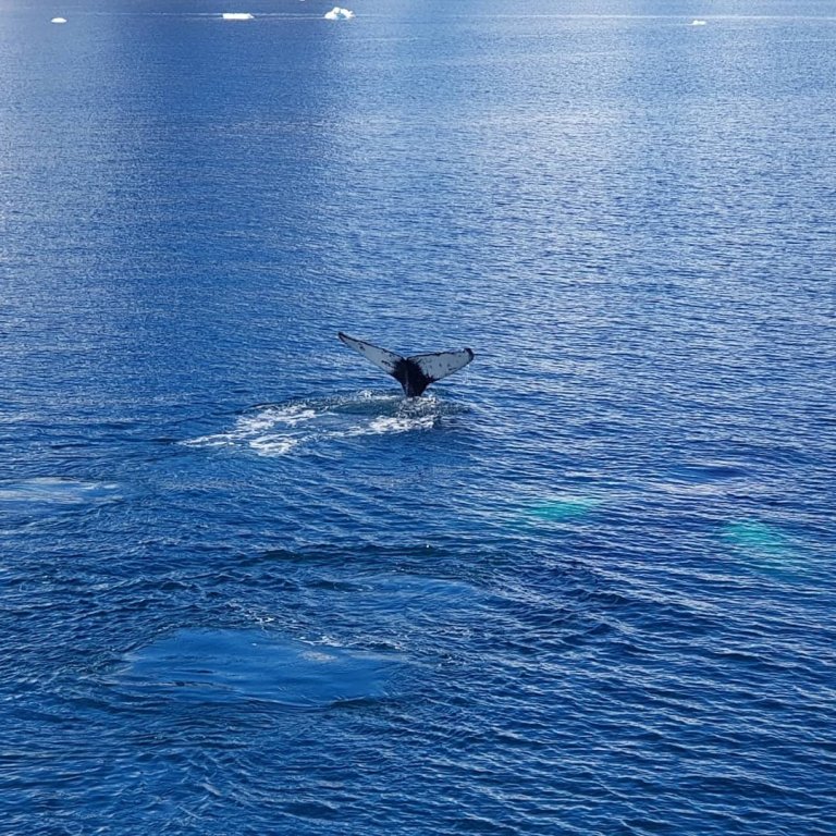 At lunch there is riot as a bunch of humpback whales show up around the ship continously, coming up for breathing (blowing out fountains). After blowing out they slowly dive down again with tail fin up. Everybody sacrifices creme brulee and runs for the camera.