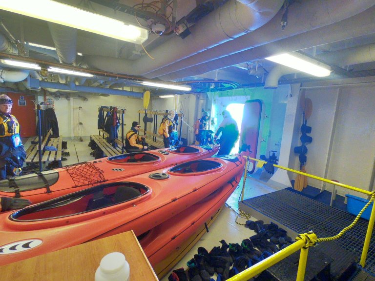Since the first day we are divided up in “Zodiac groups“, named with a penguin species. I am a Macaroni (All the kayakers are, we made Heather and Ben Macaronis, too). If we go for an expedition, all passengers are called from John via intercom by “Zodiac Group”. Therefore everybody has enough space to change to expedition gear in the mudroom. Usually all Zodiac groups go out at the both side doors of the mudroom, quickly after each other. That is one of the reasons why we have chosen the G Expedition. No other boat has enough Zodiacs available to bring all passengers at once to the waters (14 ! by 12 passengers and 134 passengers on the G Expedition at all).