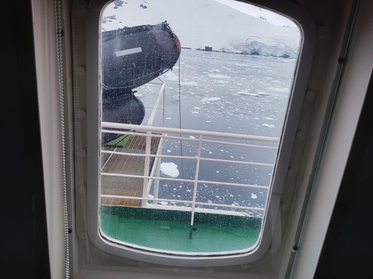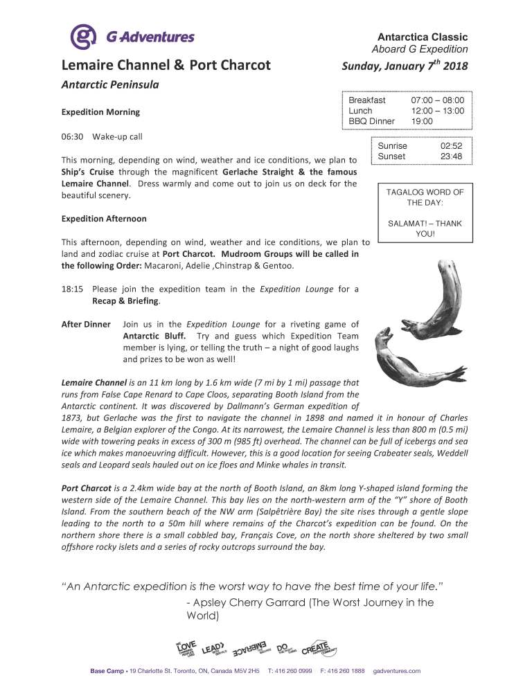 “Good morning … good morning Ladies and Gentlemen! Today is Sunday, seventh of January 2018. Local time 6:30 am. Expedition is currently at anchor in leaf harbor, nice bay. Our position 64 degrees 41 minutes south, 62 degrees 49 minutes west. Sea state is dead flat calm. Skys are overcast, visibility is good. 3 nautical miles this morning. Outside temperature minus 2 degrees Celsius, 29 degrees Fahrenheit. Winds: allow 2 to 4 knots from the north, northeast, the barometer has fallen slightly, no reasons for concern this moment. Breakfast will be served in half an hour at 7 o’clock. A very good morning to all.”