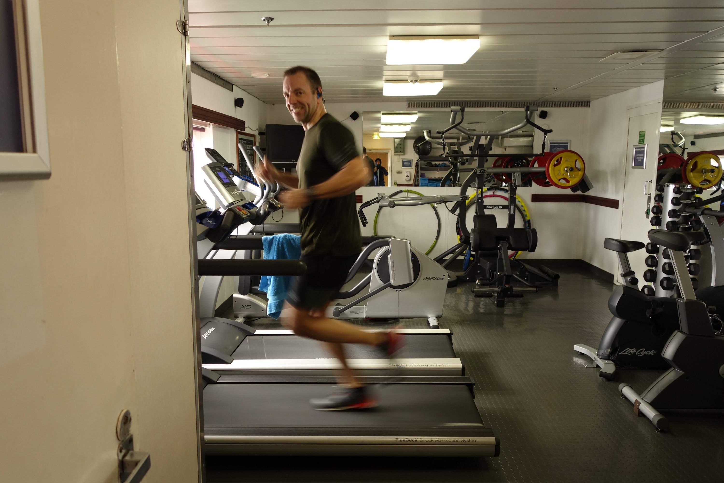 While the other passengers get drunk from rum and cold outside, I decide to use the gym and go for a 10k run. What do you see if you run? Icebergs?