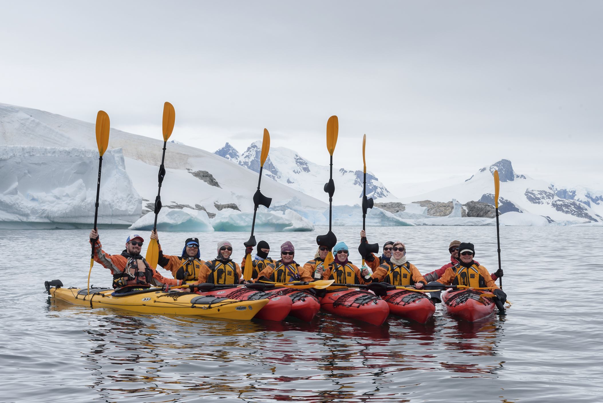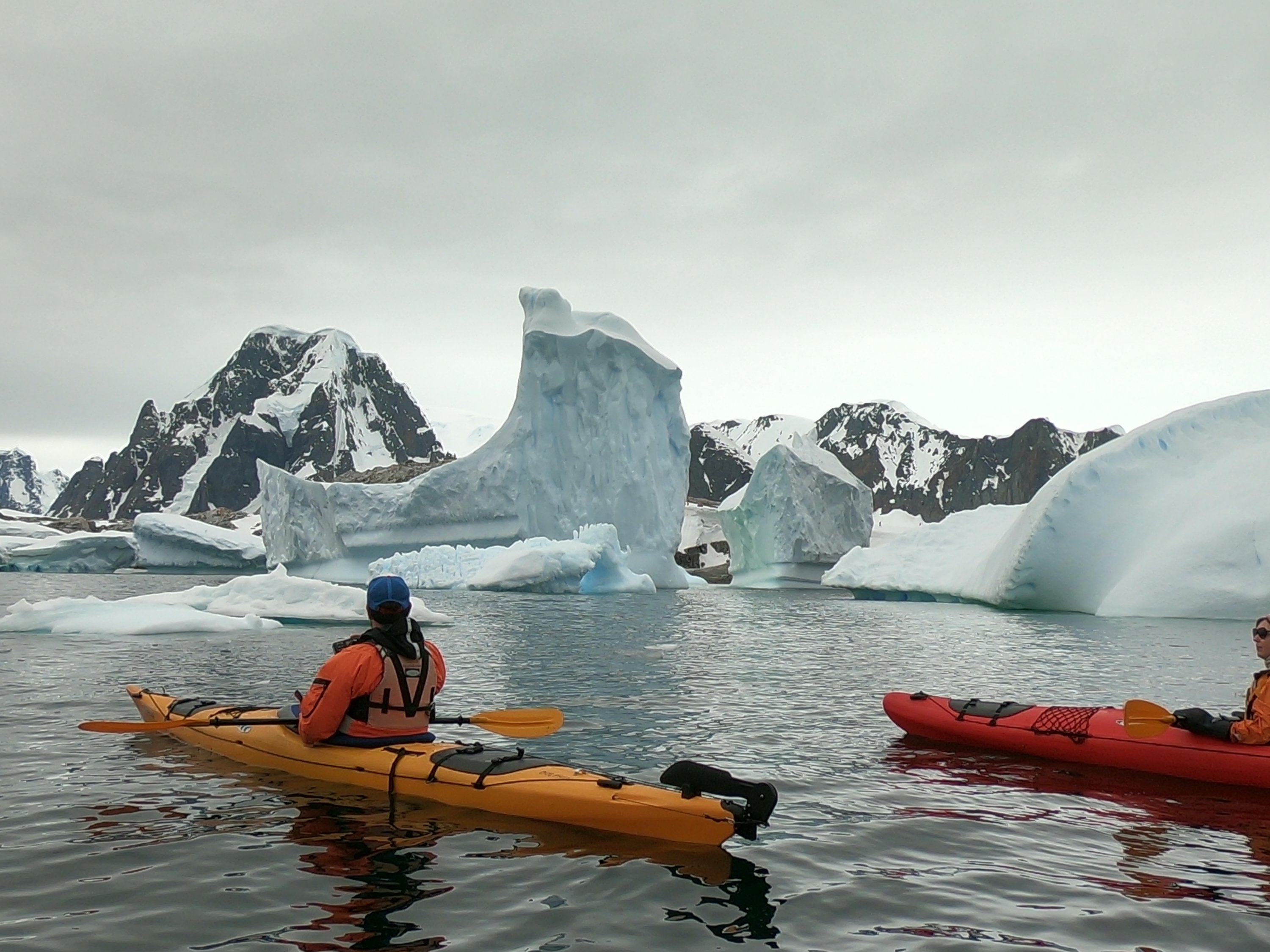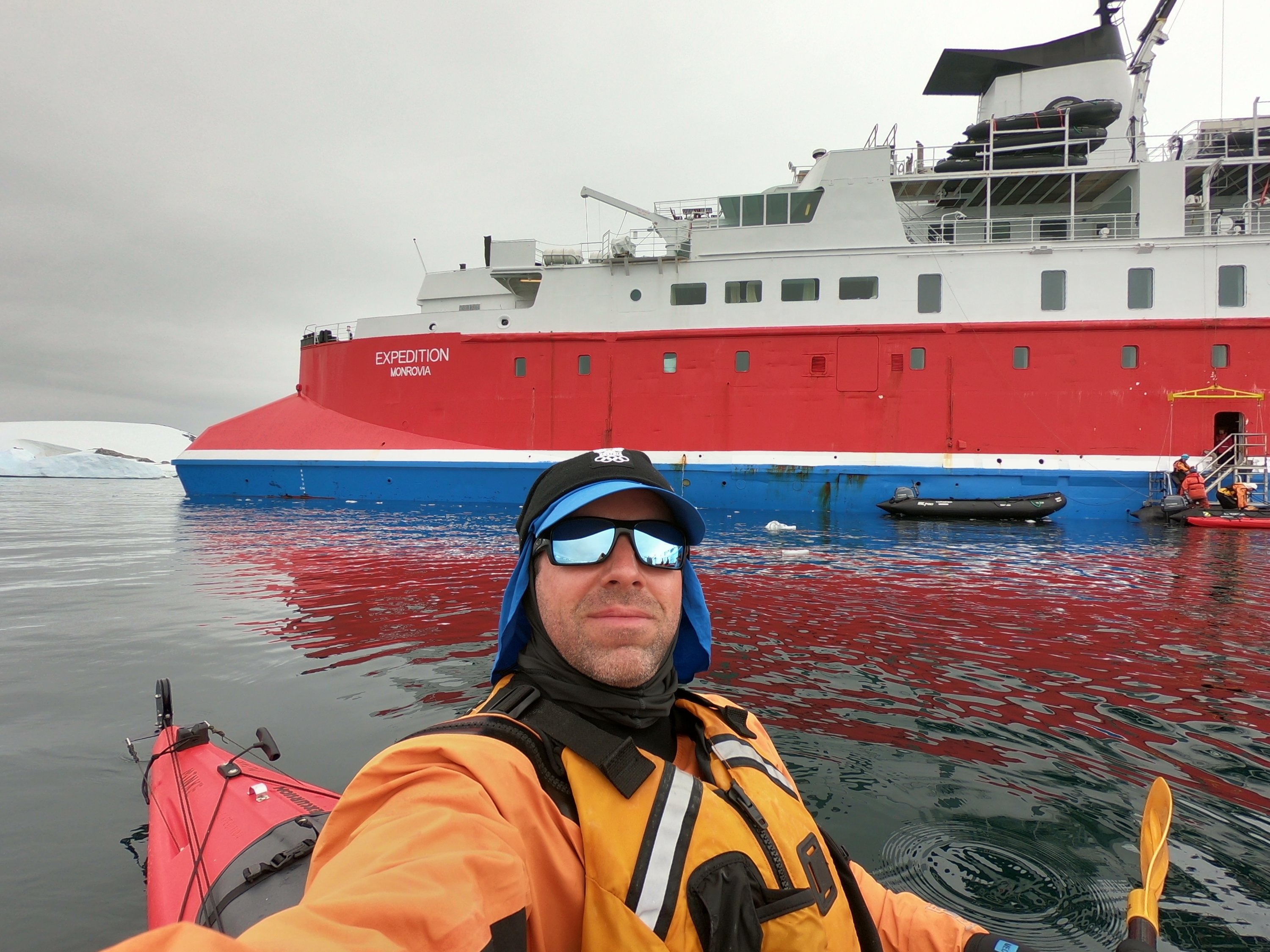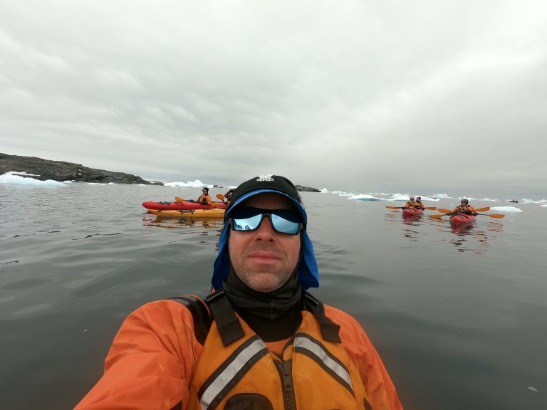 The Zodiac land cruise would be an abandoned antarctic station and a walk on a 40 m hill. The kajaker will circle around the close by island. We do 10k kayaking (the stretching and upper body part of todays training). We see lots of swimming penguins, minky whales and lazy seals on ice schelfs.