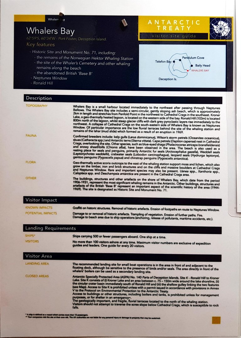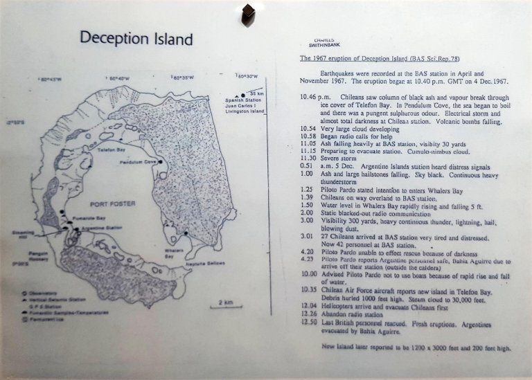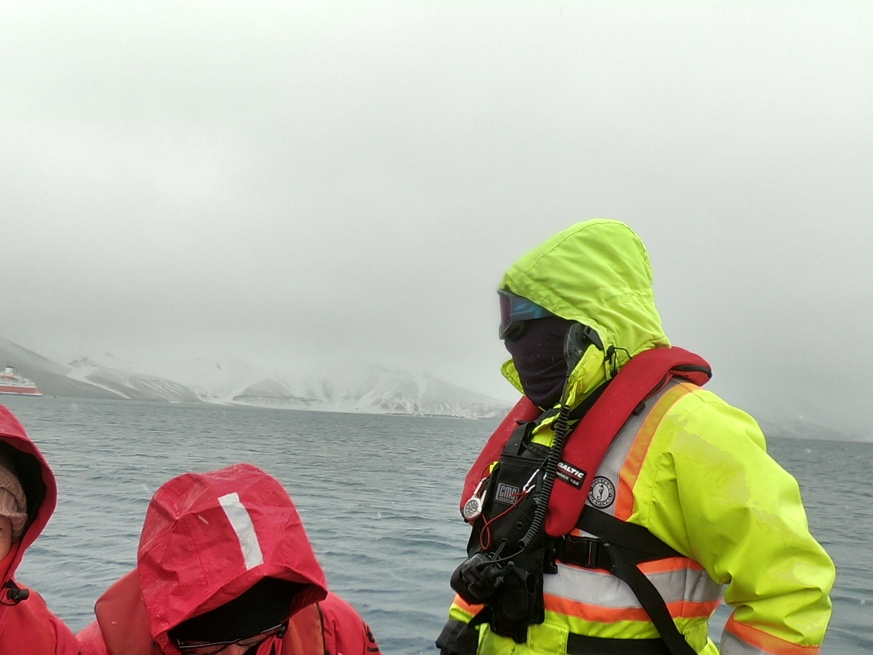 Transcript: “Good morning … good morning Ladies and Gentlemen! Today is Tuesday, 9th January 2018. Local time 07:00 am. The expedition is currently crossing the Bransfield street towards the south shetlands. Our position 63°09 South, 60°36 West. Seastate is moderate, skies overcast, visibility around 3 nautical miles and there is sleet falling at this moment. Outside temperature 1°Celsius 34° Fahrenheit. Winds steady 30 to 35 knots, dusting 40 from the Northeast. Twells around 2 meters from the northeast. Bows are closed at this moment. Please donot try to access the Bows as we are taking waves, an considerable amount of water over the bows themselfs. Outer decks are slippery. Caution advised if you do access the outer decks as strong gusting winds can knock you over. Breakfast will be served in half an hour 7:30. We expect to entering the bays of Deception island around 8 am. A very good morning to all.”