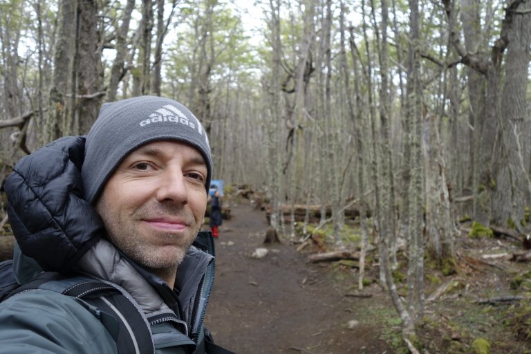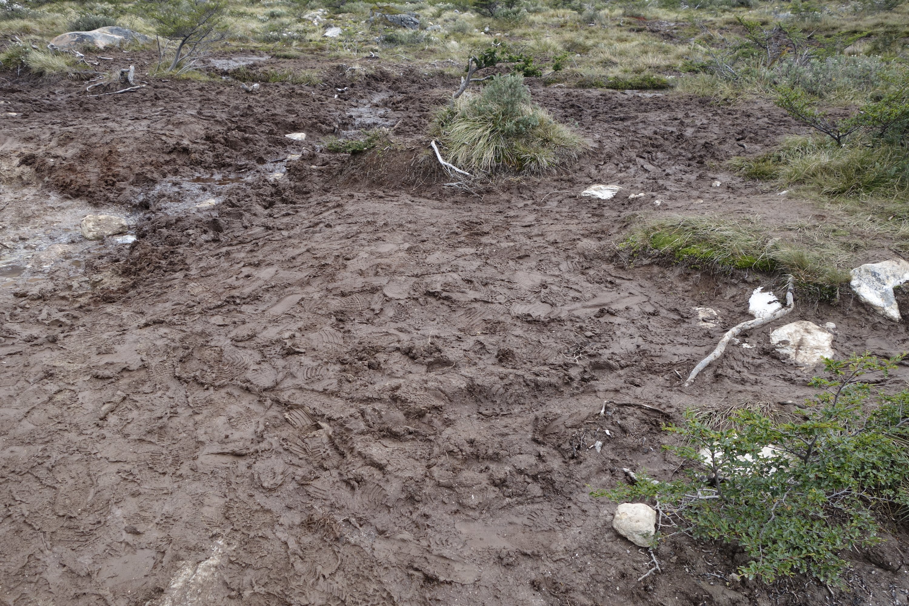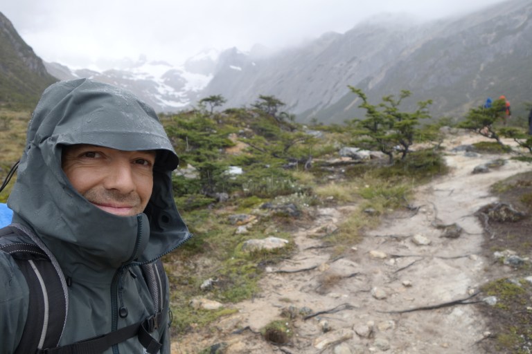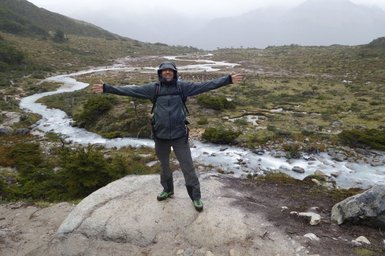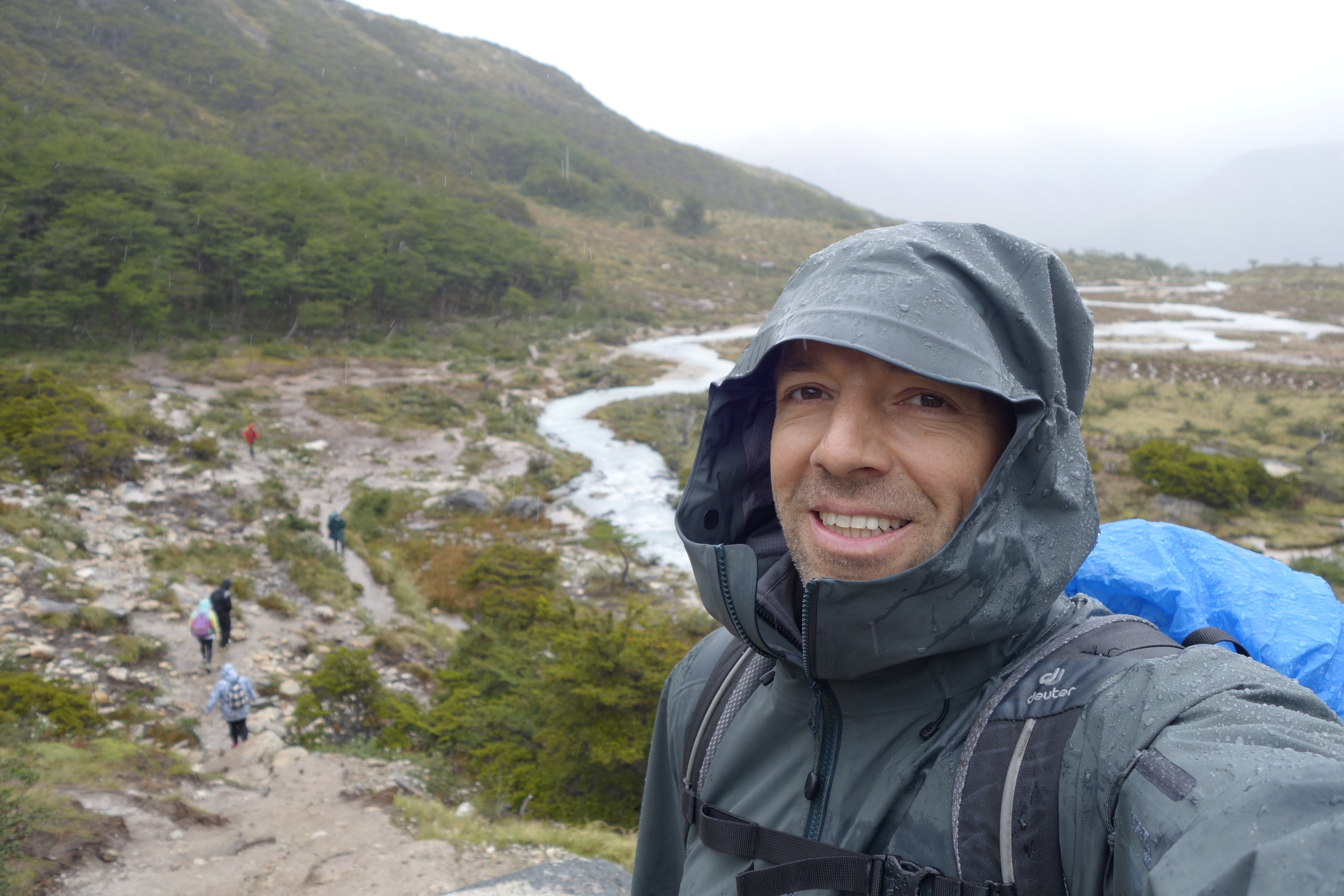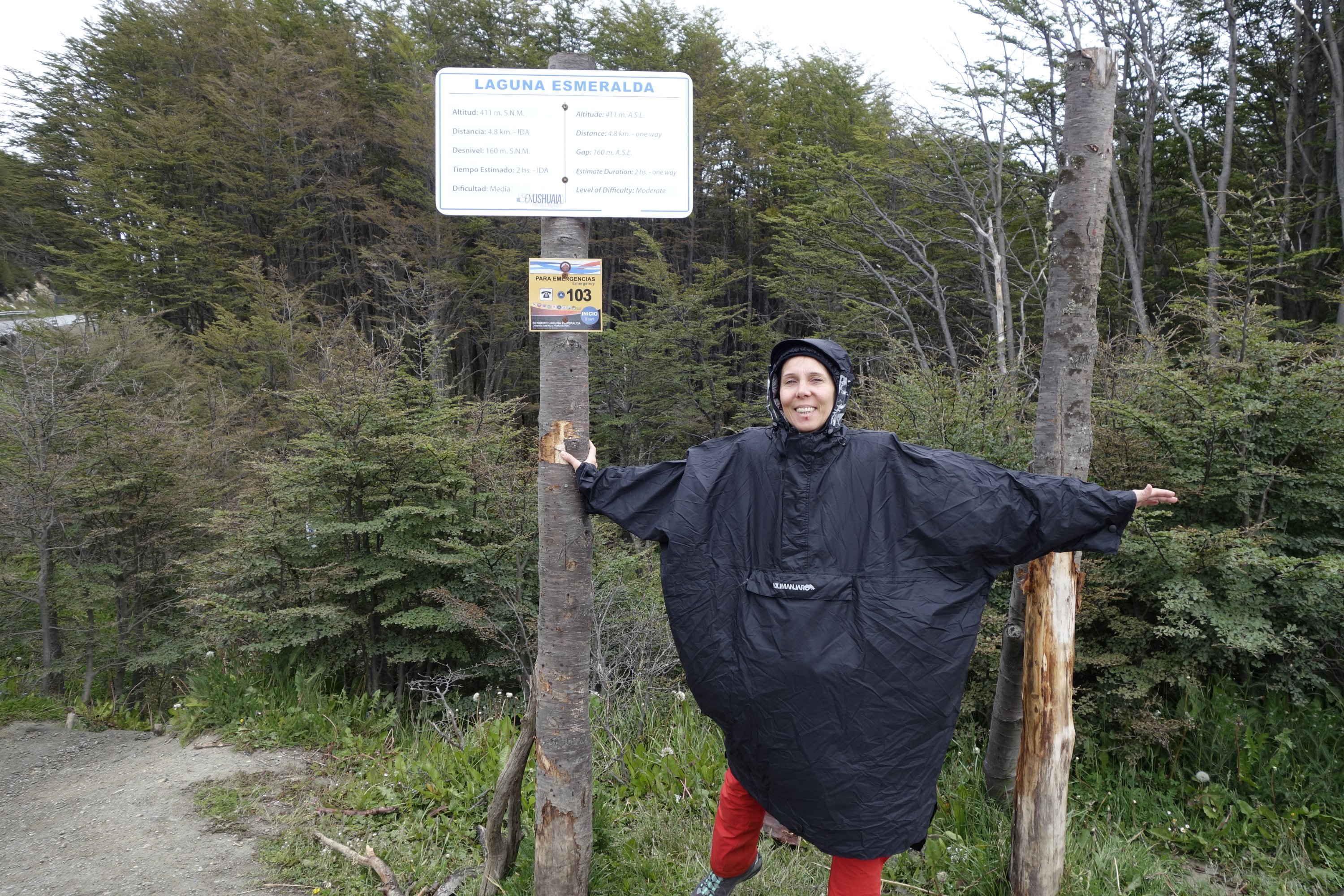 After some discussions yesterday, the receptionist ordered a transport (a taxi) to the entry to laguna esmeralda for us at 10:00 am. A small lady with absolutely no english capabilities in a small chrysler from the last century picks us up on time. Somehow the steering wheel is absolutely oversized. She drives us through a police control to a parking lot at nirwana forest and points to a hole in the forest. With pen and paper we negotiate a pickup time in 4hrs30. The price was fixed by the hotel (644 ARS one way, 26 EUR), with hands and feet we agree to pay the total at the end. It is raining, foggy, windy and the forecast is not fine. A sign explains everything: 4.8 kms, 2 hrs walking time: