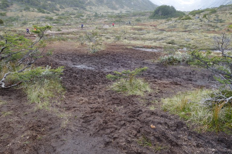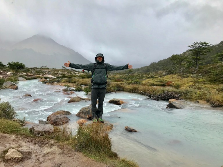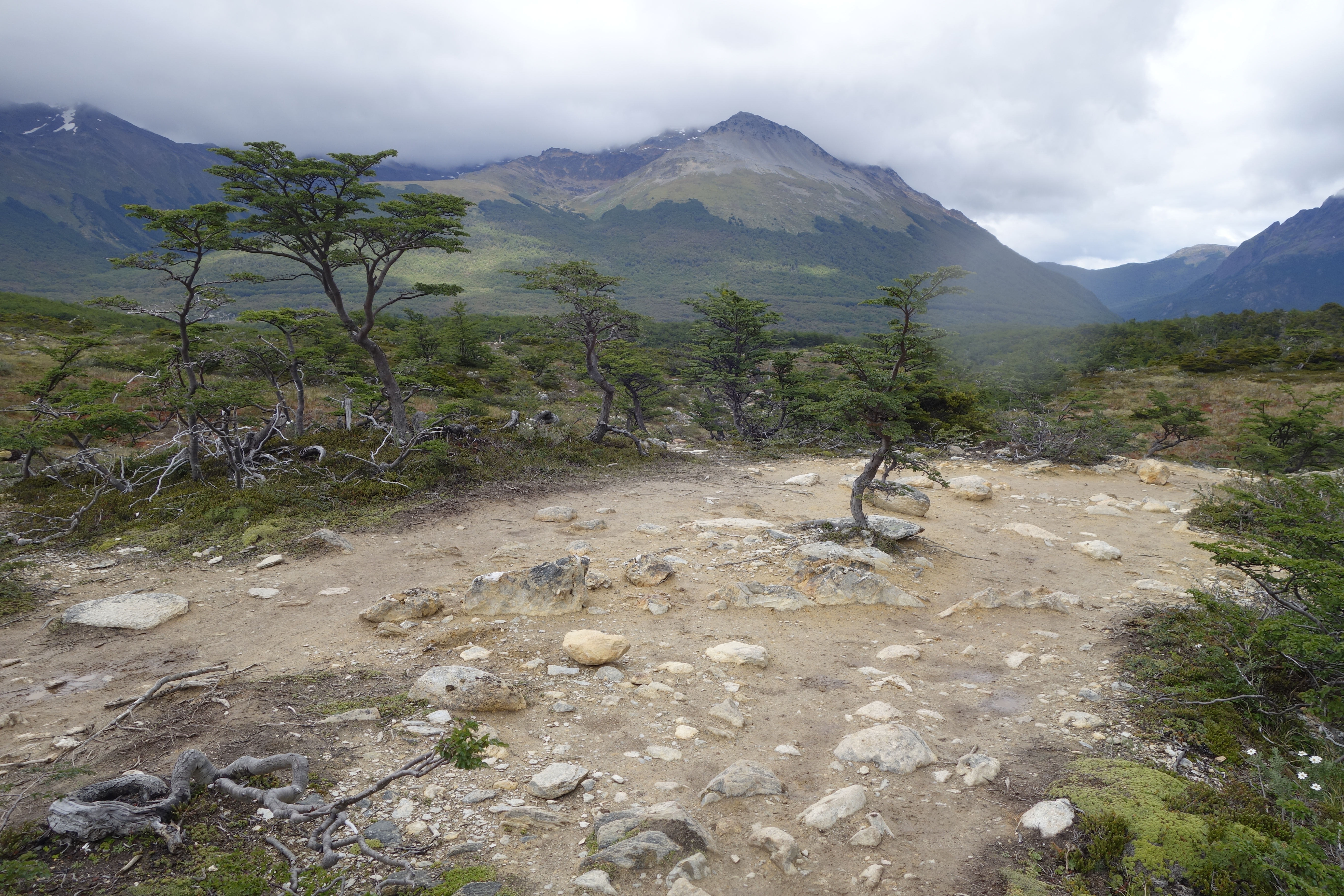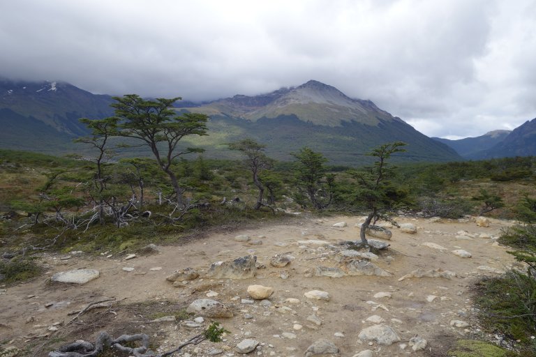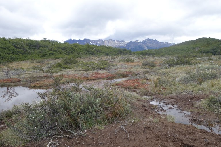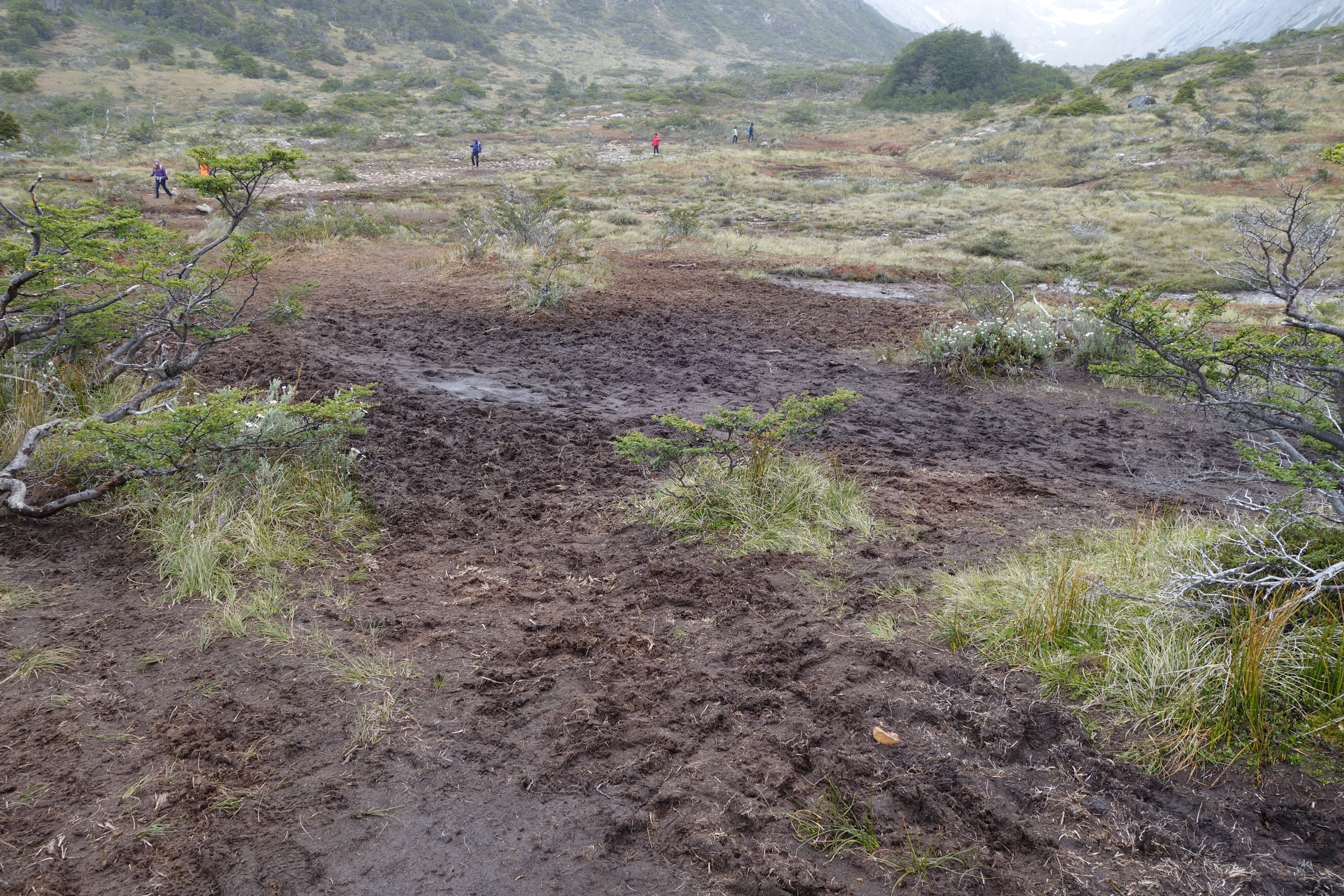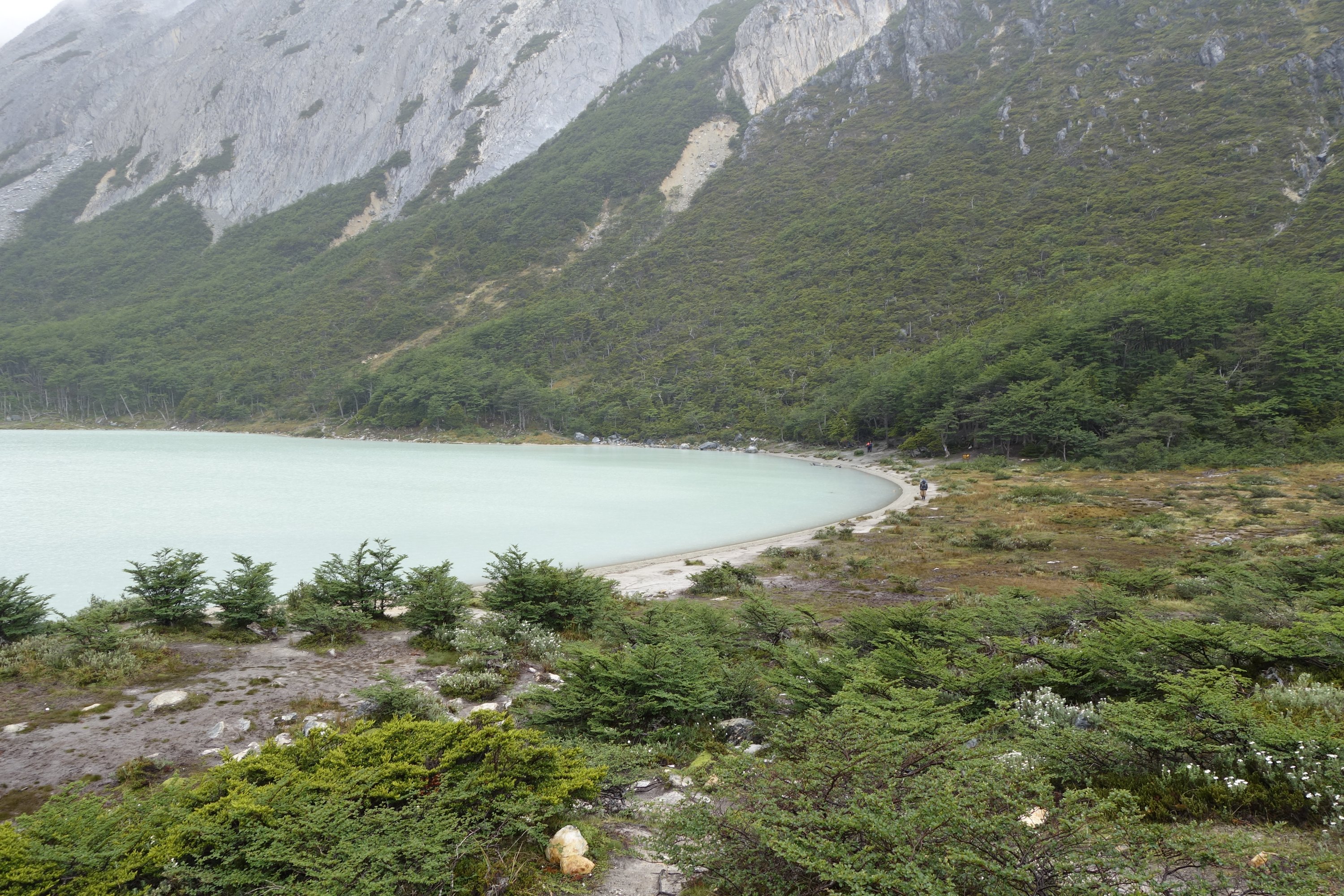 After some discussions yesterday, the receptionist ordered a transport (a taxi) to the entry to laguna esmeralda for us at 10:00 am. A small lady with absolutely no english capabilities in a small chrysler from the last century picks us up on time. Somehow the steering wheel is absolutely oversized. She drives us through a police control to a parking lot at nirwana forest and points to a hole in the forest. With pen and paper we negotiate a pickup time in 4hrs30. The price was fixed by the hotel (644 ARS one way, 26 EUR), with hands and feet we agree to pay the total at the end. It is raining, foggy, windy and the forecast is not fine. A sign explains everything: 4.8 kms, 2 hrs walking time: