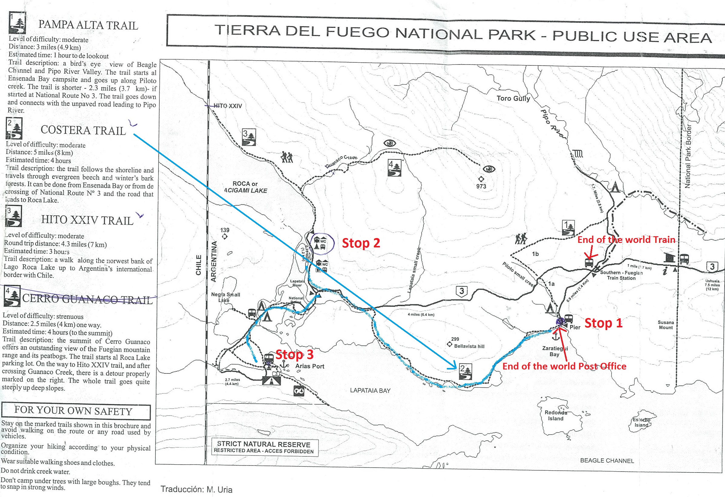 There a smart guy tell us within 60 seconds. if we want to hike Tierra del Fuego National park, we should get the bus now (it is leaving in 5 min next block) and gives us a map of tierra del fuego and walking recommendation (the coastal trail).