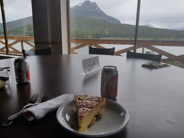 We get breakfast. It didnot get better since yesterday. We get a cheesecake for take away for todays hike and pay the bill. 2 coffebreaks with cakes, dinner and our huge usage of nespresso capsules cost us 2.700 ARS (110 EUR, Ushuaia is super pricy).
