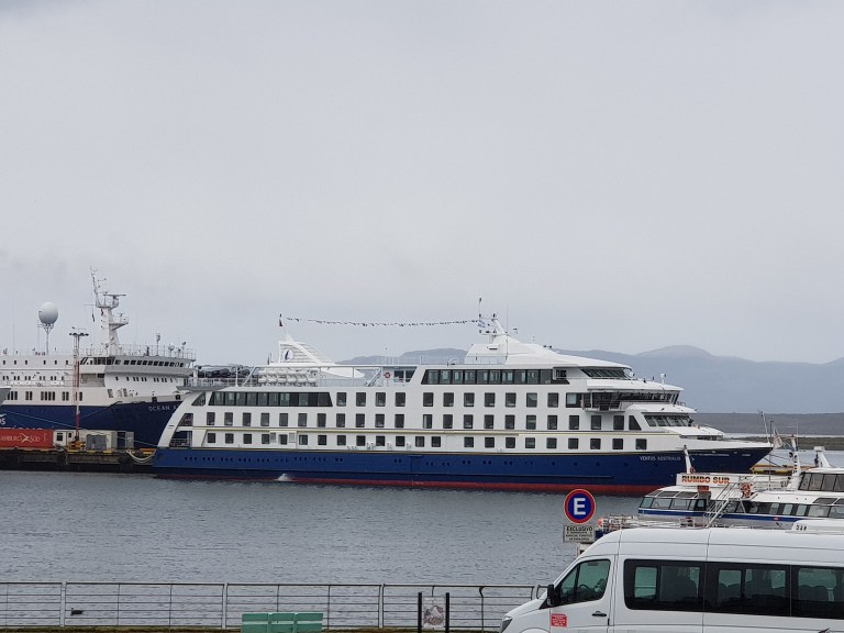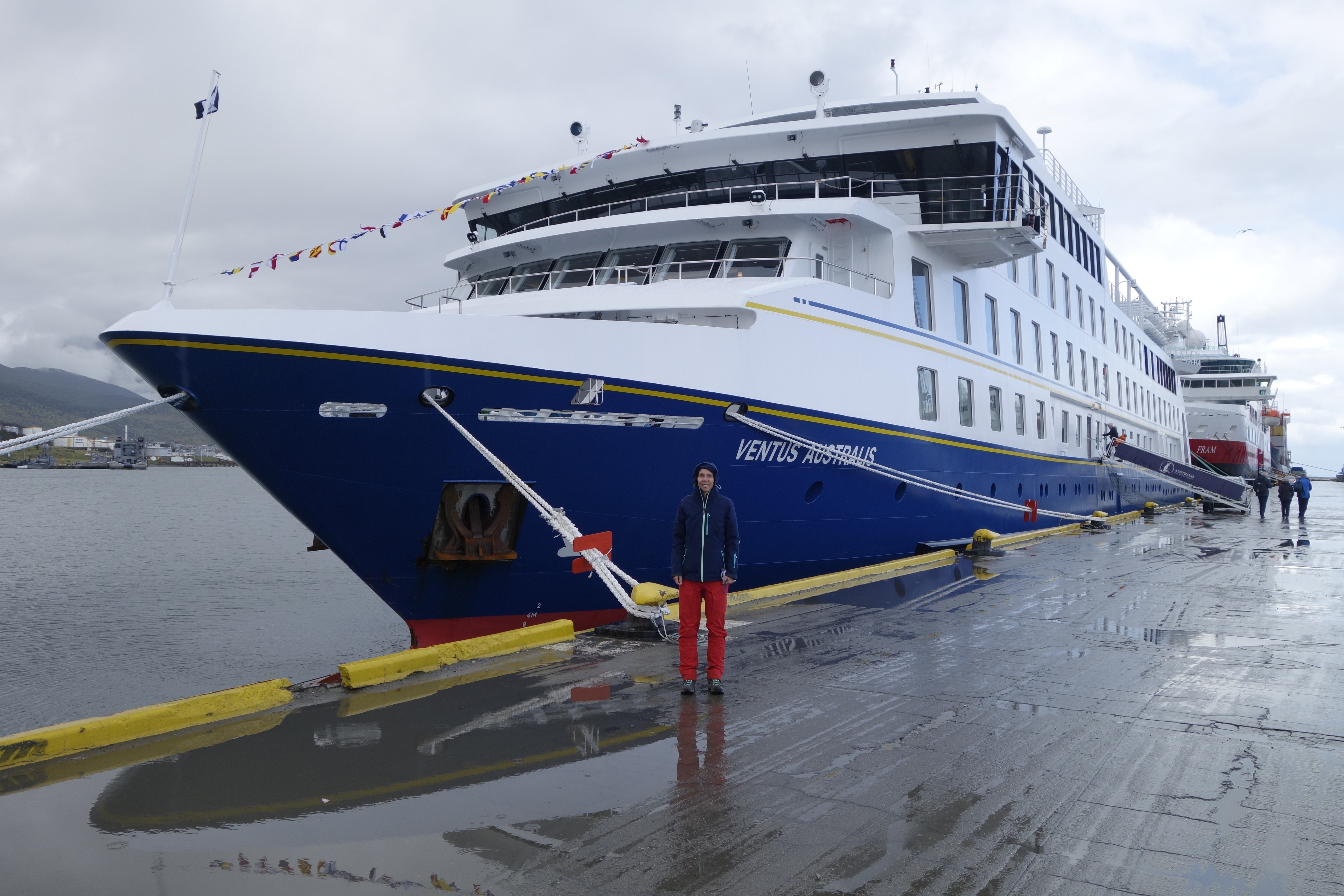 We pack our stuff an try to get a taxi, we find a remis (which is a private taxi with fixed rates) for 200 ARS to the Australis check in (we have to be there between 10 am and 5 pm) on Avenida San Martin 409, Ushuaia.
