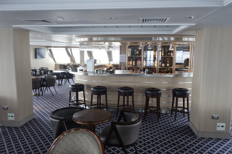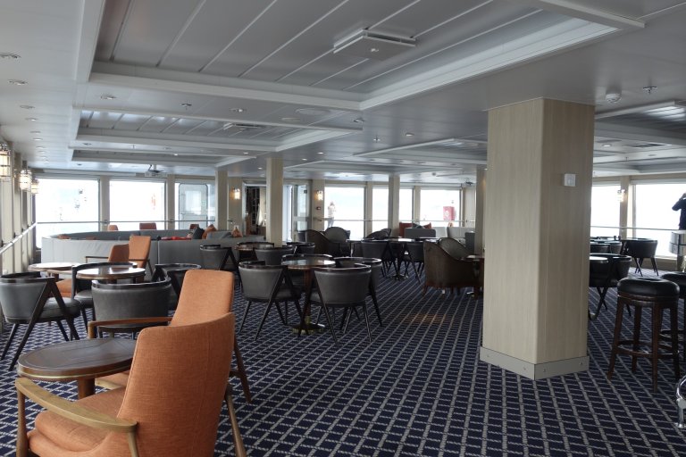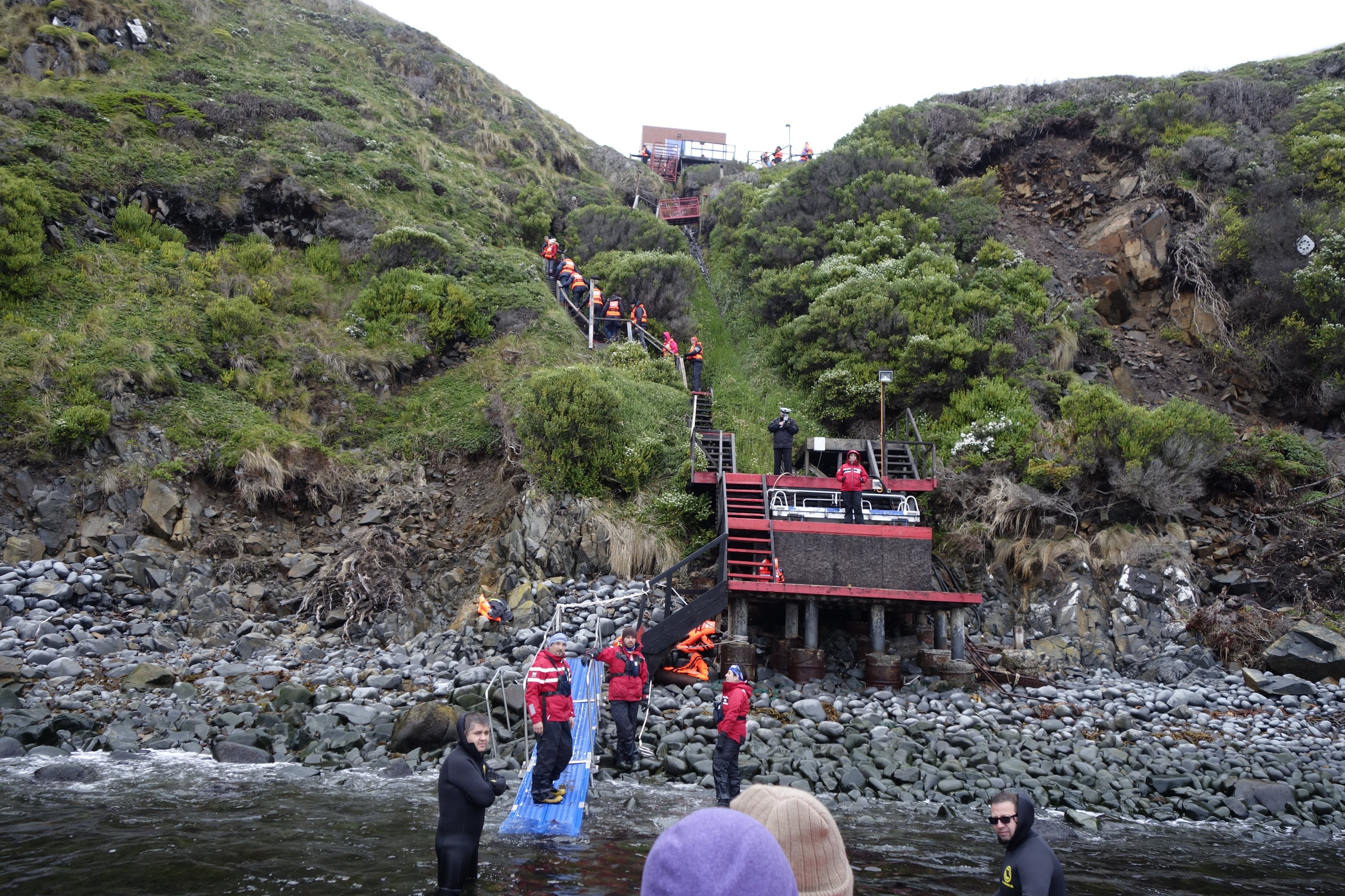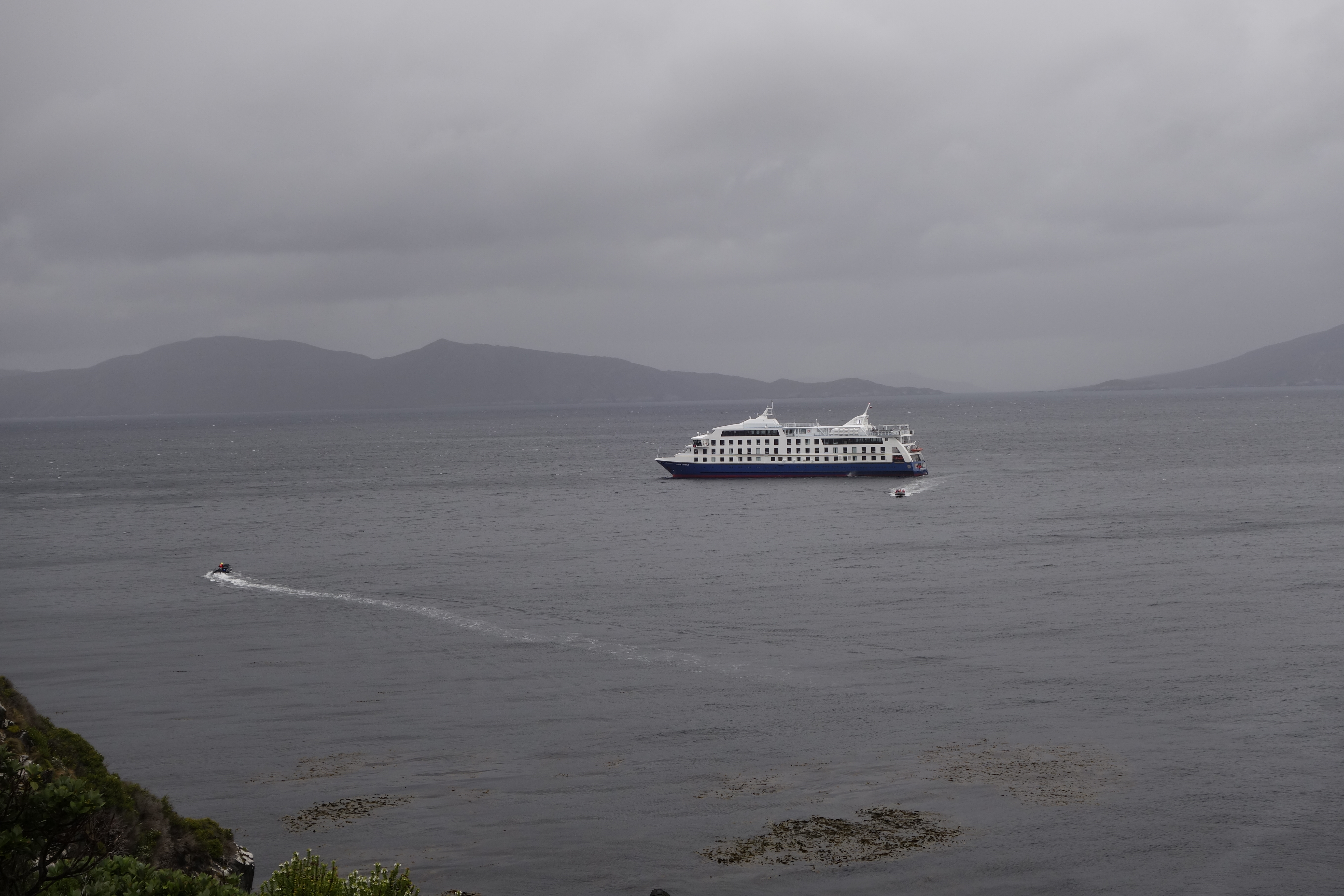 7:00 am: We dress up for a windy and rainy shore landing and go up to Darwins Lounge on Deck 5. There is a short briefing for landing on Cape Horn at 07:00 am. They always do a spanish briefing in the Yamana Lounge on Deck 4 and synchronously an english one. The english briefing is realtime translated for the many German tourists via headphones. Weather and waves make it possible to land on Cape Horn.