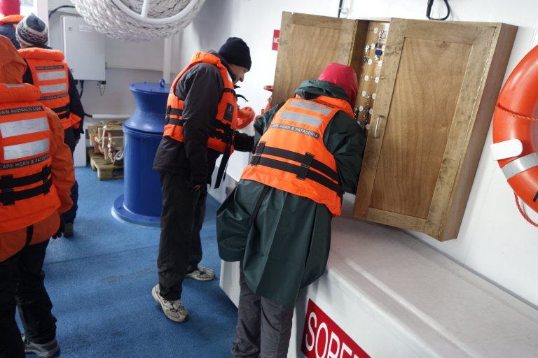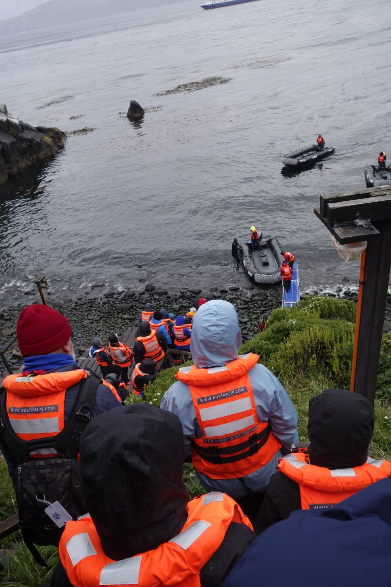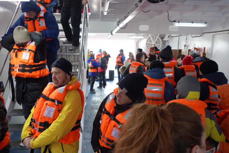 Zodiac landing starts immediately afterwards with 3 Zodiacs for 140 people. We queue from Deck 5 to Deck 1 over the stairs outside and put our tag in a wodden box to check later, if you are back again (if you donot take it, what every time somebody does, they panic). G adventures uses magnet card with picture swipe.