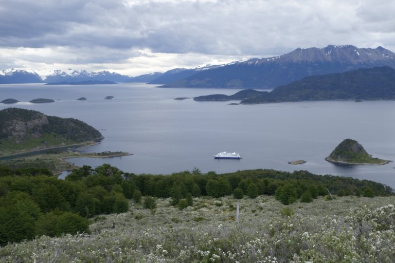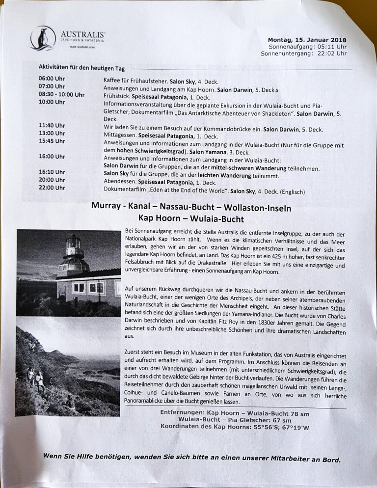 Afterwards there is breakfast buffet, briefing for the next landing in Wulaia bay and at Pia glacier. Then they show an interesting documentary about shackleton (Movie). – break – food again, lunch – registration for the landing groups with extreme difficulty – break to 03:45 pm.