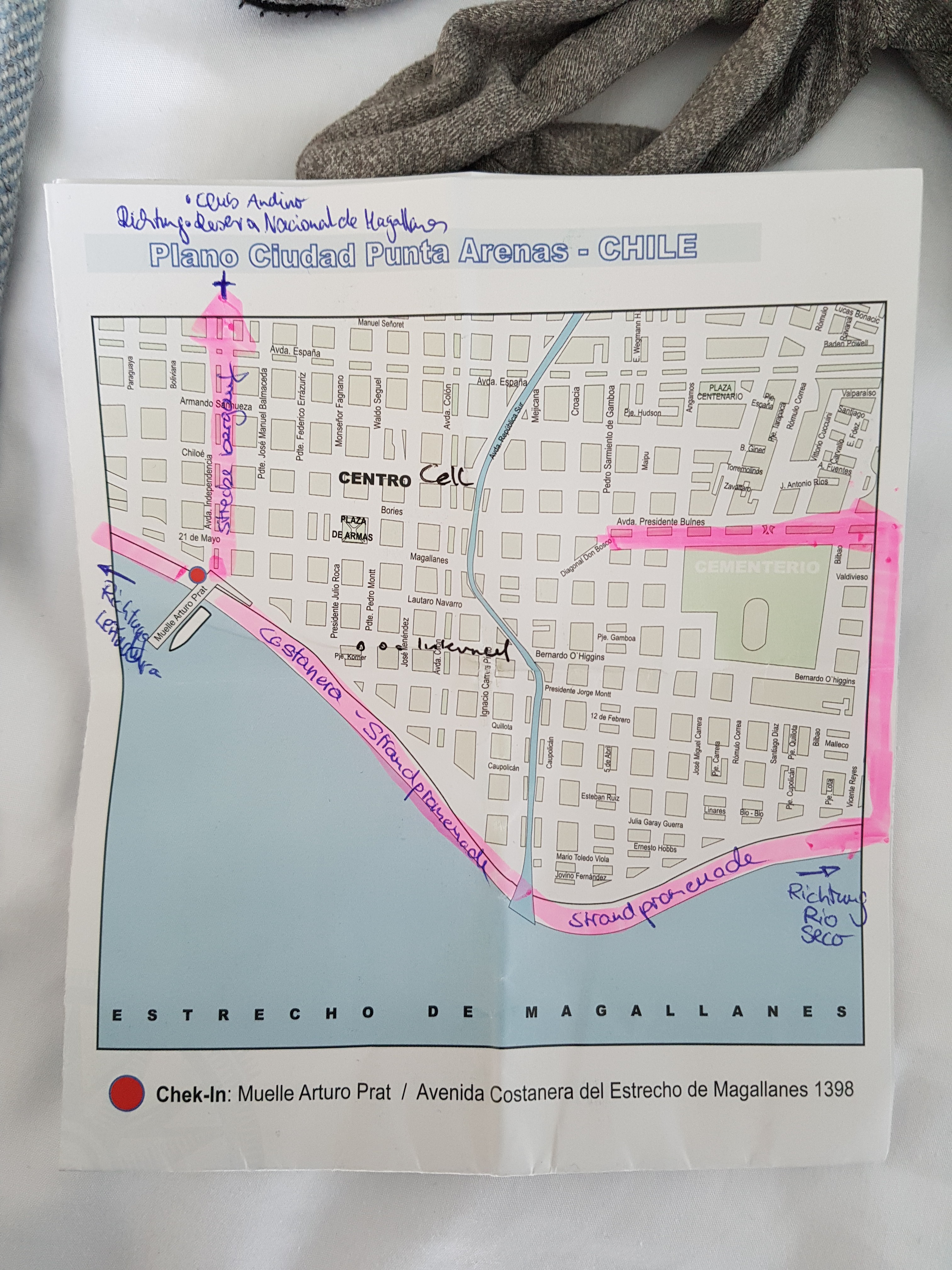 Then we try to get a data SIM for our pad. This is complicated because in 7 different shops nobody speaks a minimum of english or has an english price list. In the end we decide to run and see Punta Arenas. The german guide of the ship – Gusta – draw us a running map.