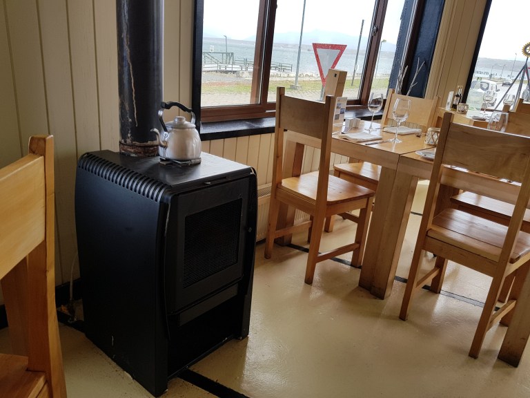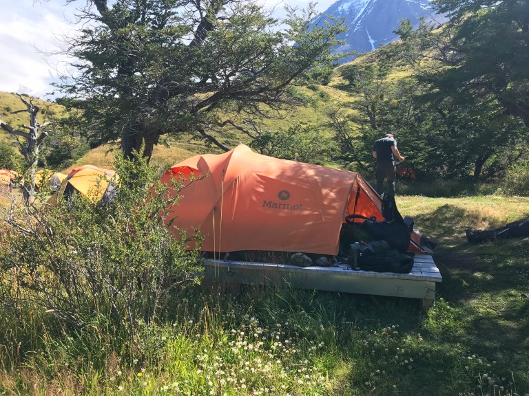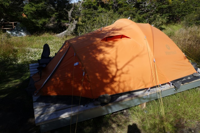 The tent is great. On a wooden platform. Clean Marmot 3 pax, new, clean. Foam mattresses inside, good warm not smelly sleeping bags. Also fresh towels. No pillow, good luck we have our own pillows with us. We go for dinner to the campground restaurants. We hand over our voucher. Carrotsoup, pork with quinoa, panna cotta, patagonia red ale (you have to pay). All fine. We sit on a table with 10 others.