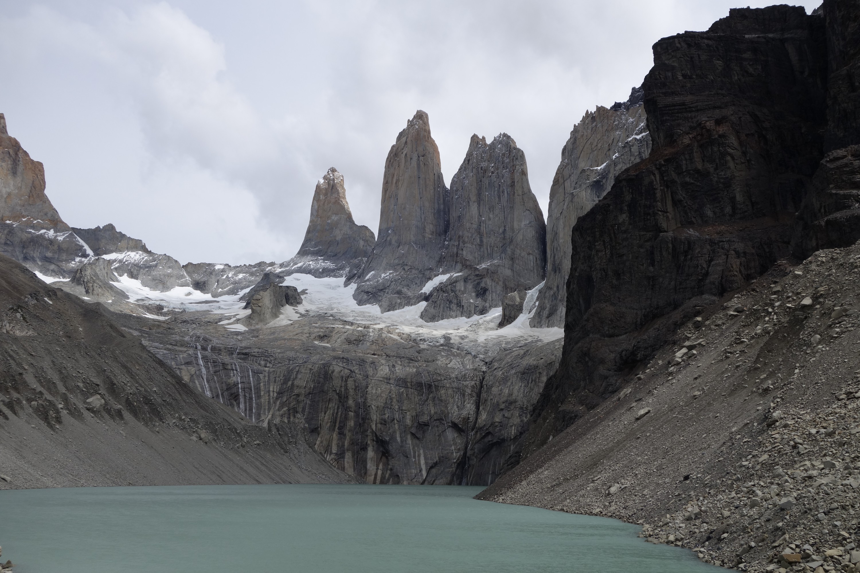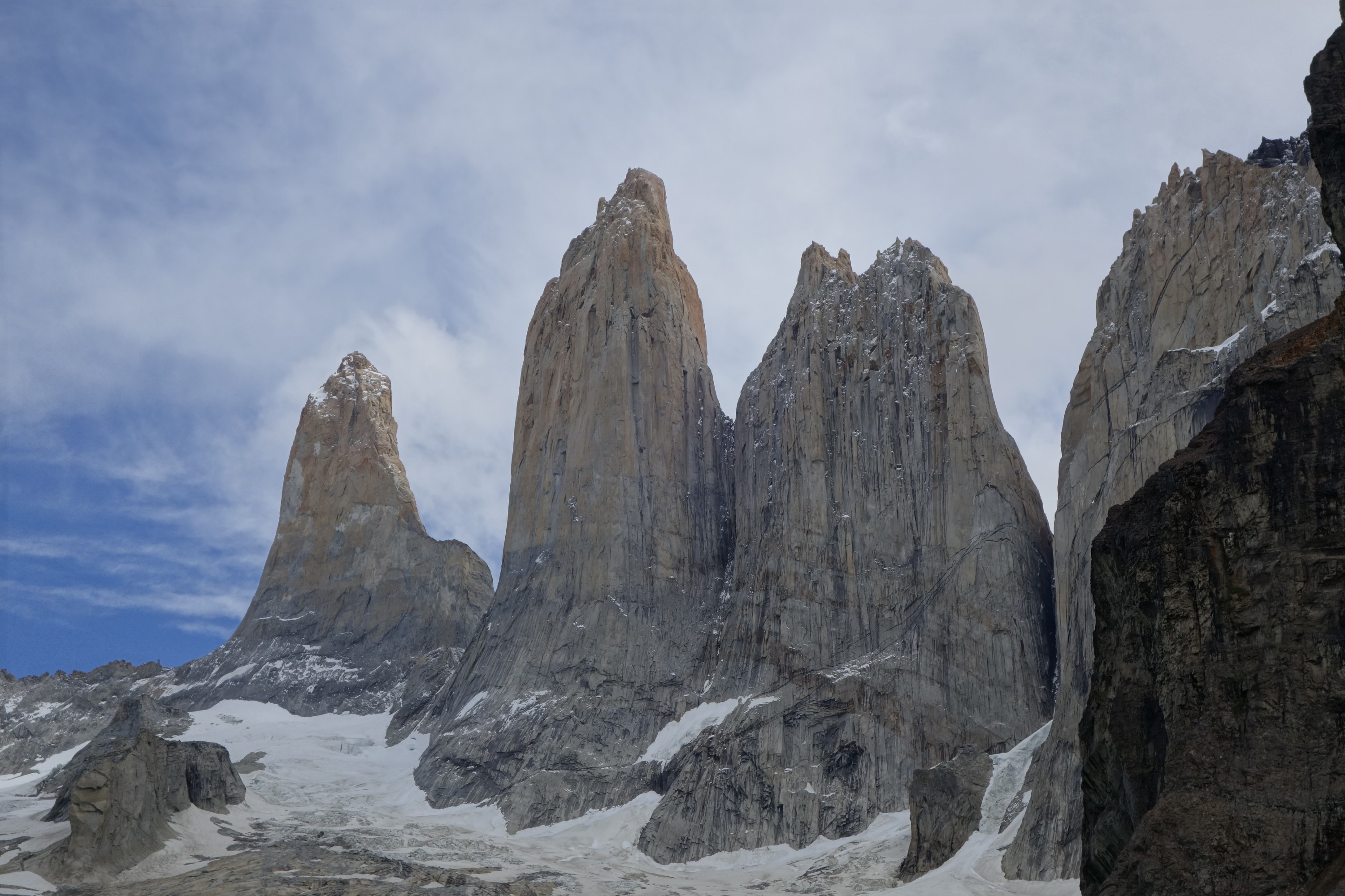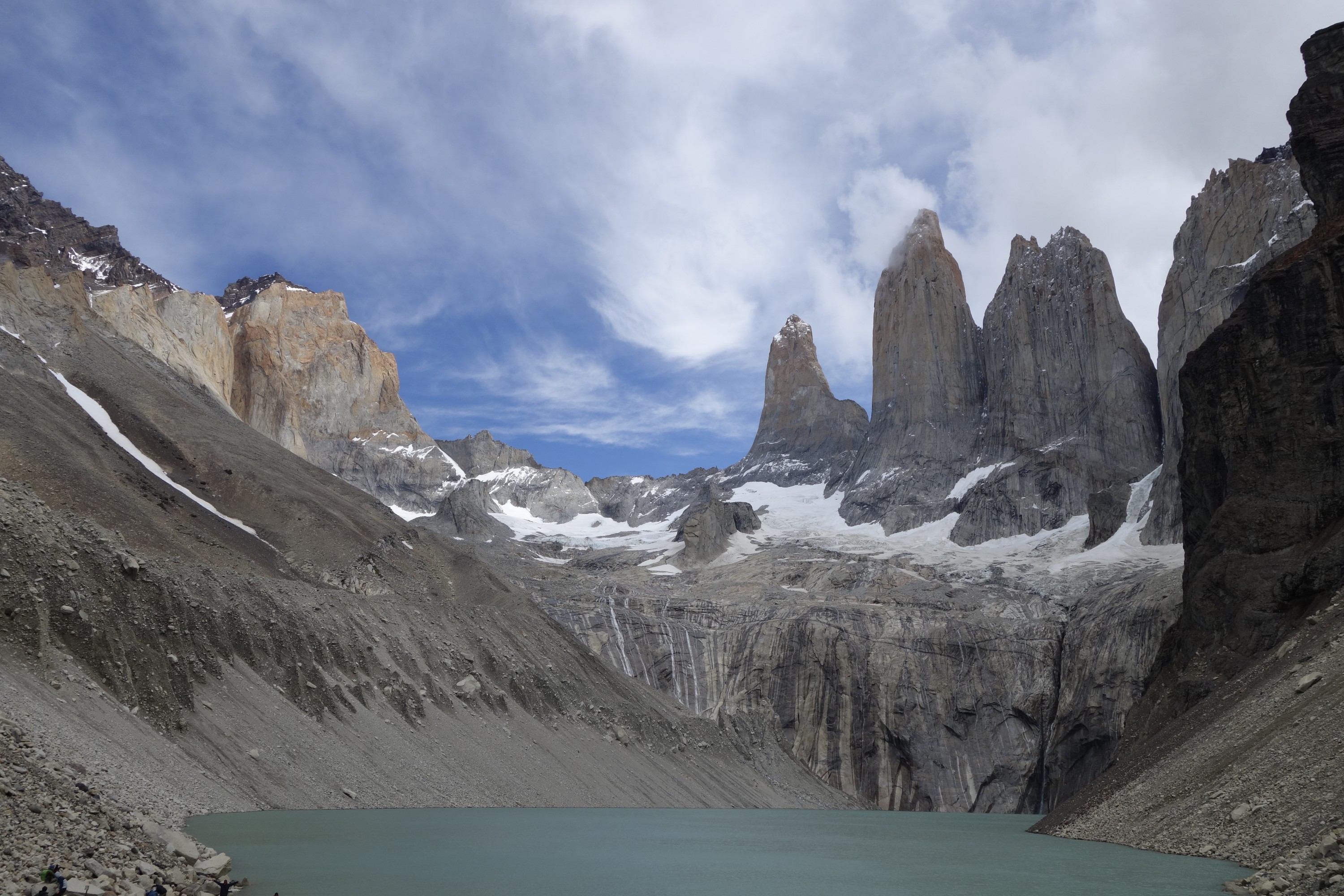 Finally after further 4 km uphill: Base Torres Lookout: Torre Sur (2850 masl) Torre Central (2800 masl) and Torre Norte (2600 masl).