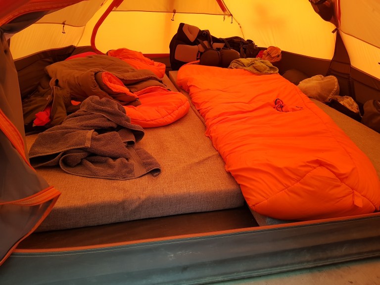 The night is not really cold. The sleeping bags are very warm and comfortable. Our Cocoon silk sleepingbag inliners make it even more comfortable. Outside it is very wet. When I wake up, it is still raining. But in the morning when I get out of my tent …