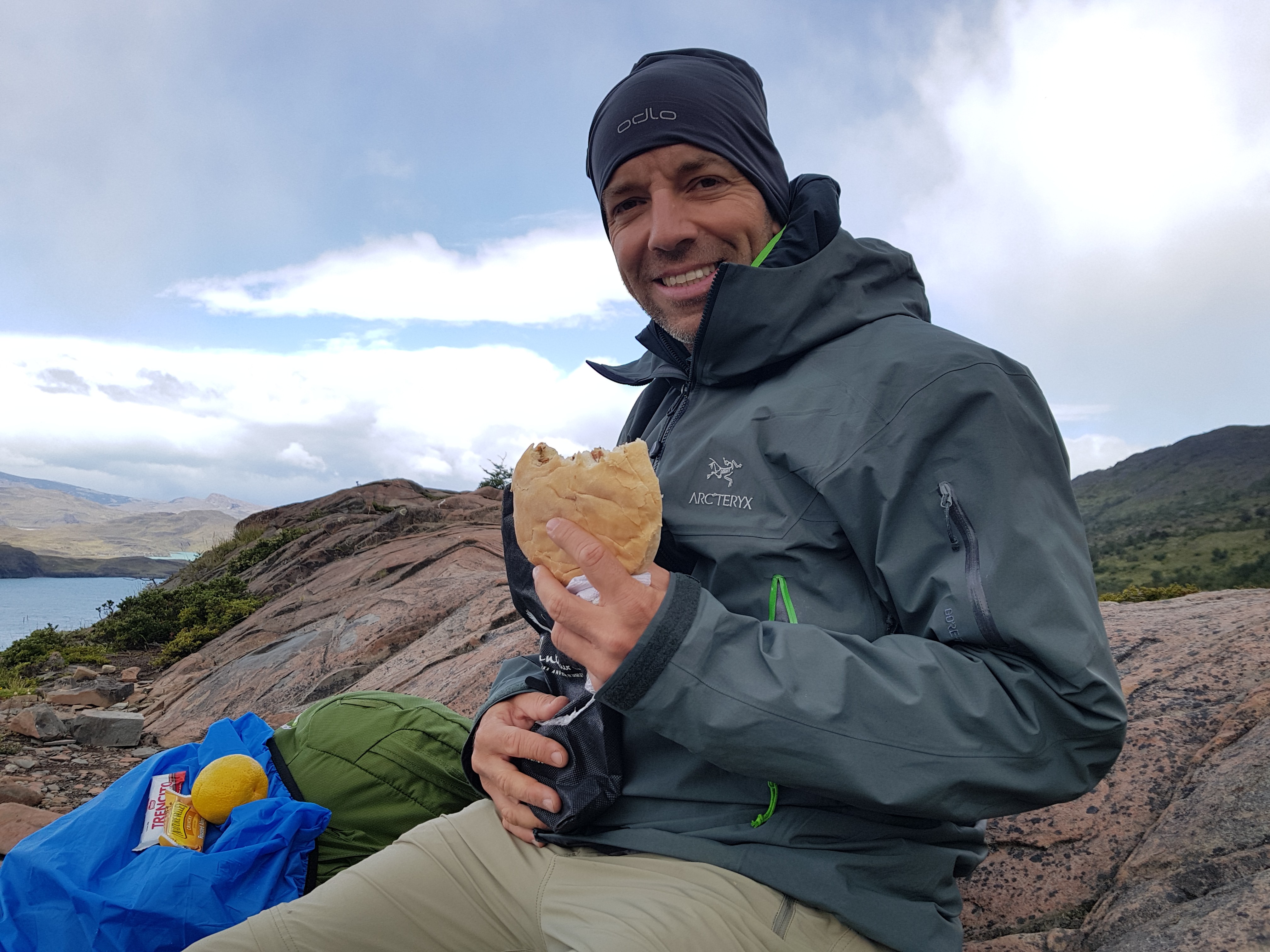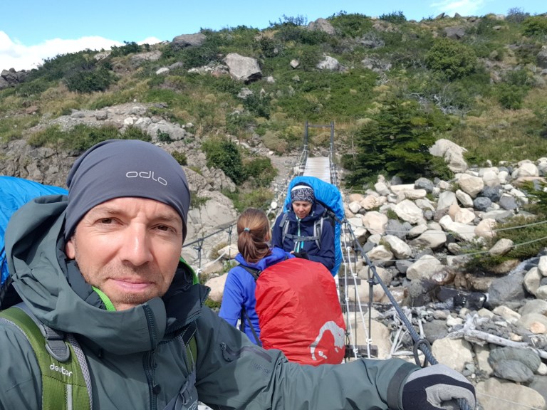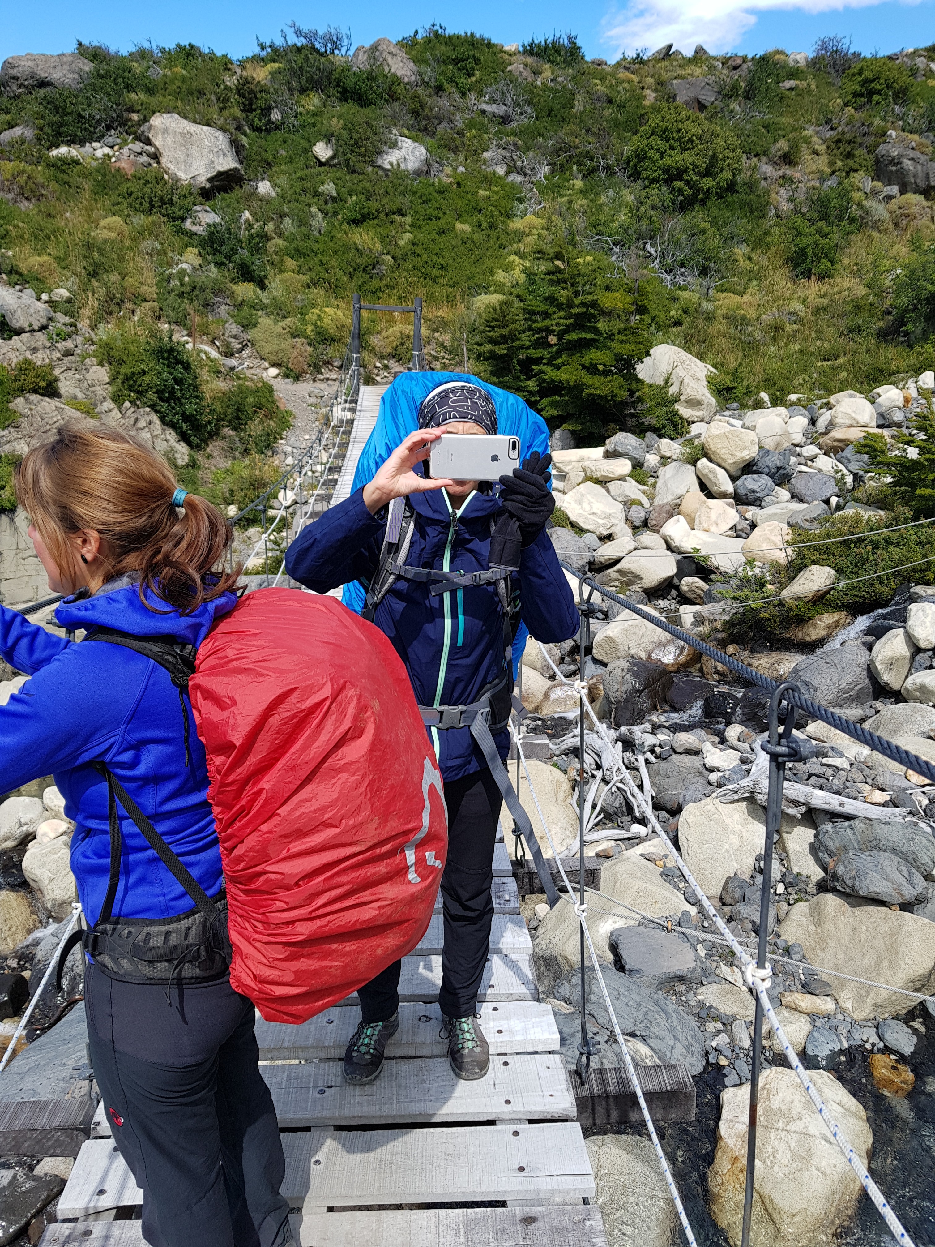 It is a nice walk through forests, crossing streams and swamps. The Almirante Nieto moutain is mostly covered by clouds, it is windy and it rains a lot. Anyway, we have lunchbreak with our mega lunch packs (got it with a voucher in the nice fantastico sur bag) in the rain.