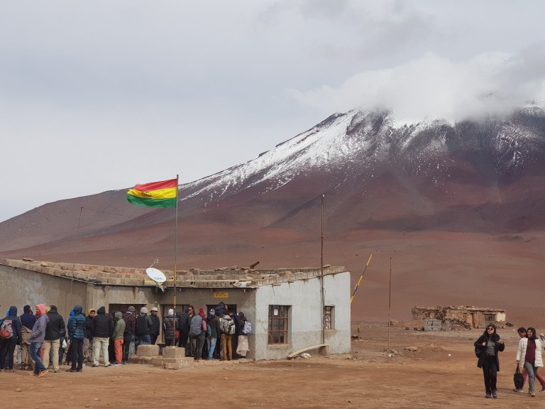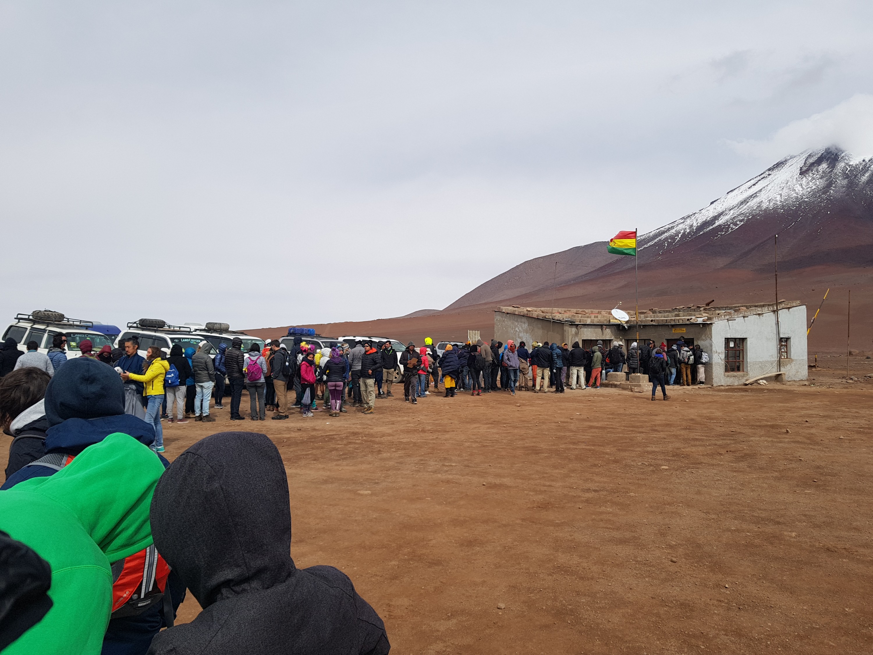 People get immediately queued up by their bolivian guide in front of the bolivian border control. It is cold and windy. Tourists get out warmer jackets.