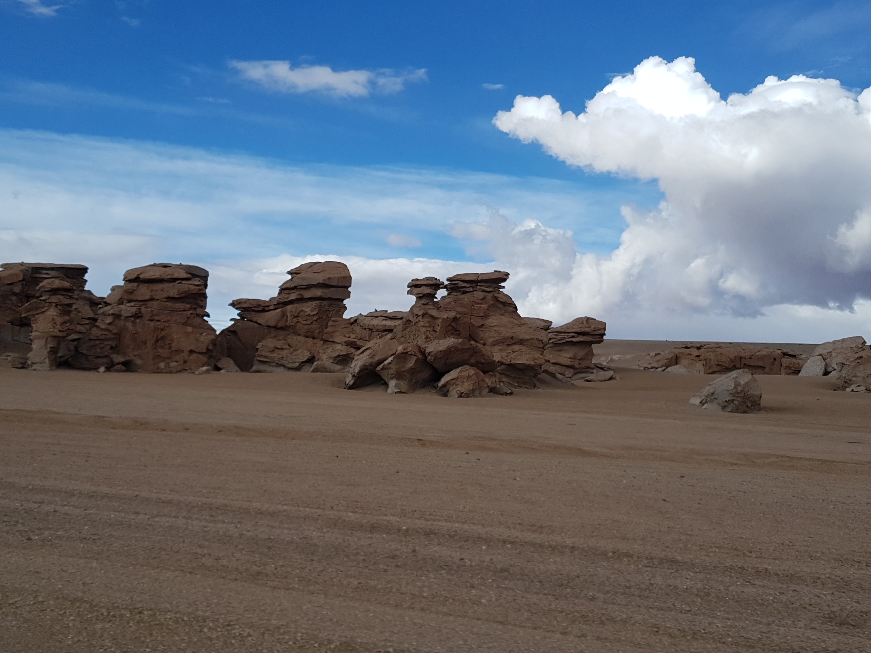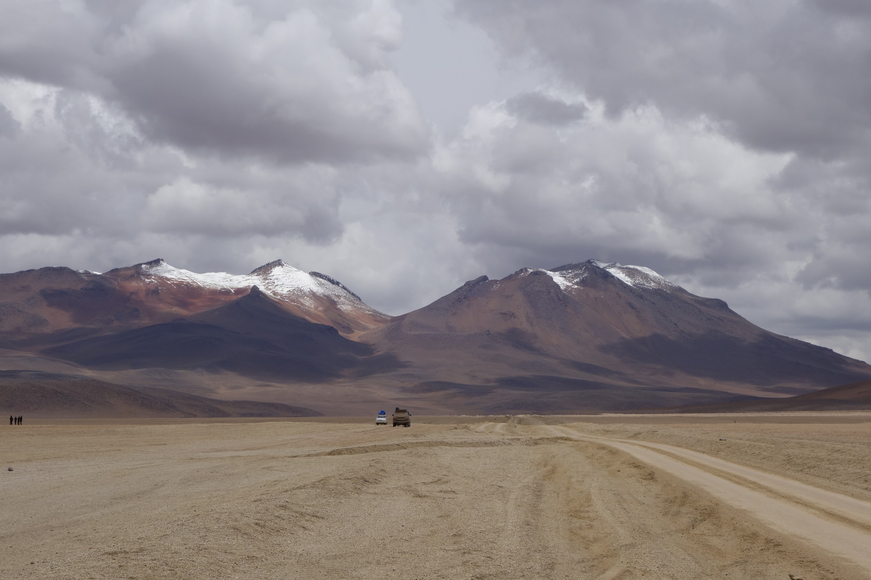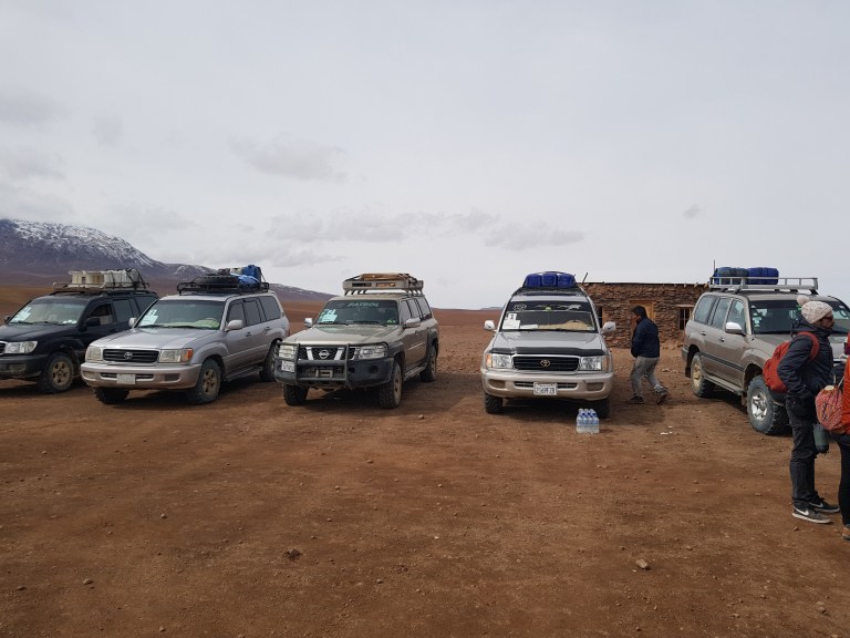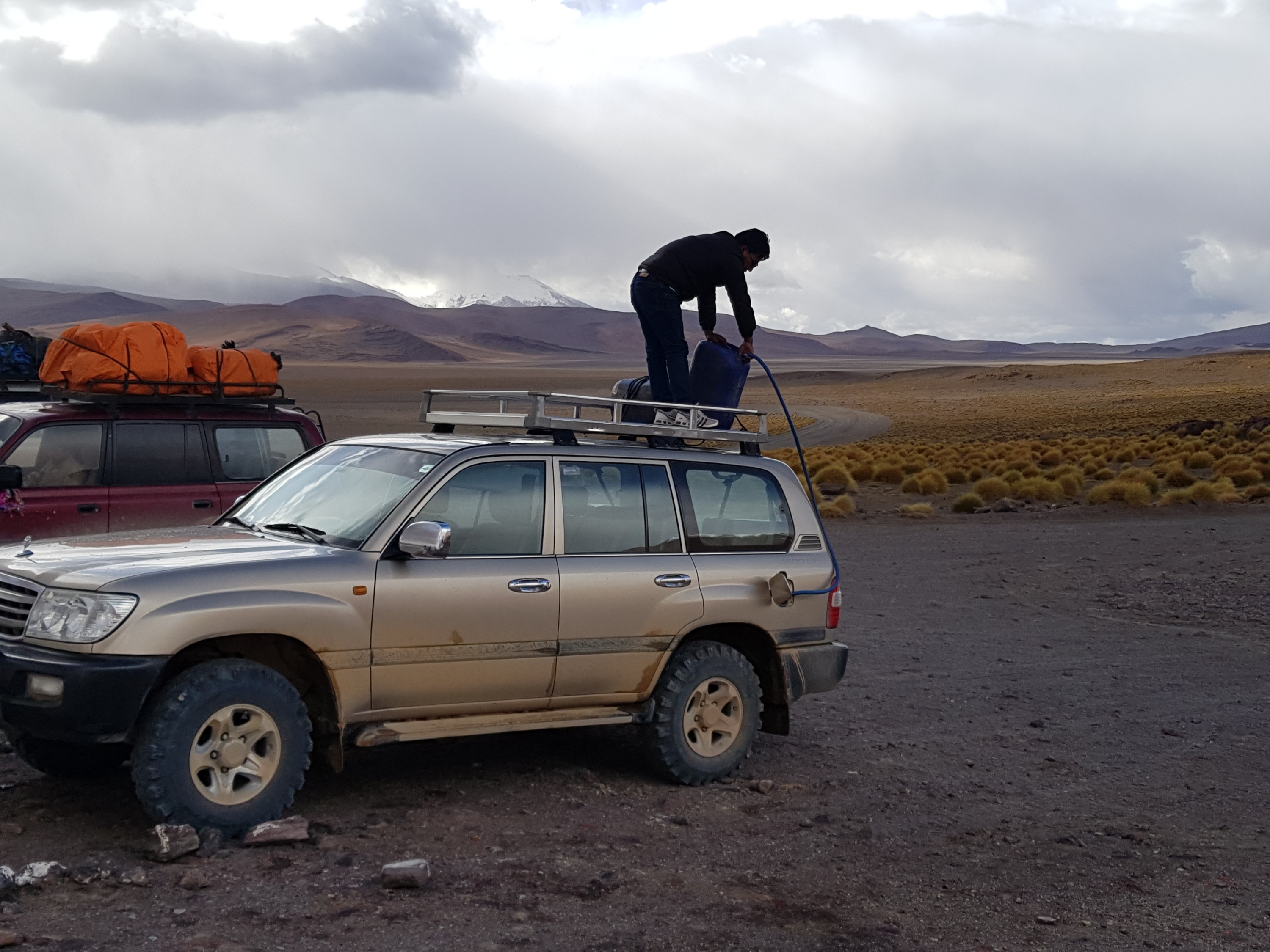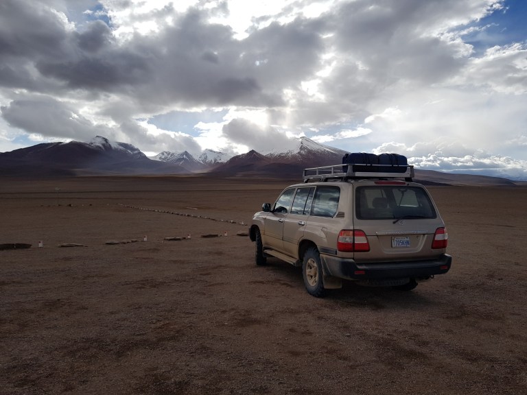 On the Bolivian side aged Toyota Landcruiser or Nissan hardbodies with desert dueler tires are waiting. At least one spare tire an fuelboxes on the roof.