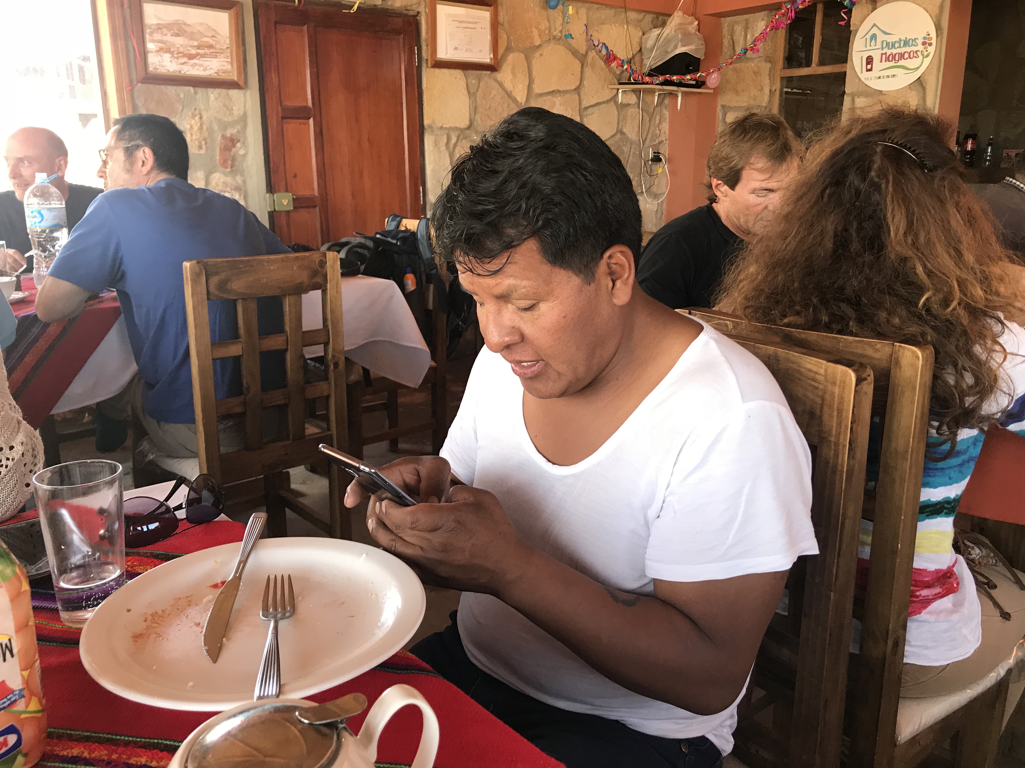 We continue to San Cristobal, where we called to order Menu 1 for lunch. Somehow Chavier has an extra deal with them and gets a schnitzel with fries. He drowns it in something like Ketchup.