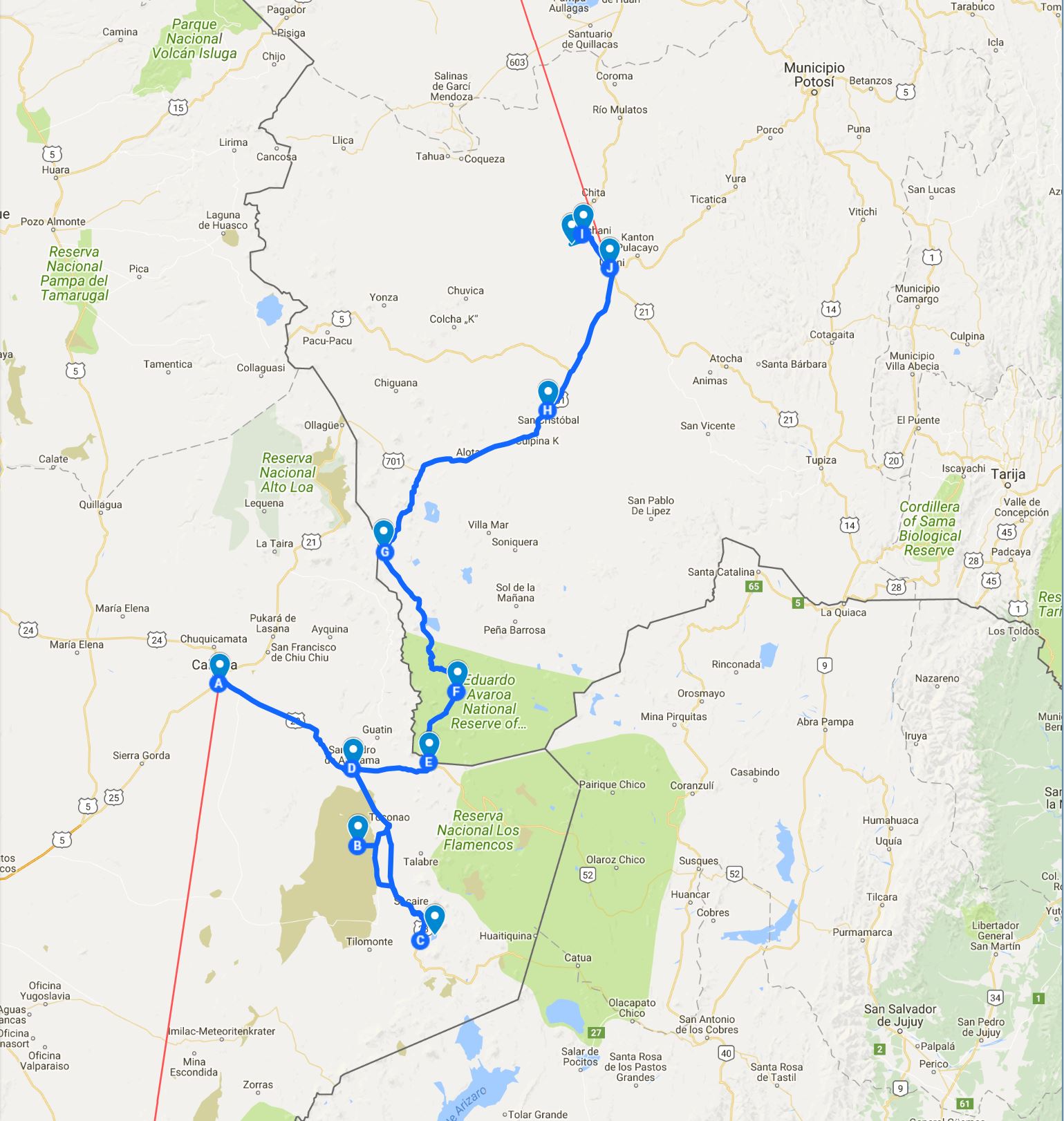 The plan is to leave Hotel Tayka del Desierto and go up north along Laguna Pastos Grandos to San Cristobal town. Have lunch there and then follow the main road to Uyuni, get a ATM, then go to the Hotel del Sal Luna Salado.