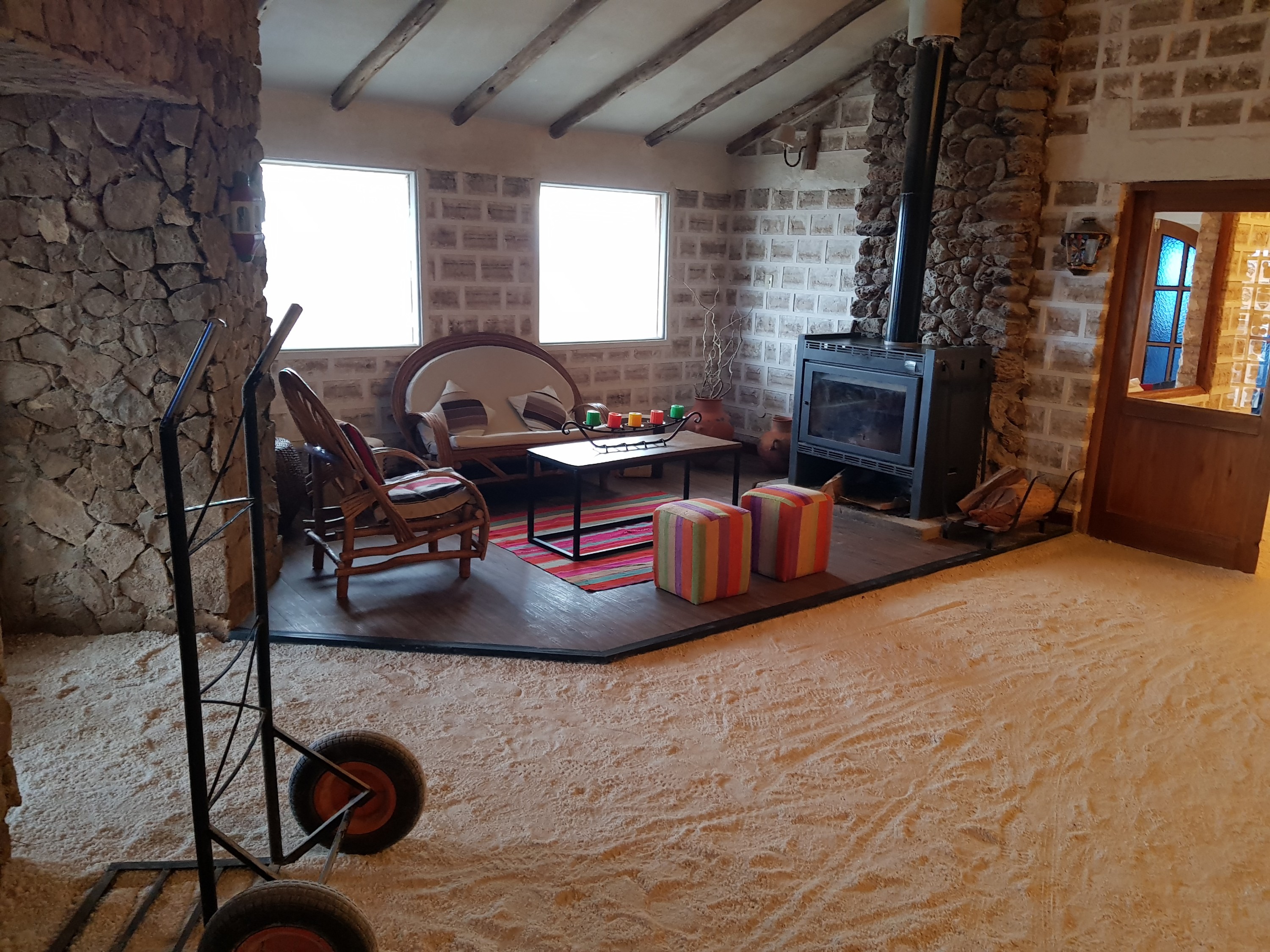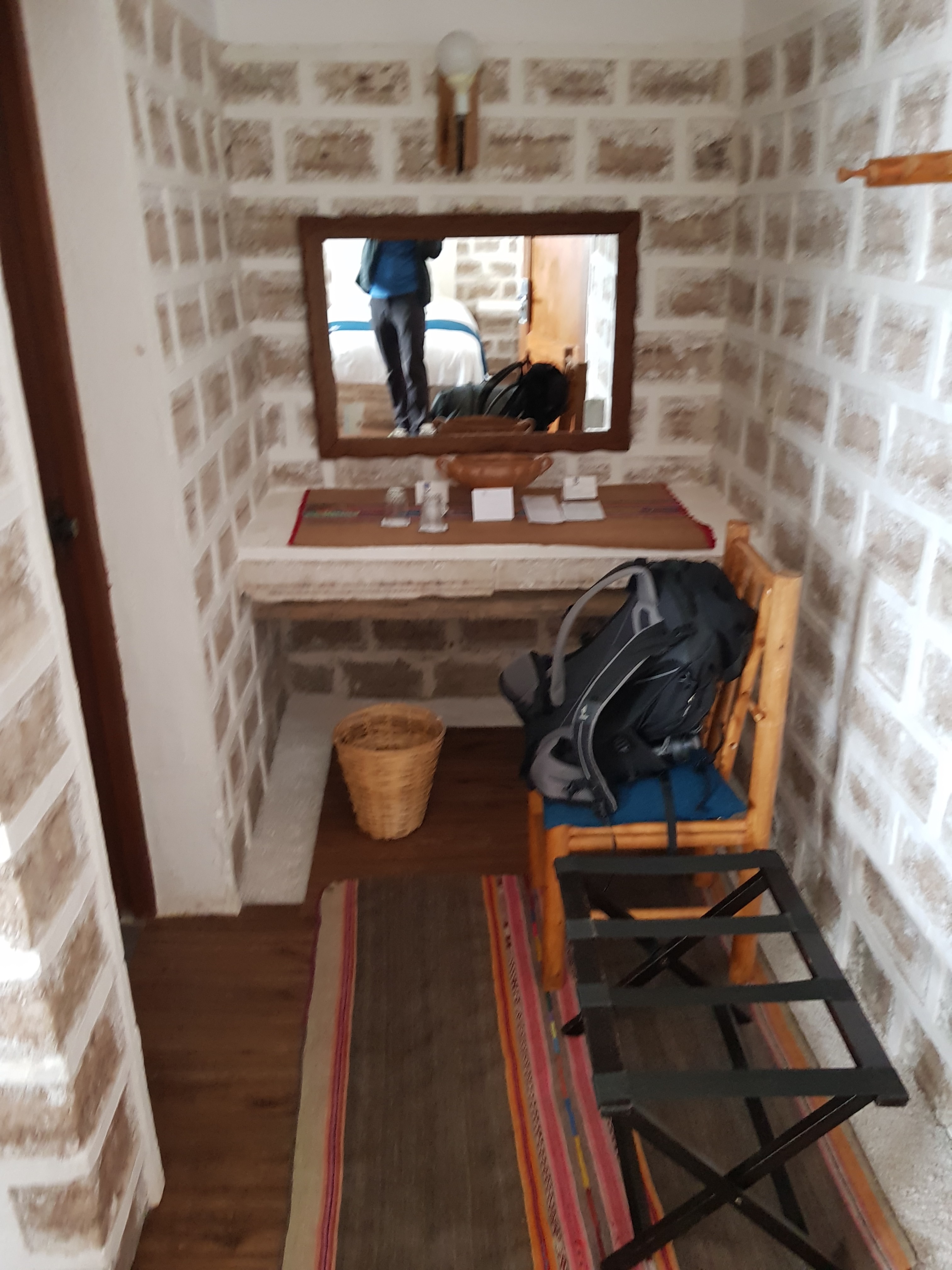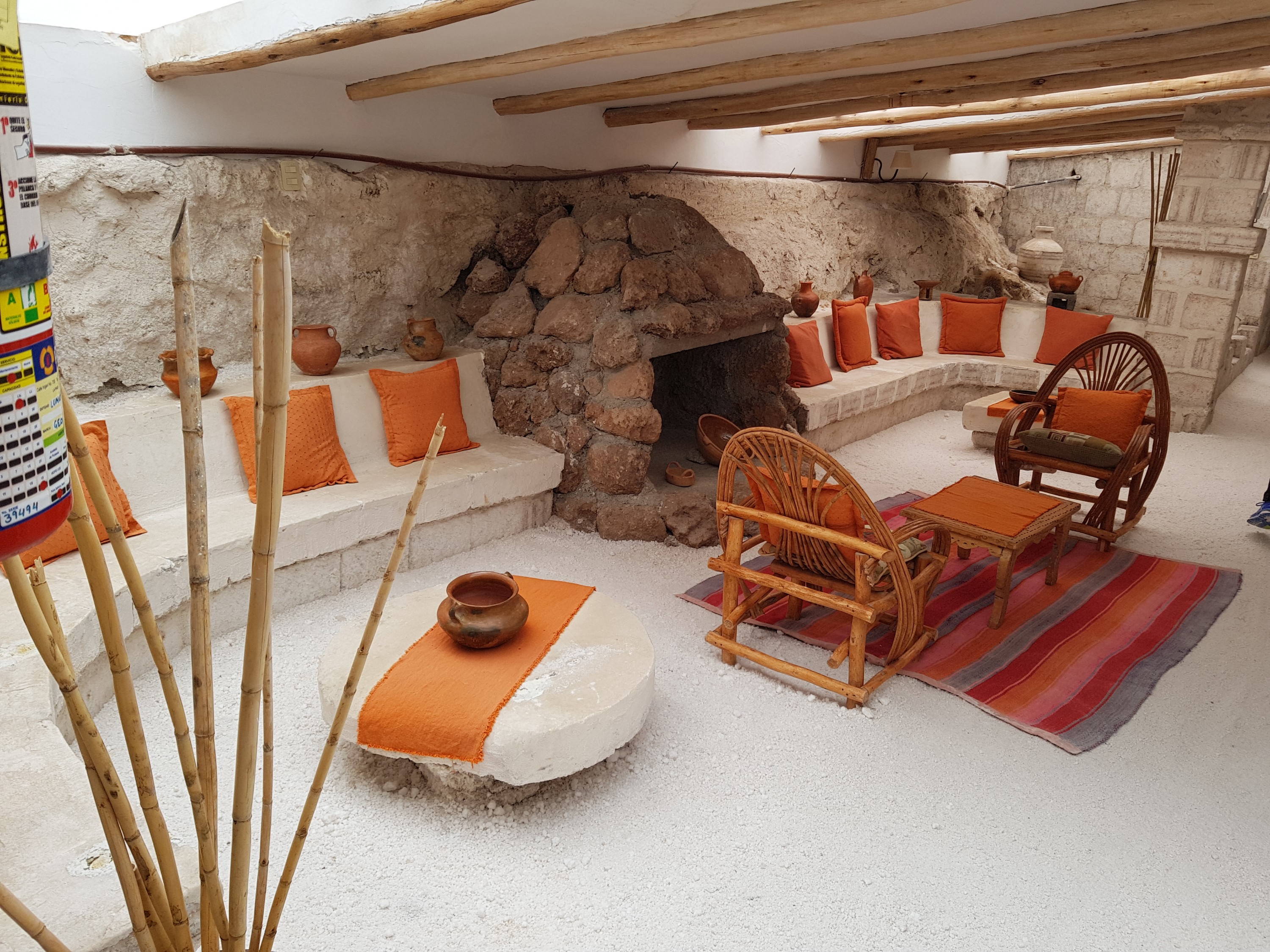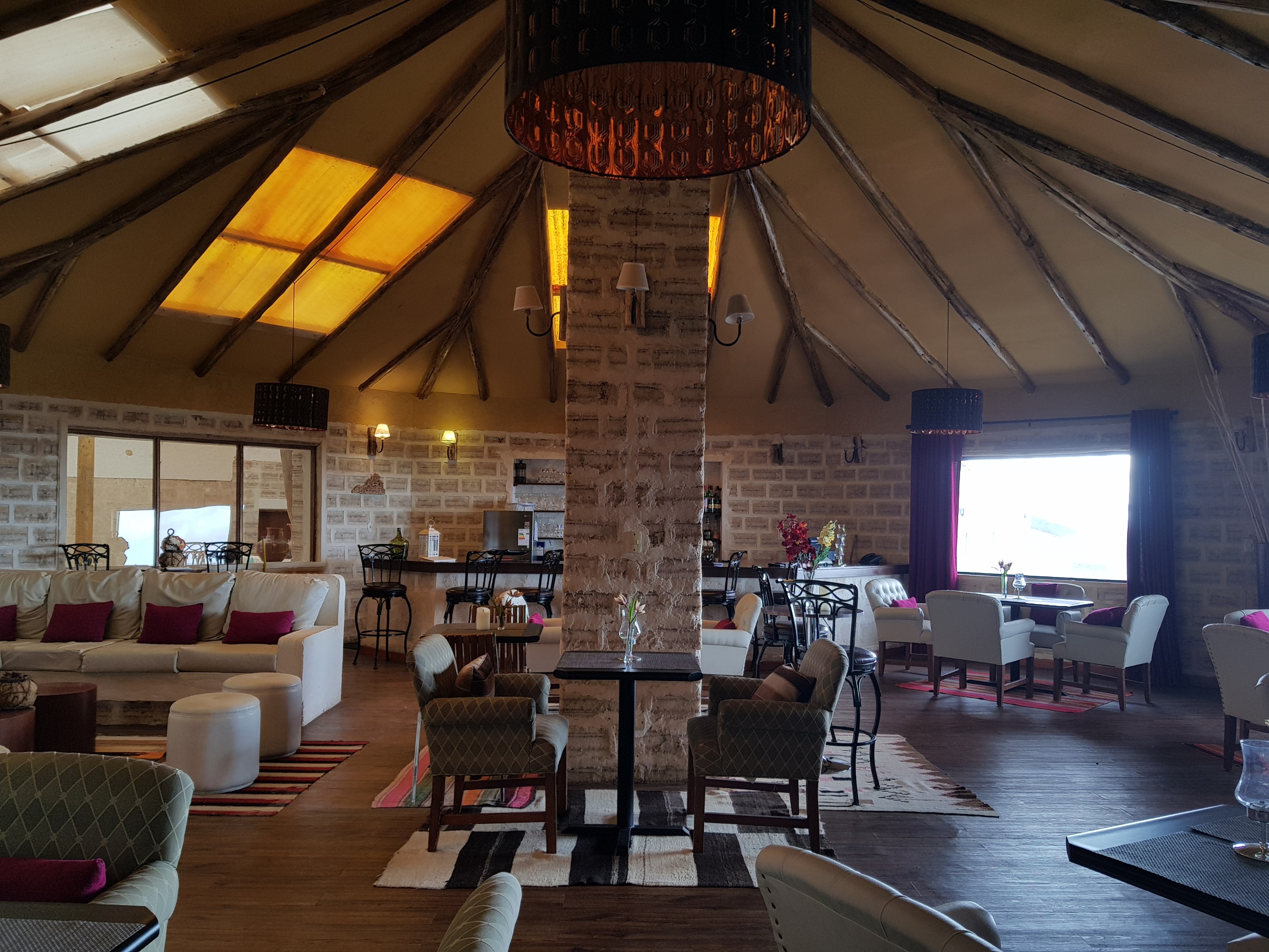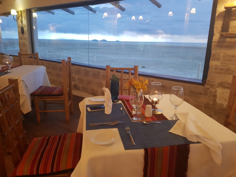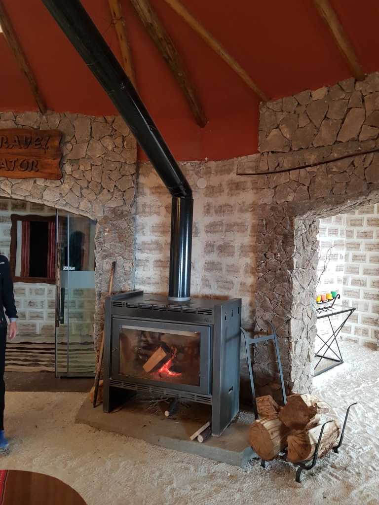 We are already tired. So our driver brings us to todays Hotel de Sal – Luna Salada, the salt hotel. Everything is made out of salt. Walls, floor, steps, bed, the room smells like salt and has a powerful heating but split beds. A lot of public spaces, a closed bar (the hotel is fully booked, so they need the full staff to provide buffet, therefore no bar ?!), a spa (water is muddy because of the rain, so no jacuzzi. Hot water in the spa is broken. But we can turn on the steambath and in 40 min you can use. No towels). Hot water is limited, but power is on all night. Heating works.