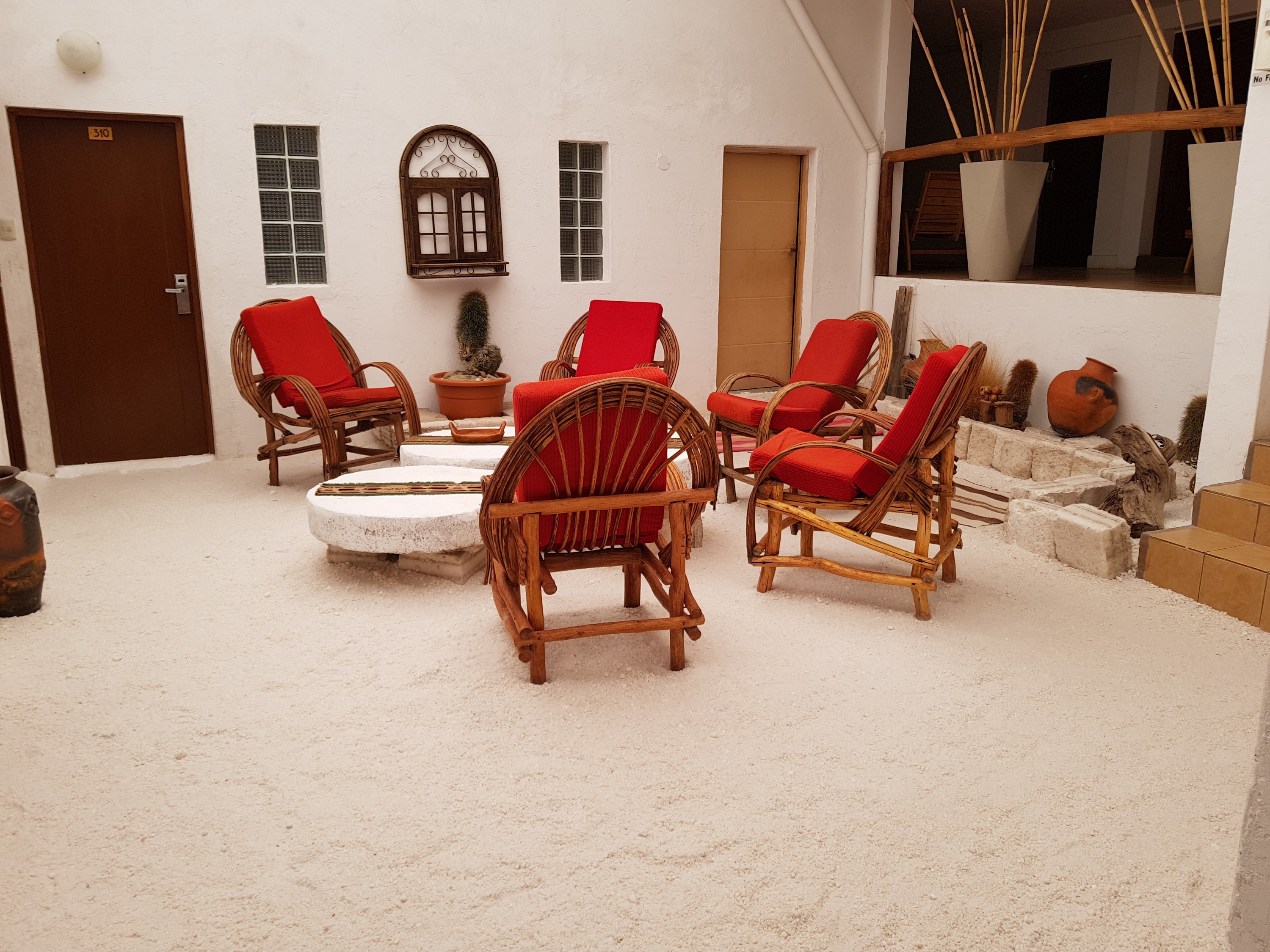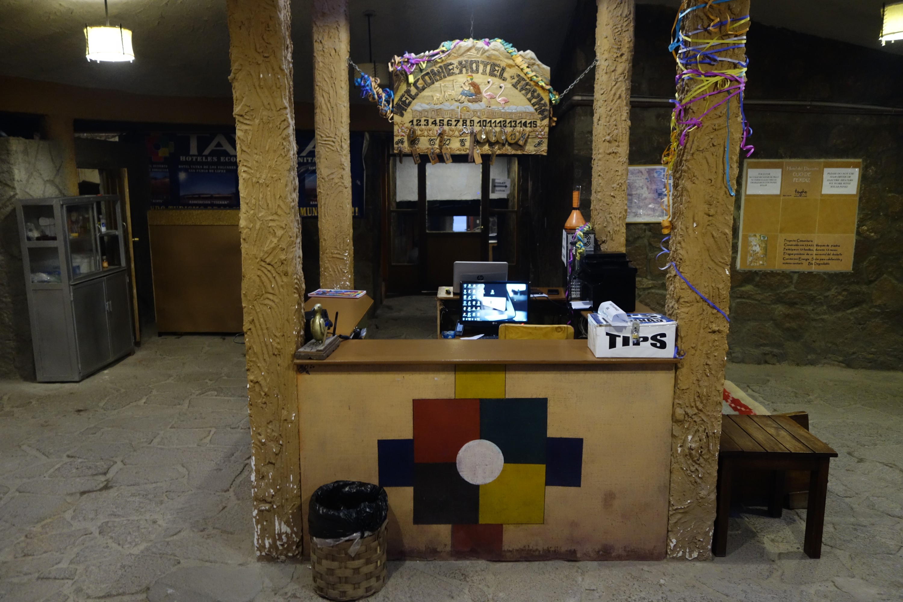 We start not so early, breakfast 07:15 am, leaving at 08:00 am. You can pay only Bolivianos or USD. We donot have Bolivianos (I didnot encounter a cash machine on the last 400 km), so it is always good to have George Washington with us. The hotel lobby is quite basic, biggest things are the tip box followed by the oxygen bottle.