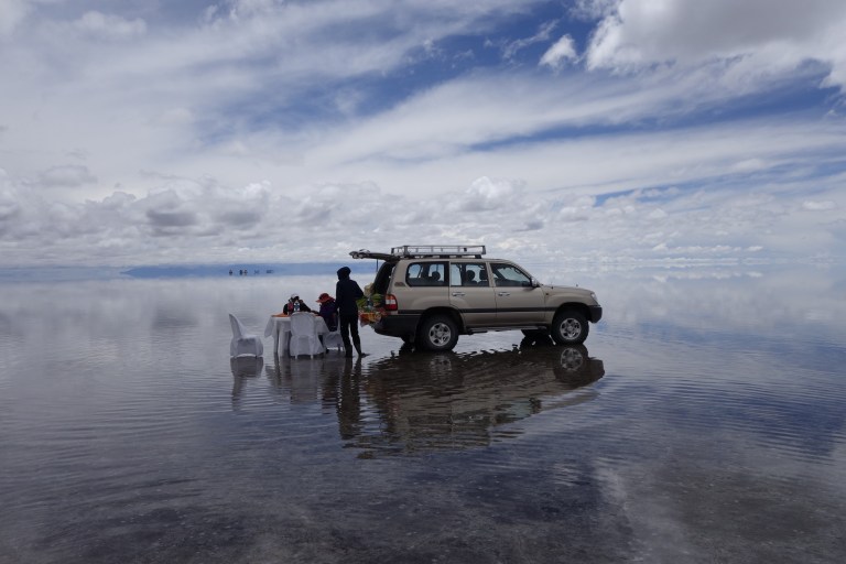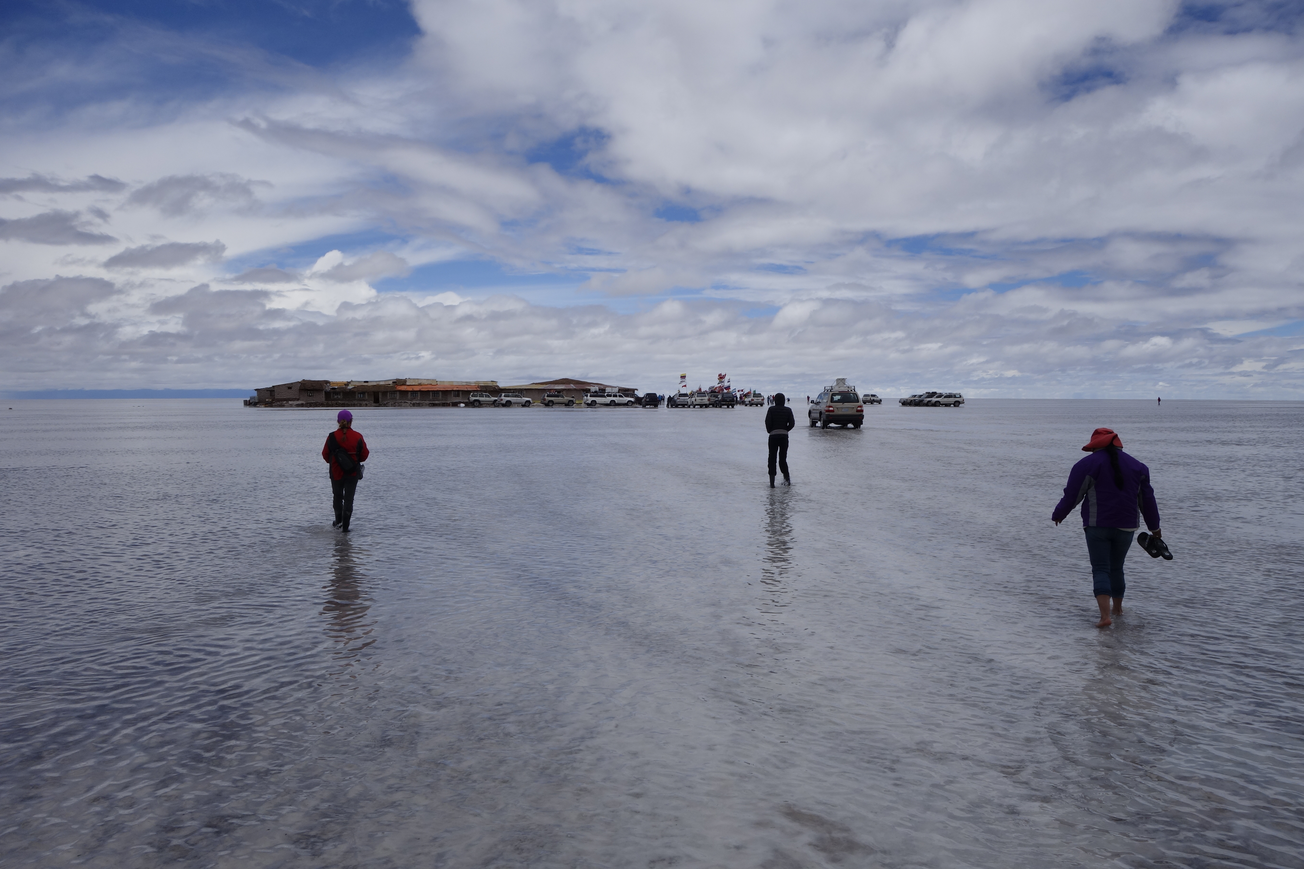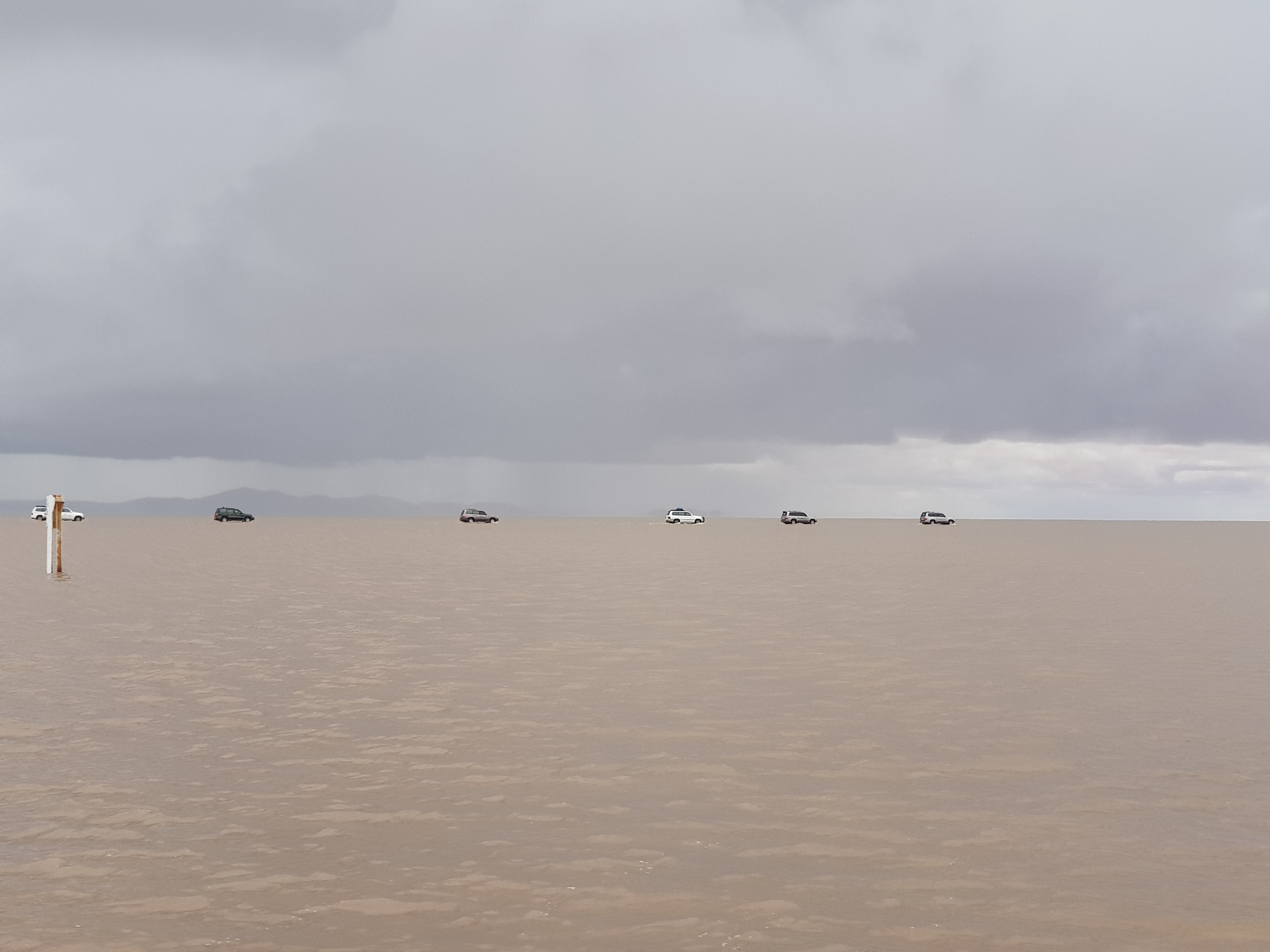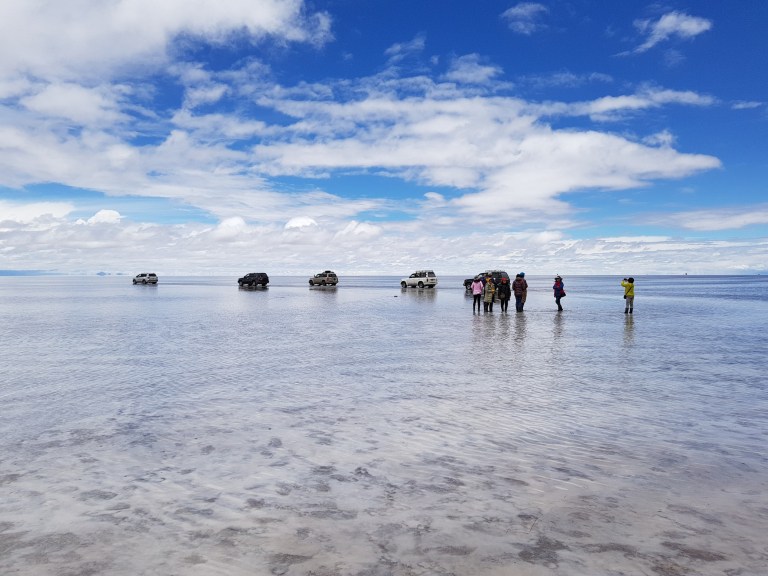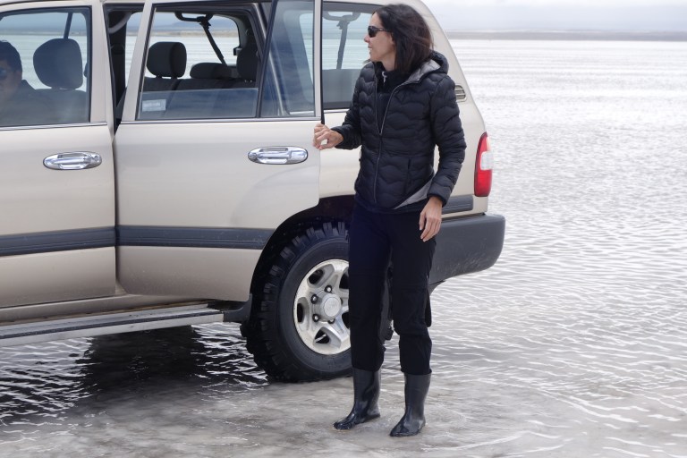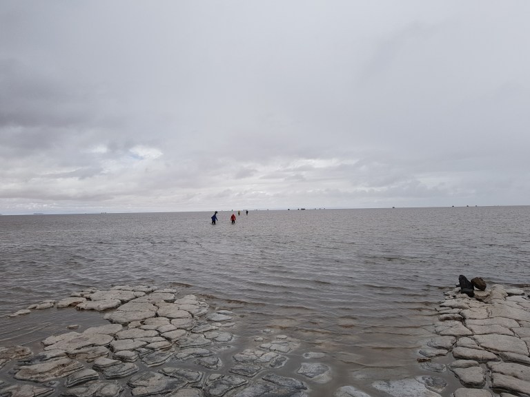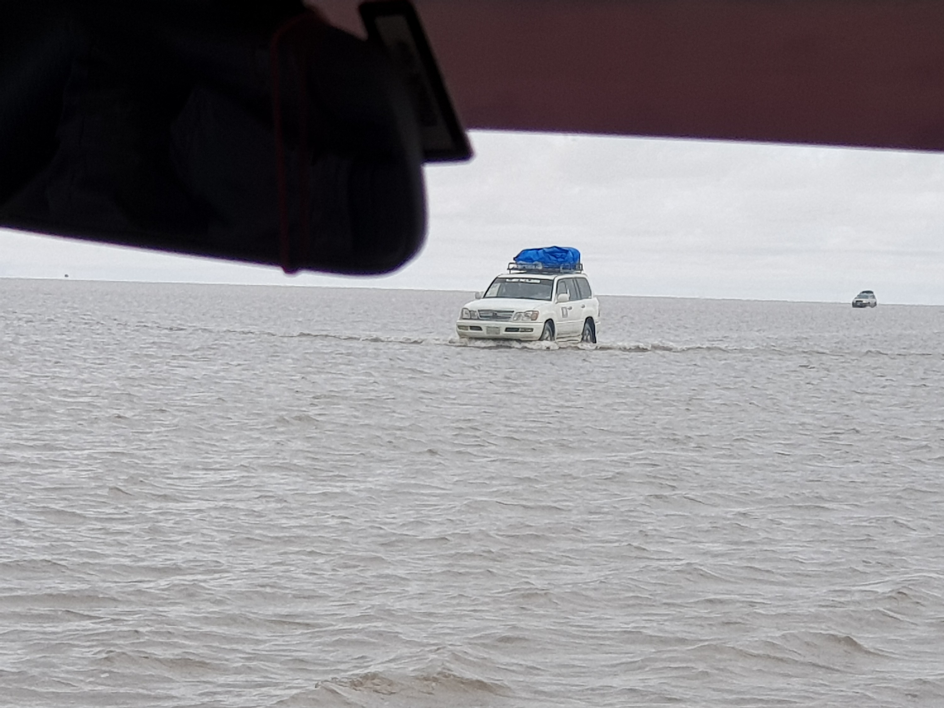 We get back in the car an Chavier drives on into the lake on the salt flats. They all do.