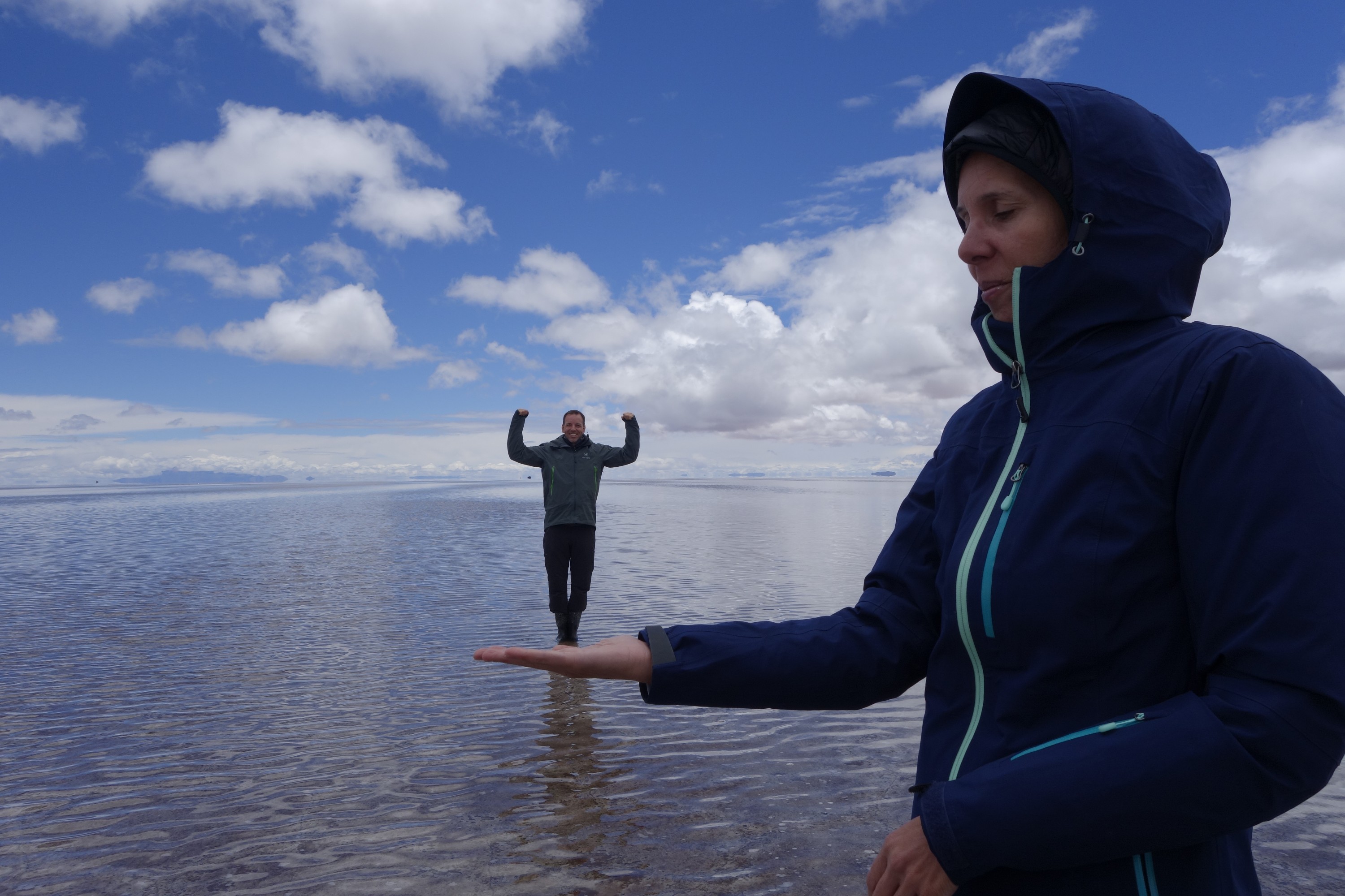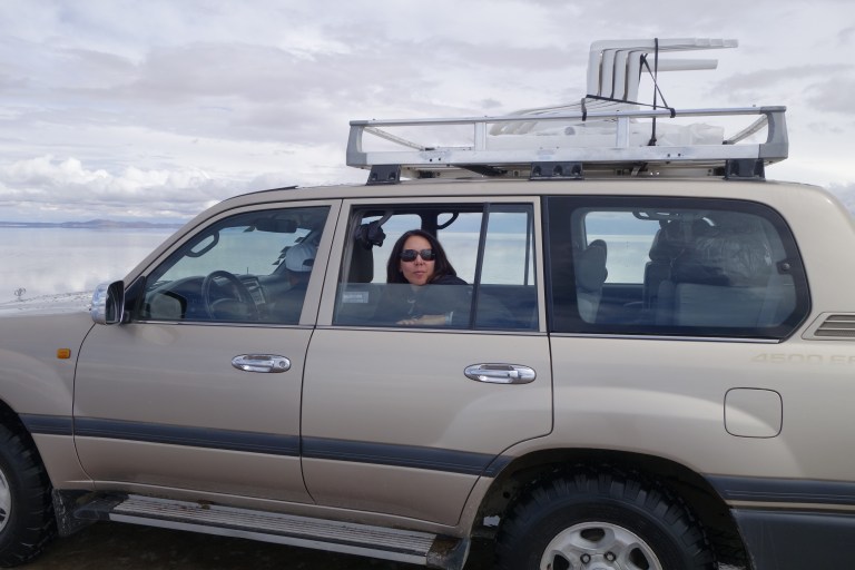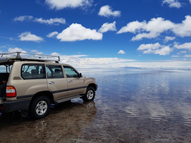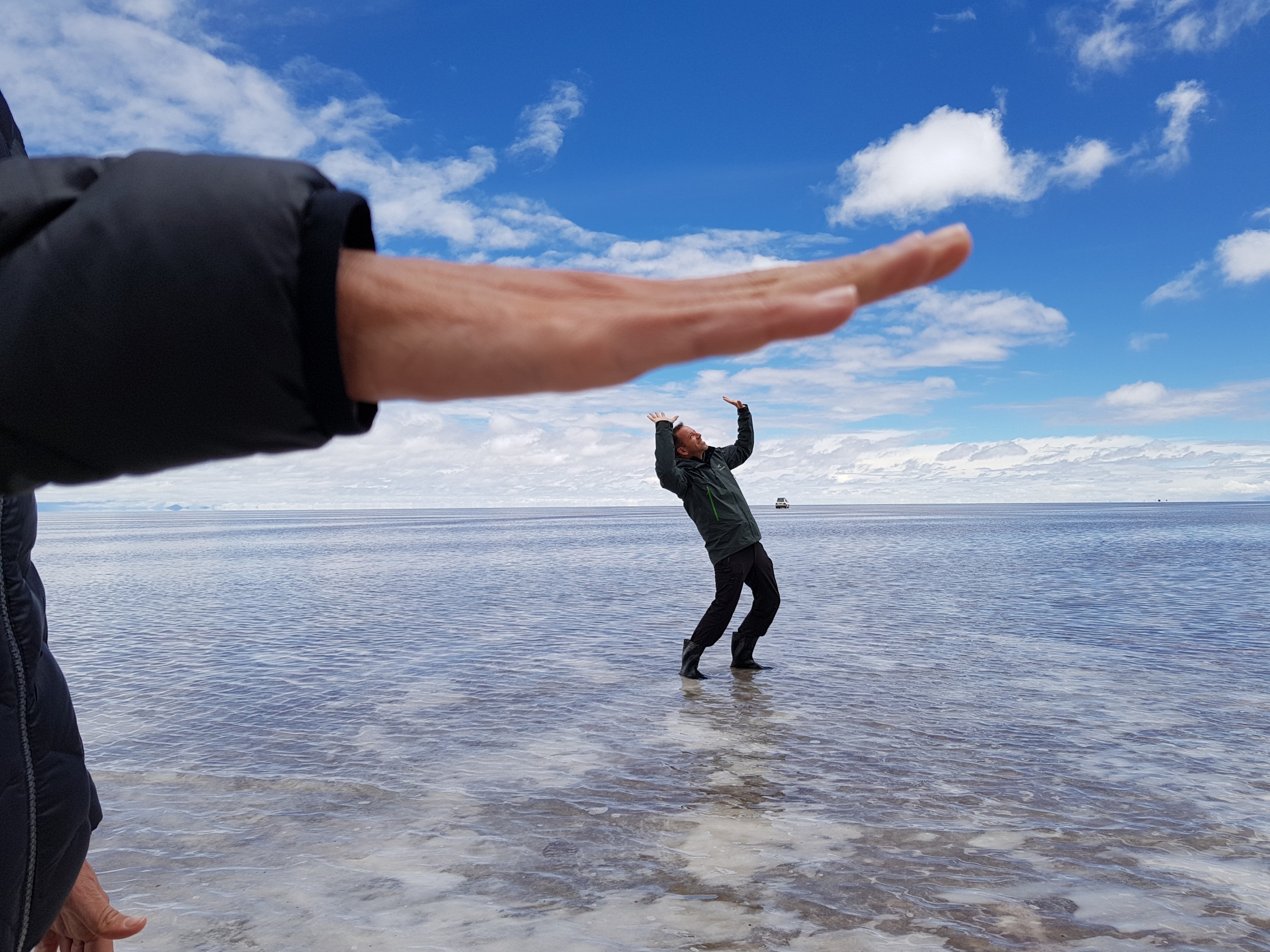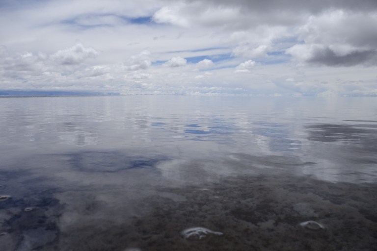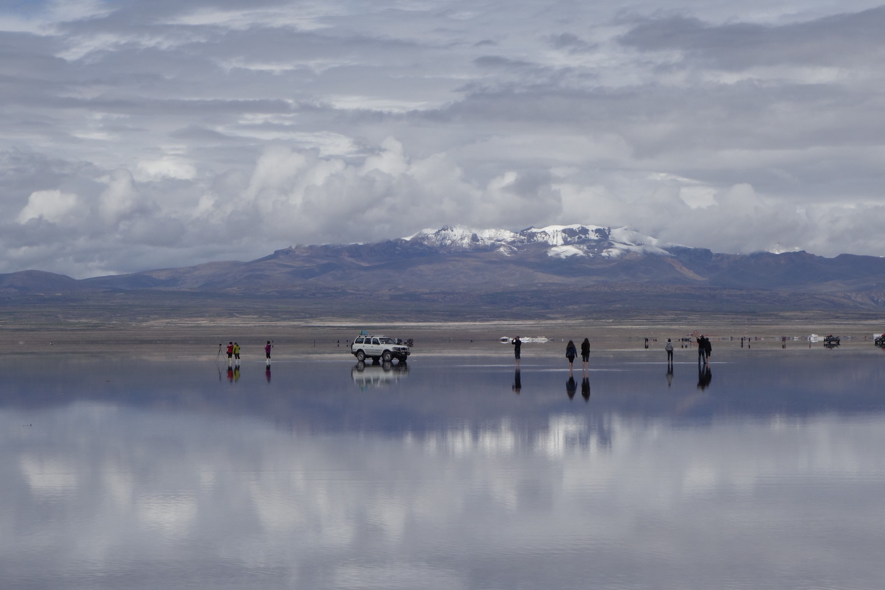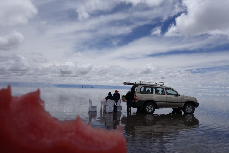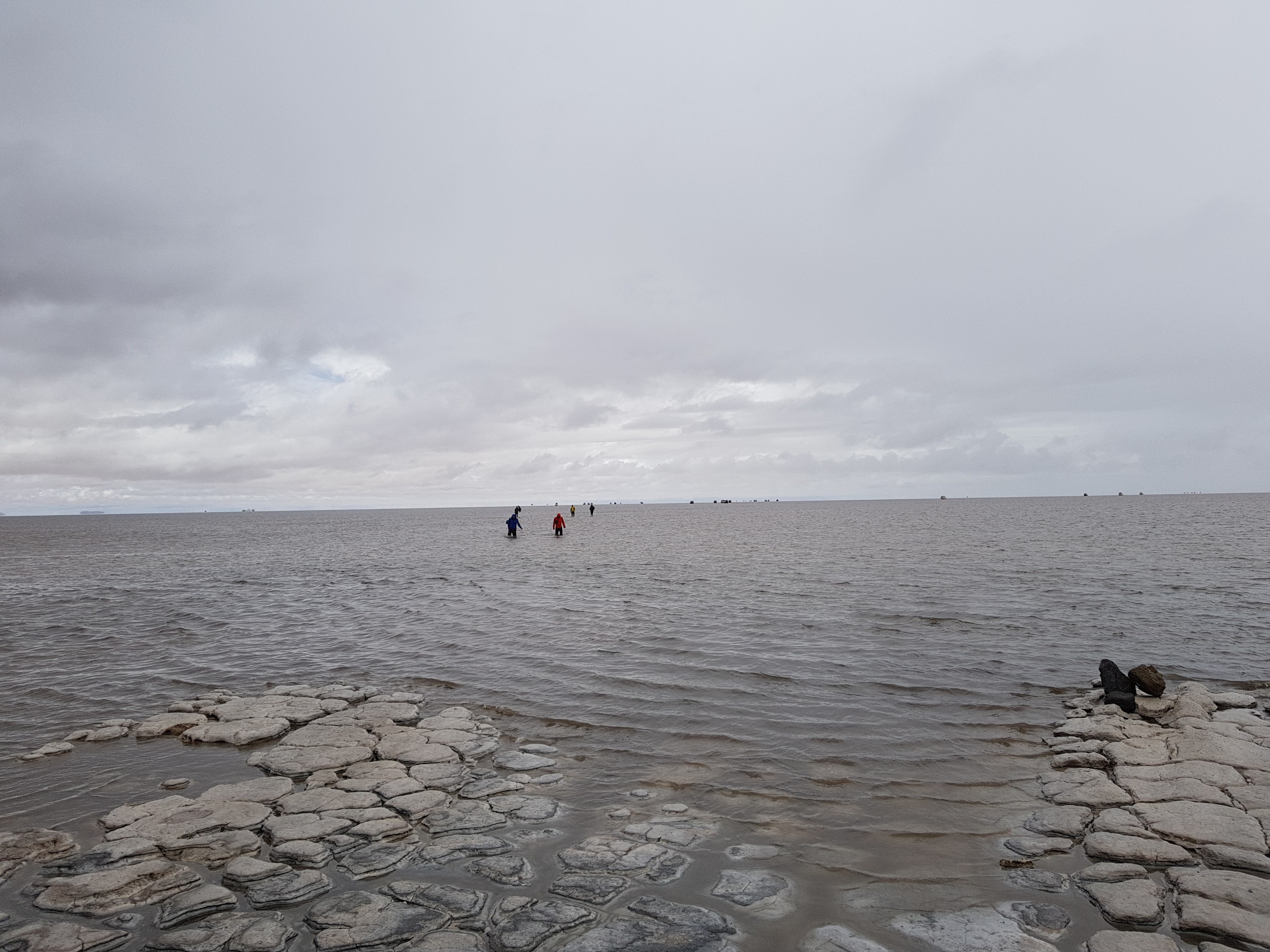 We get back in the car an Chavier drives on into the lake on the salt flats. They all do.