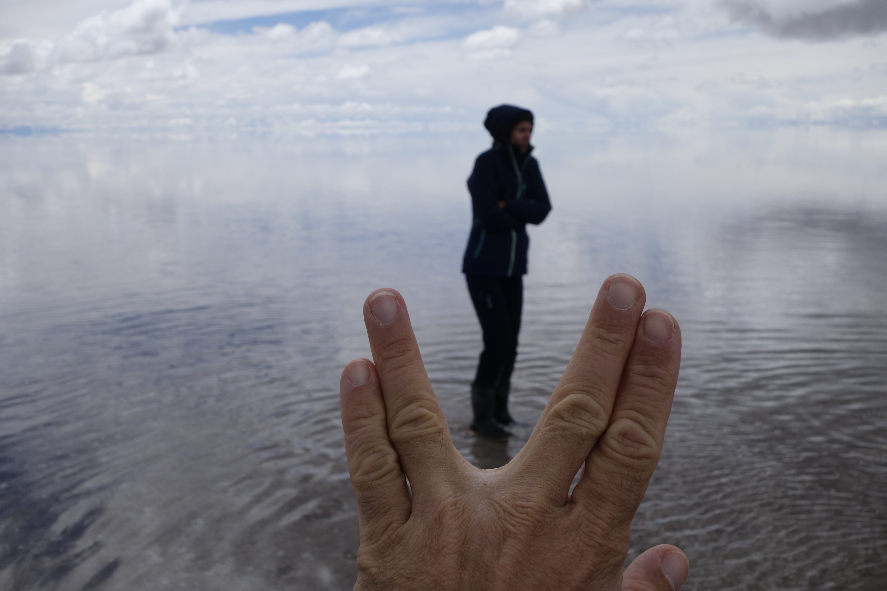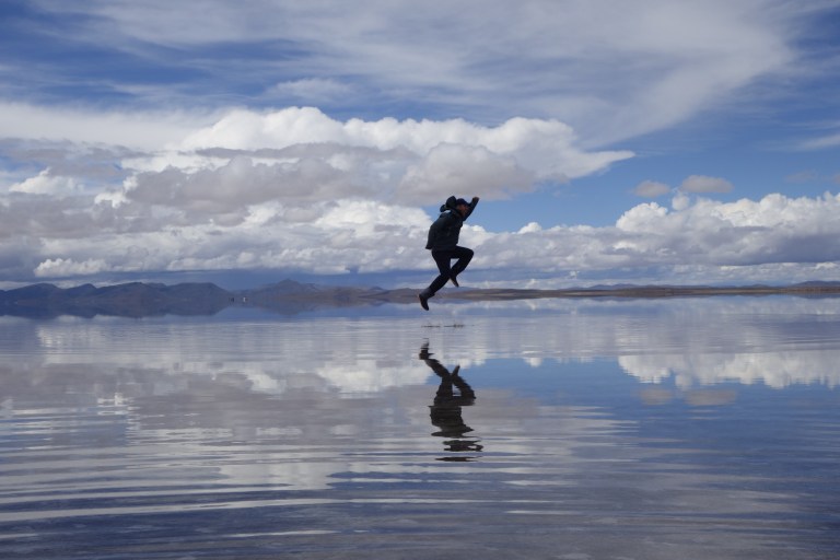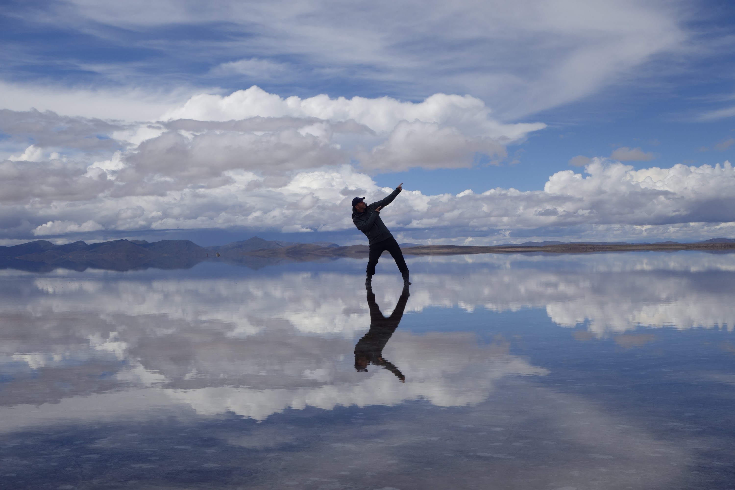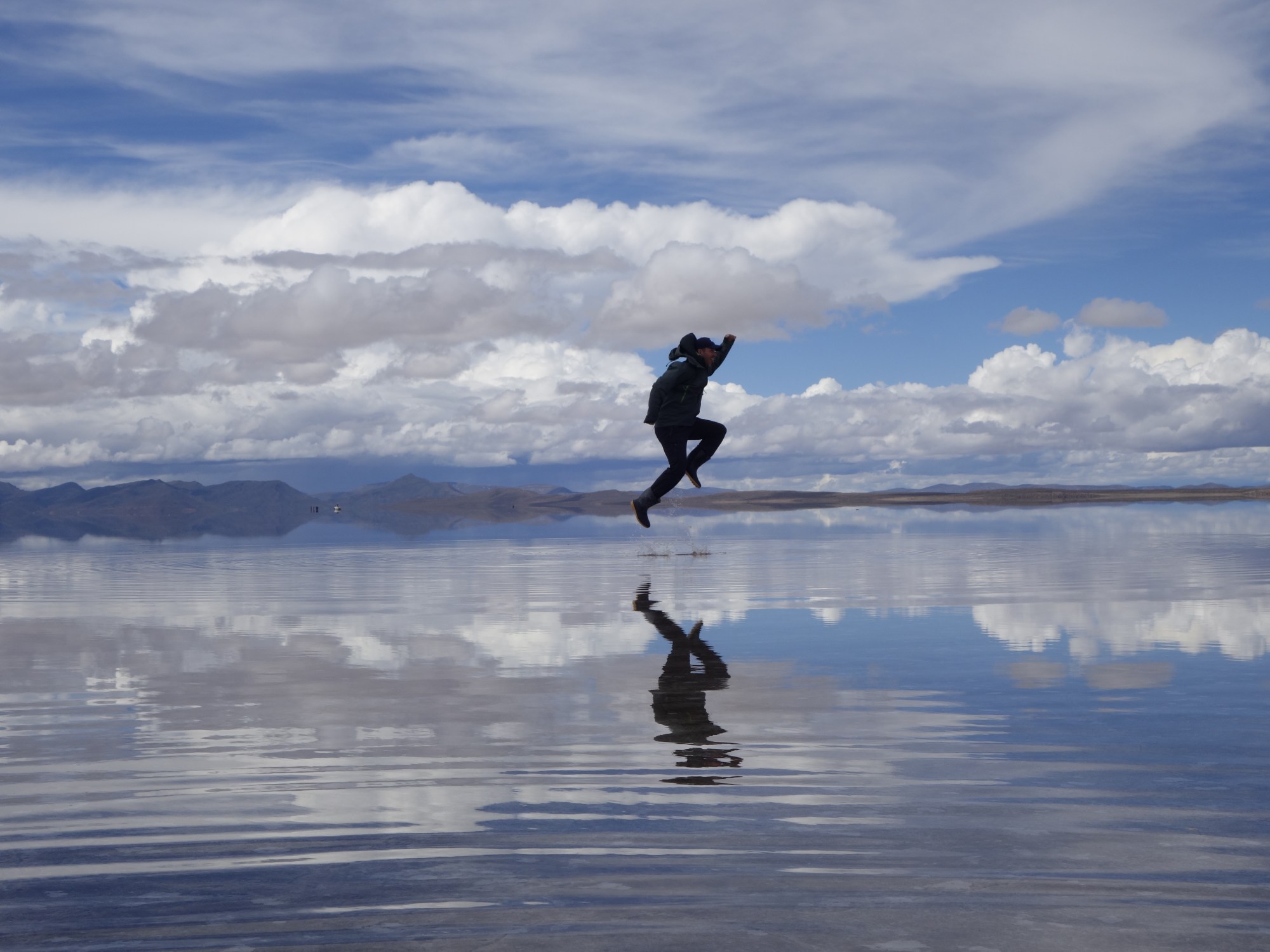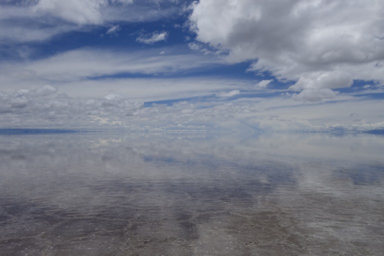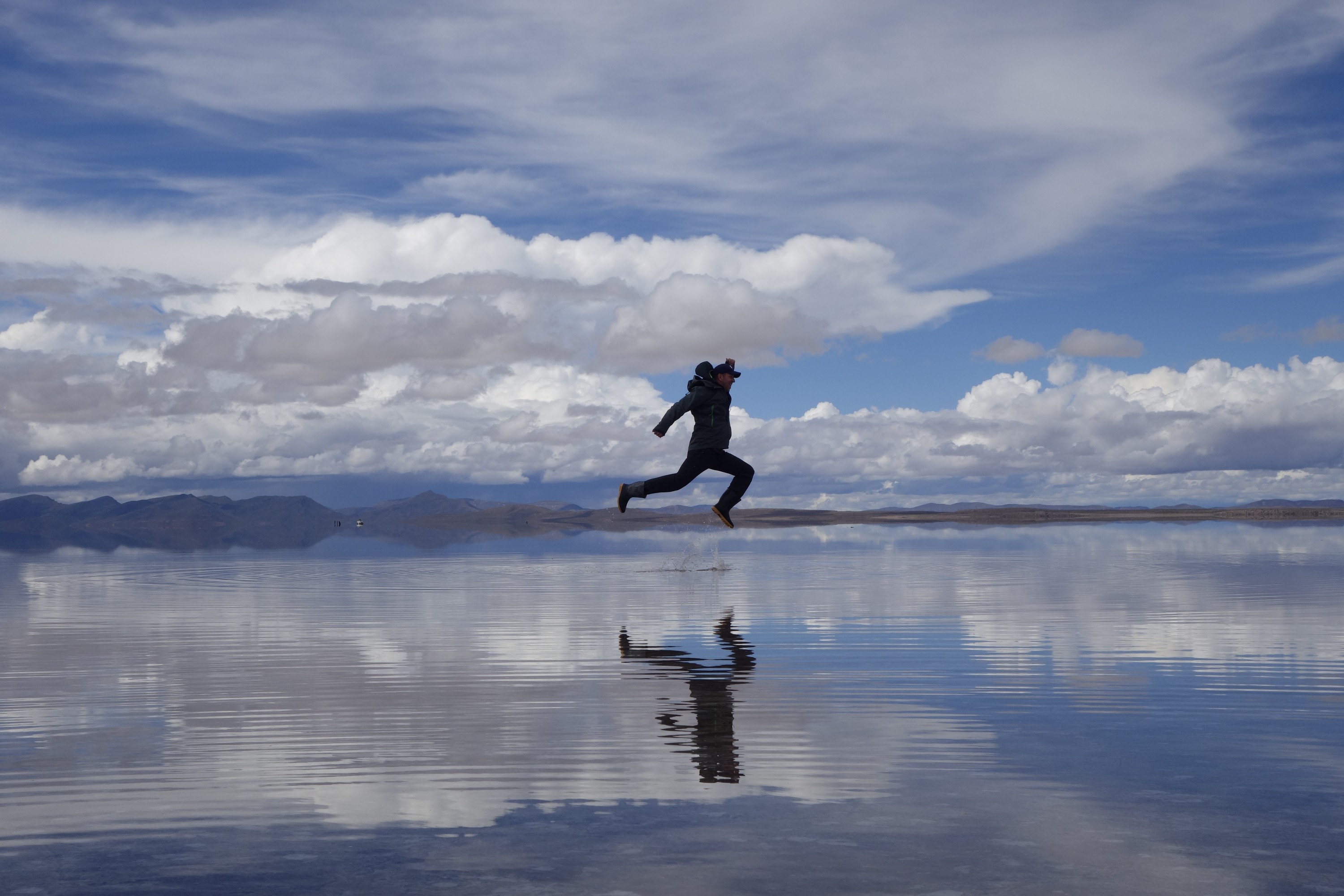 We get back in the car an Chavier drives on into the lake on the salt flats. They all do.