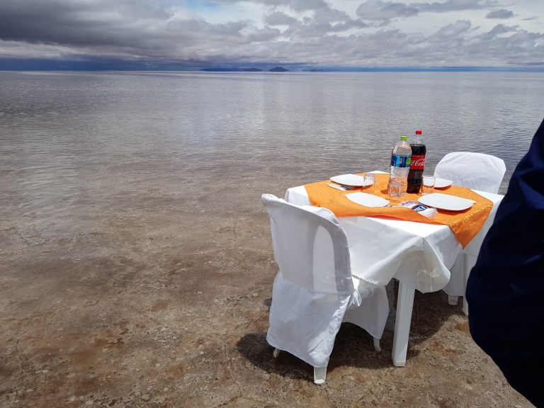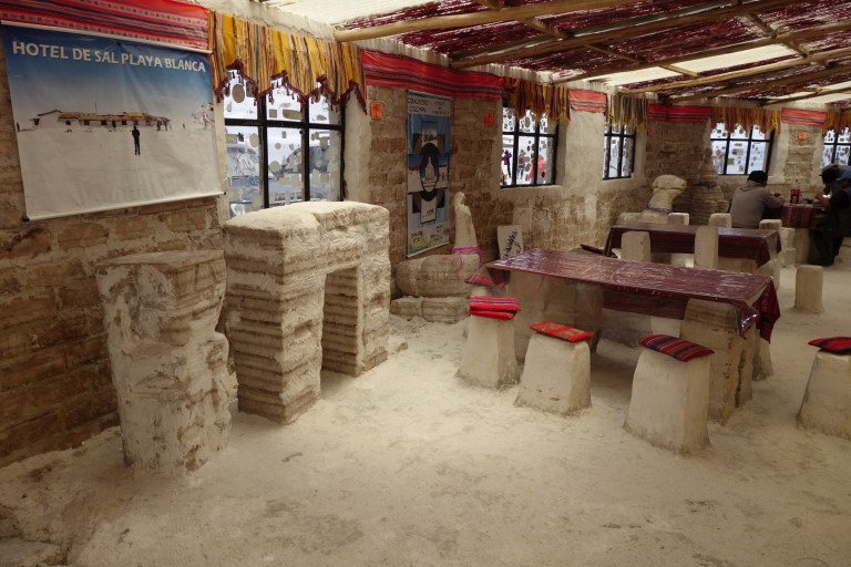 We go to the first salt hotel inside the lake which is closed as a hotel but open as a restaurant. Its very basic, completely out of salt, 5 bolivianos for toilet (as always here).