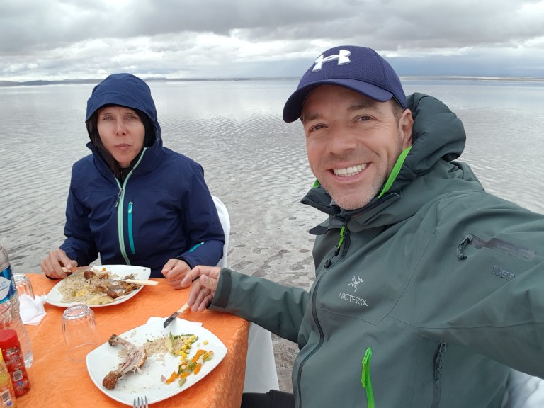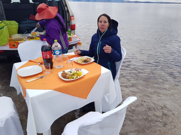 We sleep long. We agreed with Elia and Chavier to be picked up at the hotel at 10:30 am. Chavier lives in Uyuni, so he can have breakfast with family. Elia meets her husband there. Tonight she will go home with him to La Paz with the night bus.