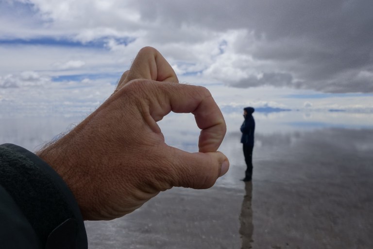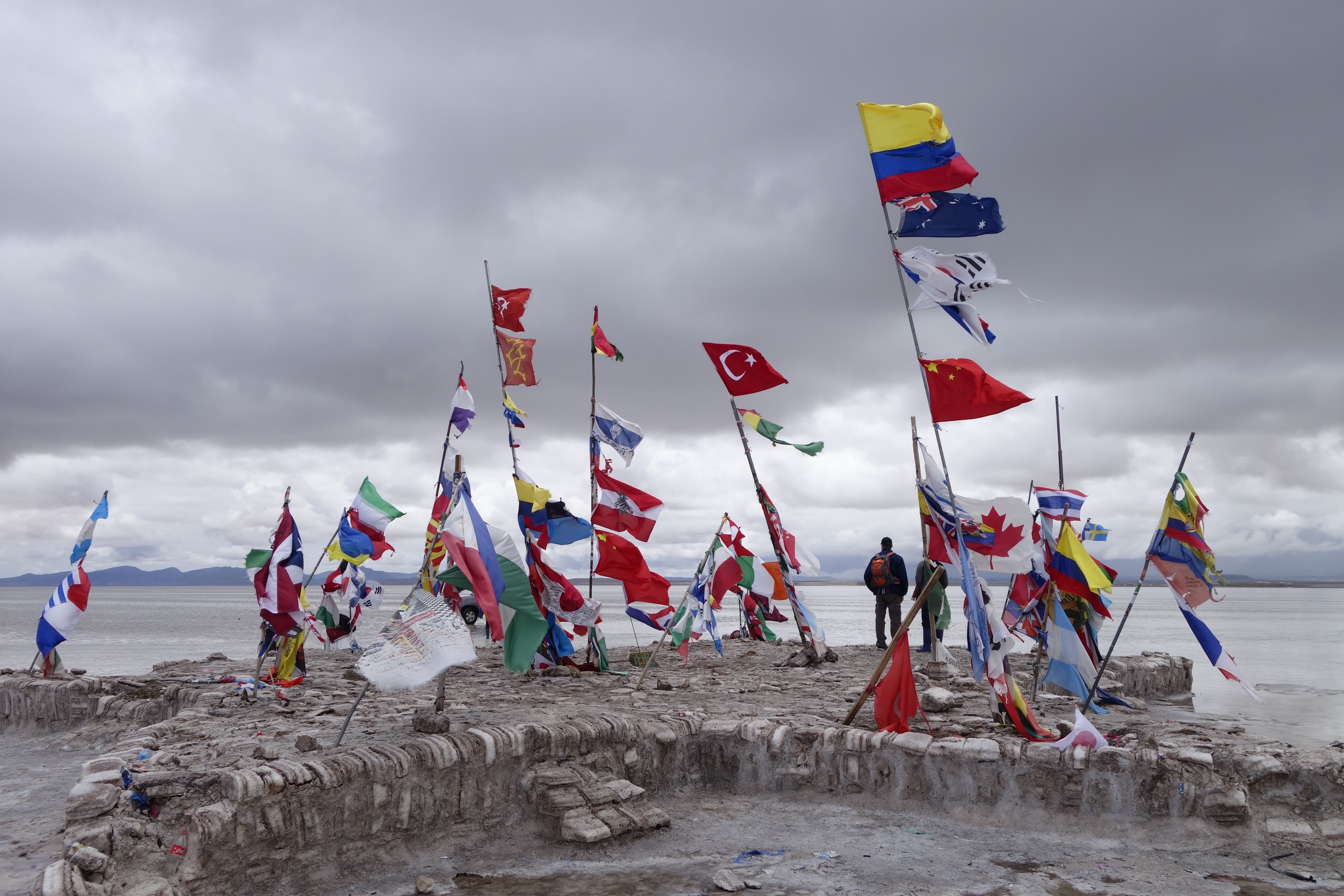 Off we go to the Uyuni salt flats. We stop at a village on the entrace path and buy a salt magnet for our fridge there. We visit a family and watch how they produce salt. Actually they get it, mill it, add jodium, put it in a 250g or 1 kg plastic bag and close it by melting the top on open fire from a propane gas bottle. Then they sell it for 1/8 eur per 250 grms. We buy a packet and write into his guestbook (obligatory) and continue our drive.