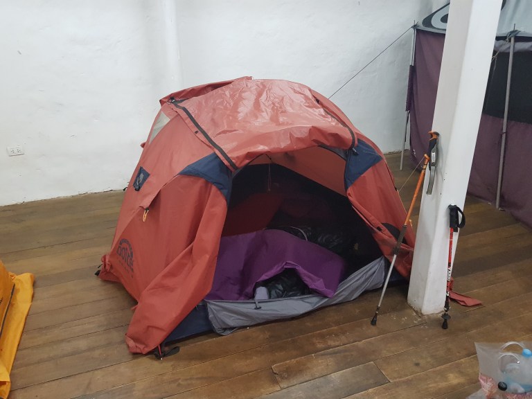 He shows us the tents, the porters will carry for us (two men tents). They will also build them up and tear them down each day. We get the opportunity to rent sleeping bags, extra matresses (standard is just a sheet of paper) and hiking poles. We donot take the poles. They charge us 45 PEN for each (matress, bag), we pay 180 PEN in total. Tents and sleeping bags are fine quality, you donot get a pillow and the sleeping bag has nothing like that included (good luck, we have our own).