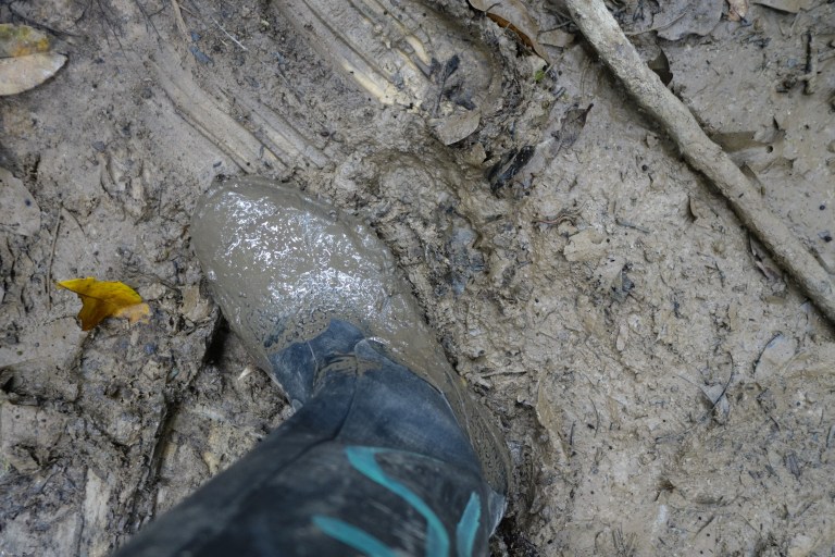 We have to walk a very muddy trail to the lake …