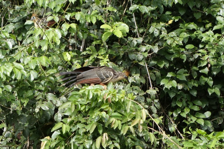 “Hike to Lake Condenado. After an early breakfast you and your nature guide will board the motorized canoe once again for the short journey to the trail head to begin a morning’s exploration by foot and paddle canoe of the lake system of Condenado, rich in bird and aquatic life. A family of Giant Otters lives in the vicinity of the lake and are often observed. Birds abound especially Rufescent Tiger-herons, Great Egrets, Wattled Jacanas, Hoatzin, the noisy Donacobius and many others. Remember to bring your hat and sun cream for there is no shade out on the water. You will return to the lodge in time for lunch. The afternoon is for exploring the forest close to the lodge (with or without your guide), relaxing and bathing in the Gallucunca, a cool clear stream beside the lodge or visit our tree platforms, going up with ropes and harnesses for a bird’s eye view of the forest and for close-ups of arboreal orchids and the many other species of plants and animals that are never seen near the ground. After dark you will go searching for caiman (alligators) and other nocturnal animals by motorized canoe along the Tambopata River.”