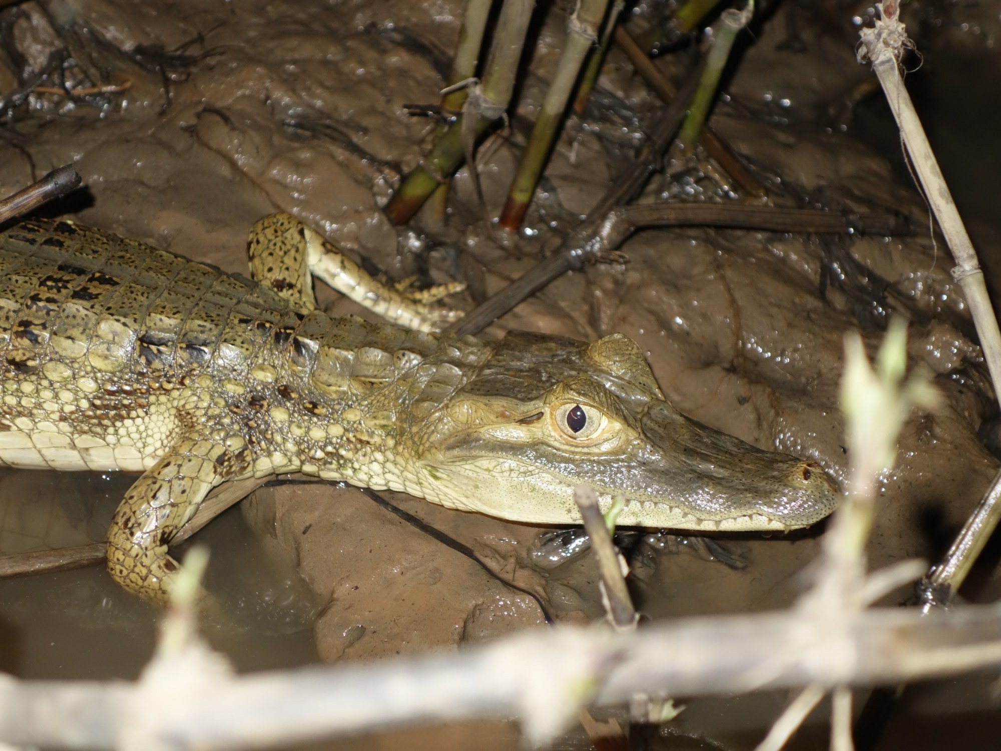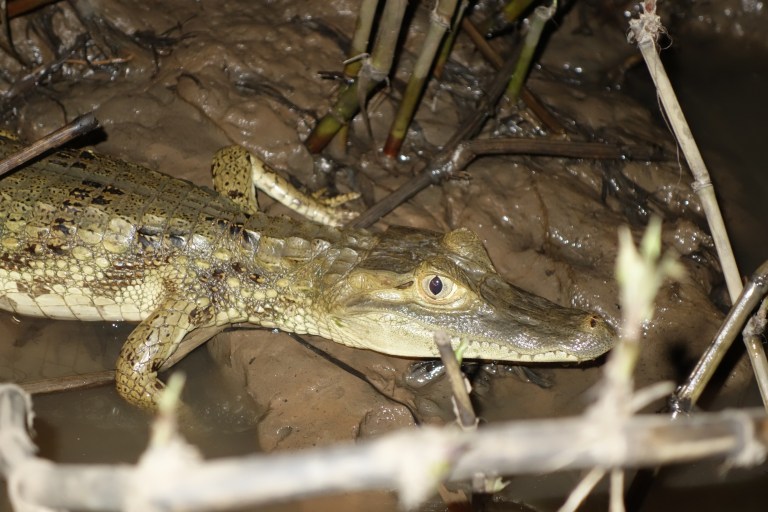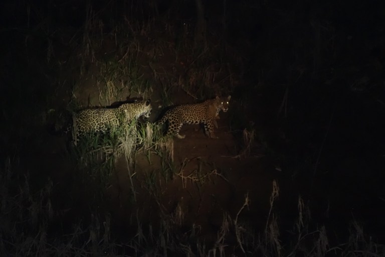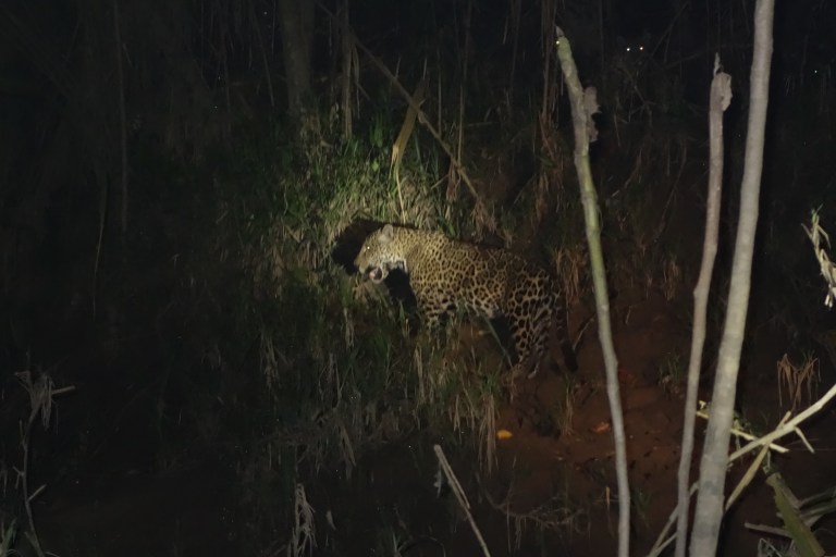 We get ready for dinner. After dinner we will go out with the boat to spot nocturnal animals. Hugo is excited because workers have seen a jaguar and he hopes that it will come out at night to the river bank. Main goal is to see white kaimans. Since there is a chance on a jaguar workers from the lodge and the bar and rsstaurant girls come with us.
