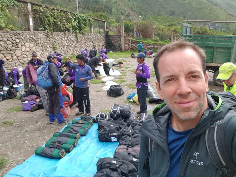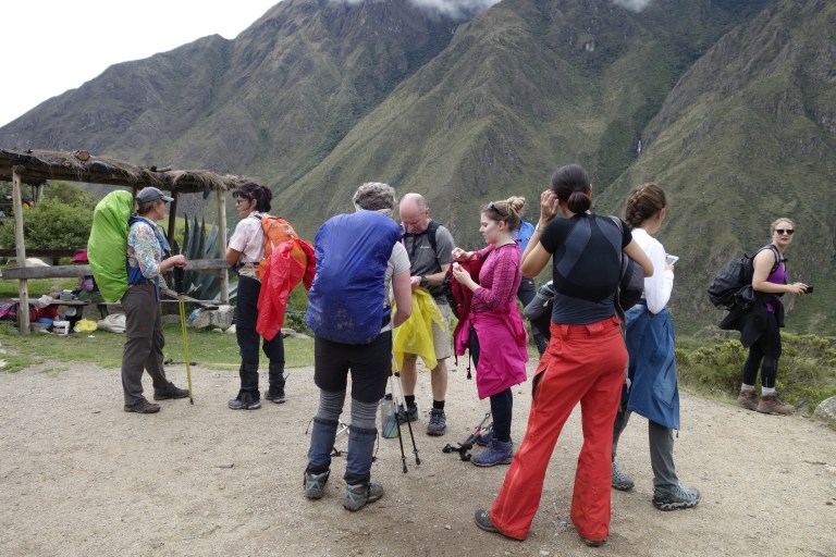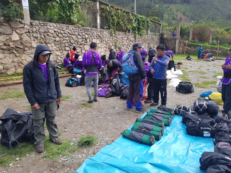 We stop at the parking space at Inka trail entrance. All porters are there. We get a sback package for 4 days, sleeping bags and air matresses. We leave our duffle bags. The porters (22 for 12 guests !) Check the weight of the duffle bags, Pack everything together, waterproof it. We take the day packs and off we go.