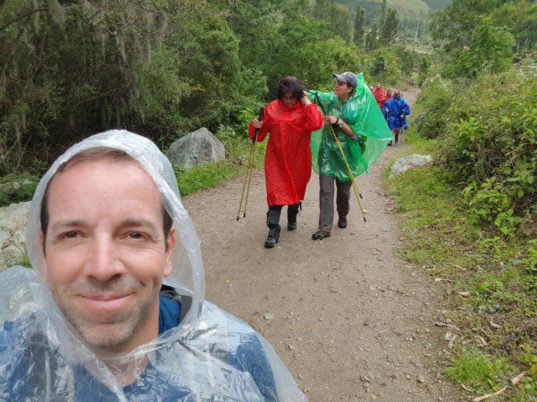 Straight up. We pass villages and houses where womans sell drinks, rain ponchos, bandanas. It is constantly raining, not raining, raining … we get used to poncho on, poncho off.