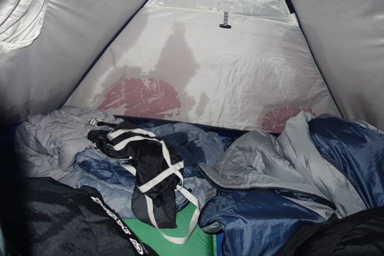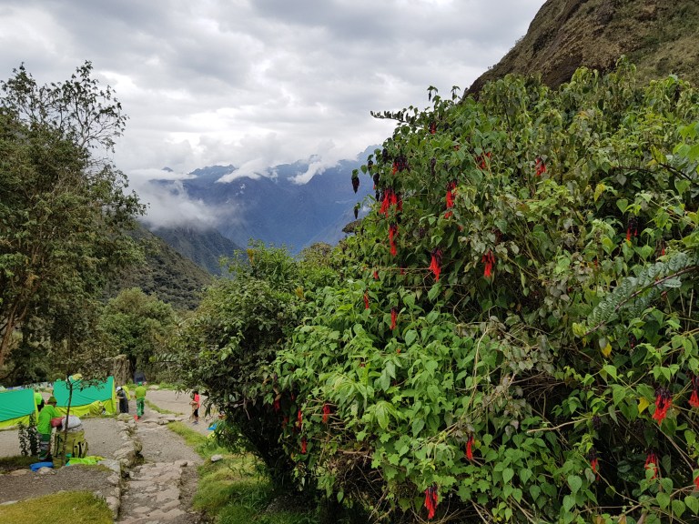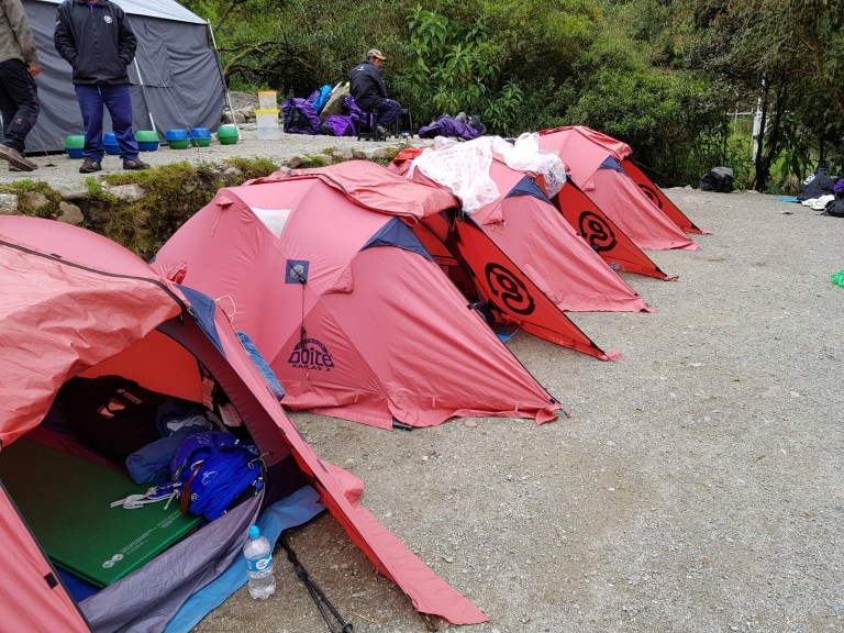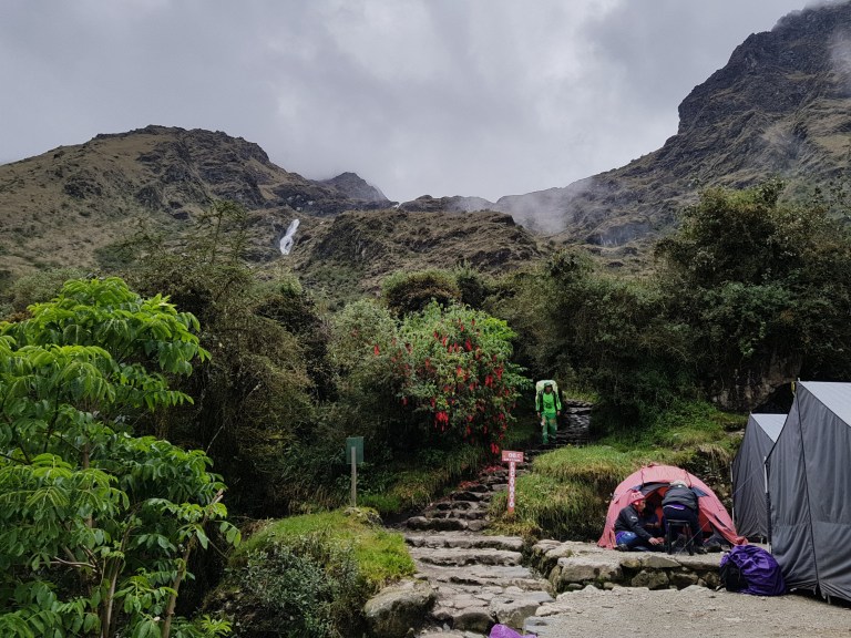 The campsite is private, close to Wayllabamba campsite with a flushing toilet. If only it would flush. Not a hard first day. It is warmer than at the Lares Trek camps in the night and rains a lot. The path to the toilet is suicidal, if wet and dark. The tent is waterproof, but humidity is unstoppable as soon as you open the tent.