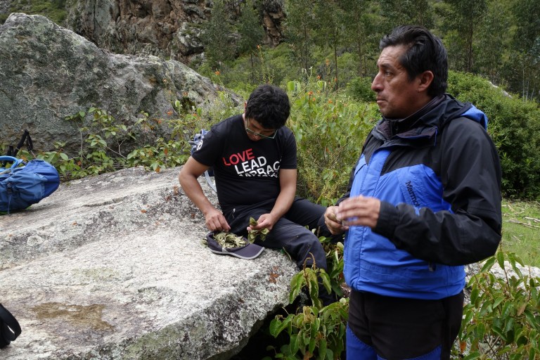 Rohody explains in “his office” on a stone usage of koka leaves, blessings for walk in the moutains and how the inkas walked here.