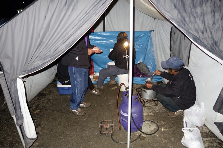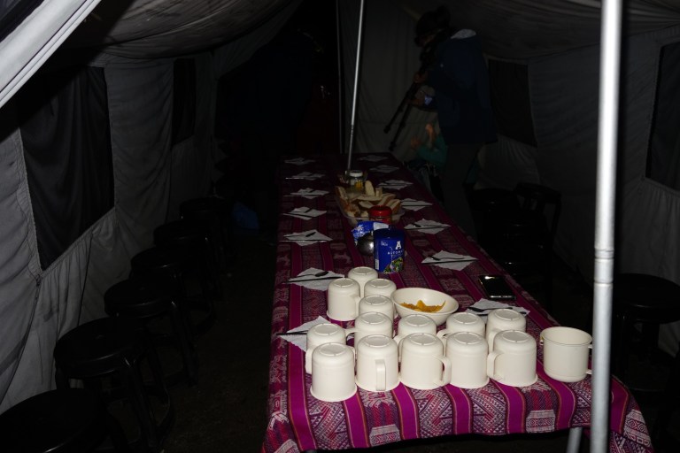 I get up, to the toilets wash myself. Everywhere is luggage not to get wet. The water is icecold. Fine. Back to the tent, complete raingear on. I am ready at 3:50 am. The porters are already breaking down my tent. He, i am still in. I go for breakfast. A lot of headlamps are running around and breaking down the camp in high speed. The porters need to be down at the train station with all the stuff at 5 am, otherwise they walk to Ollantaytambo.