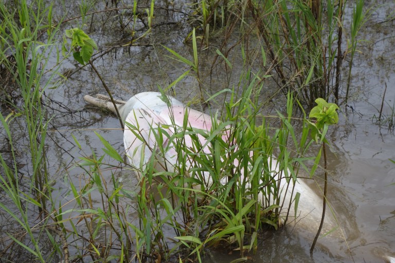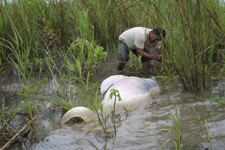 Then Juan Carlos spots a dead pink dolphin. It seems that it died in a fishernet what is considered a cultural crime here. No one is allowed to kill a amazonian dolphin. If you kill a dolphin bad karma will kill a person close to you.