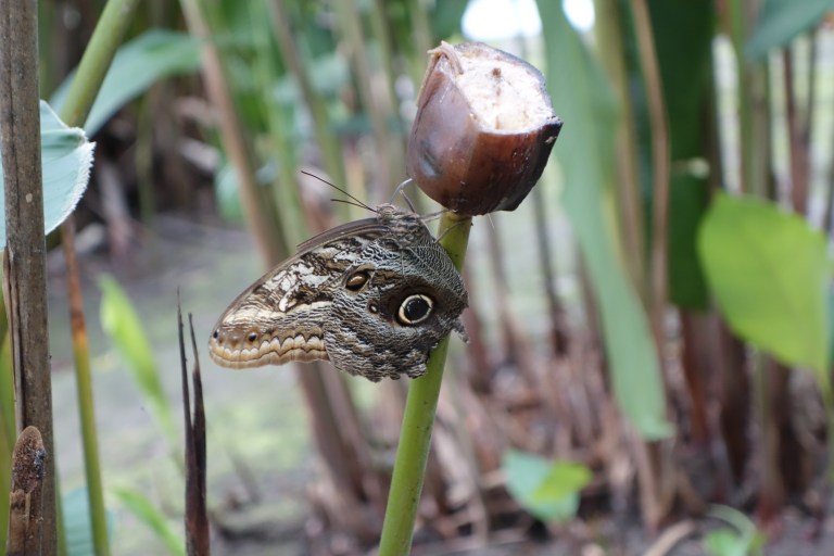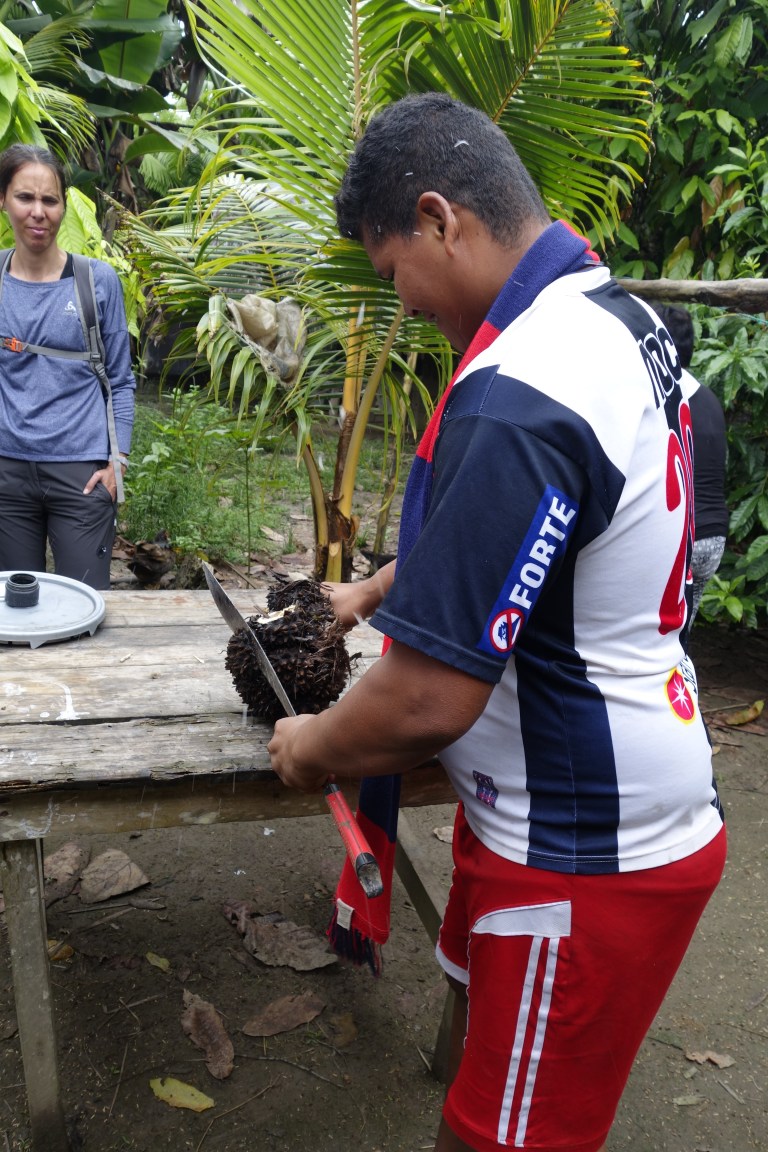 After the butterfly breeding a local farmer shows us different plants they grow. Amongst others they grow the Corozanut, also known as vegan ebony. They dry the semen a carve handicraft. Years ago a lot was sold to Europe a topcarvings of walking sticks.