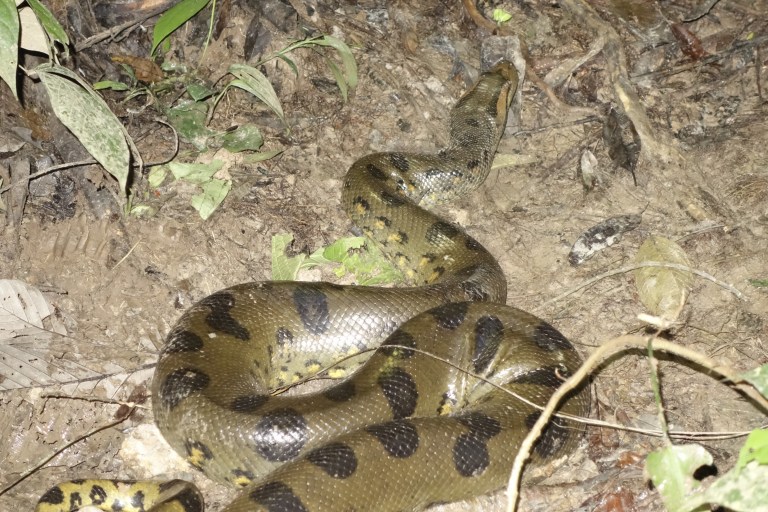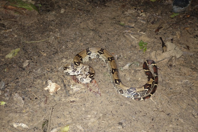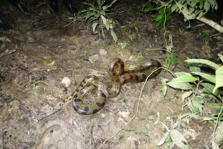 We see anacondas, boa constructor, frogs, scorpions, a tarantula, 1.000 mosquitos and a lot of darkness. JC handles the snakes fearless and with a lot of routine.